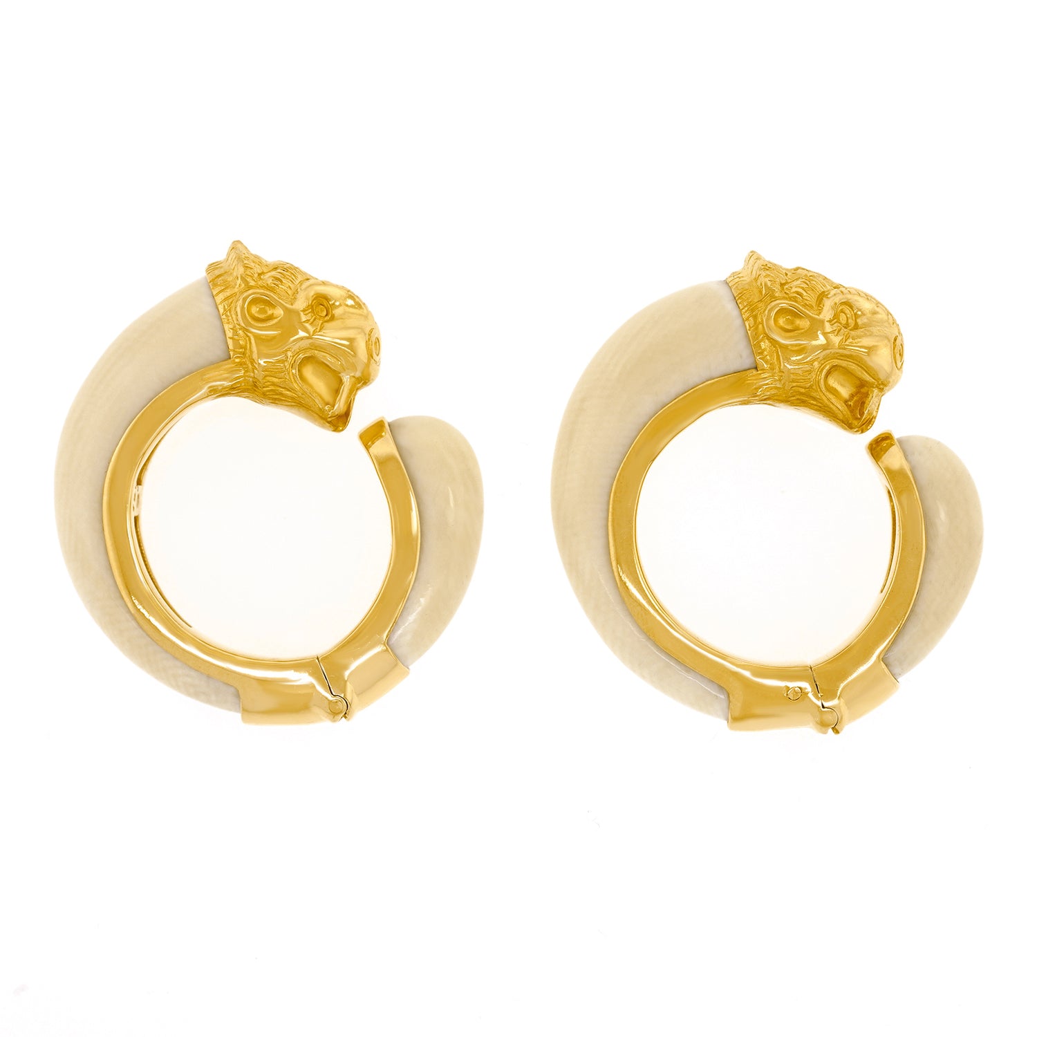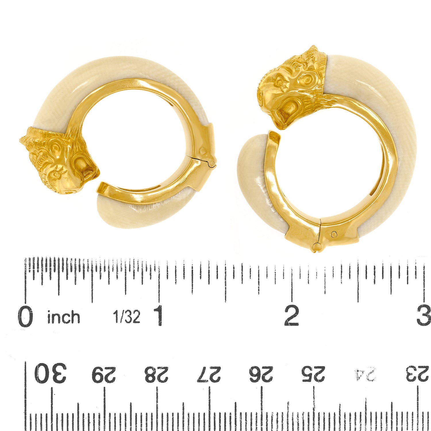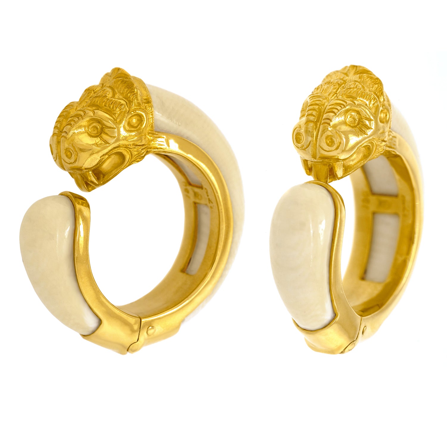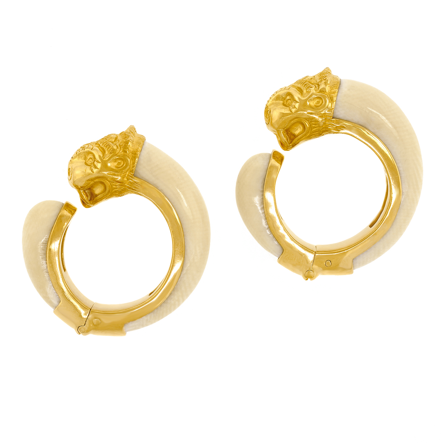 Circa 1960s, 18k, by Ilias Lalaounis, Athens Greece.  The Mycenaean lion's head motif is central to Lalaounis' iconic archeological revival designs. These 18k gold and bone (likely Camel) earrings are particularly striking, well-made examples. Excellent condition.