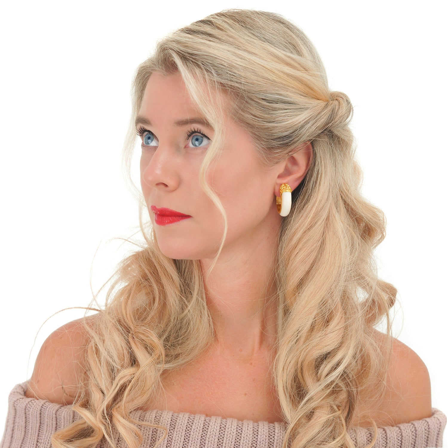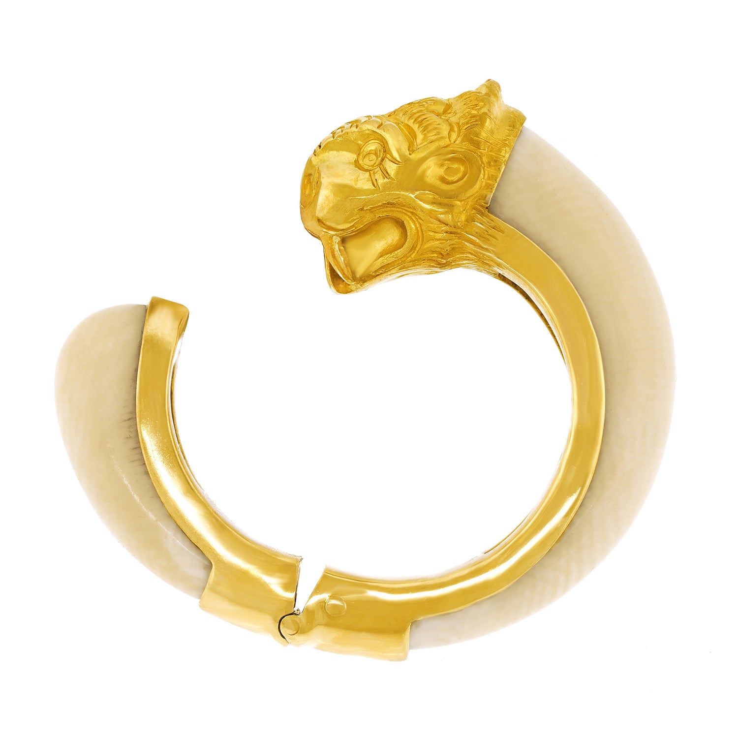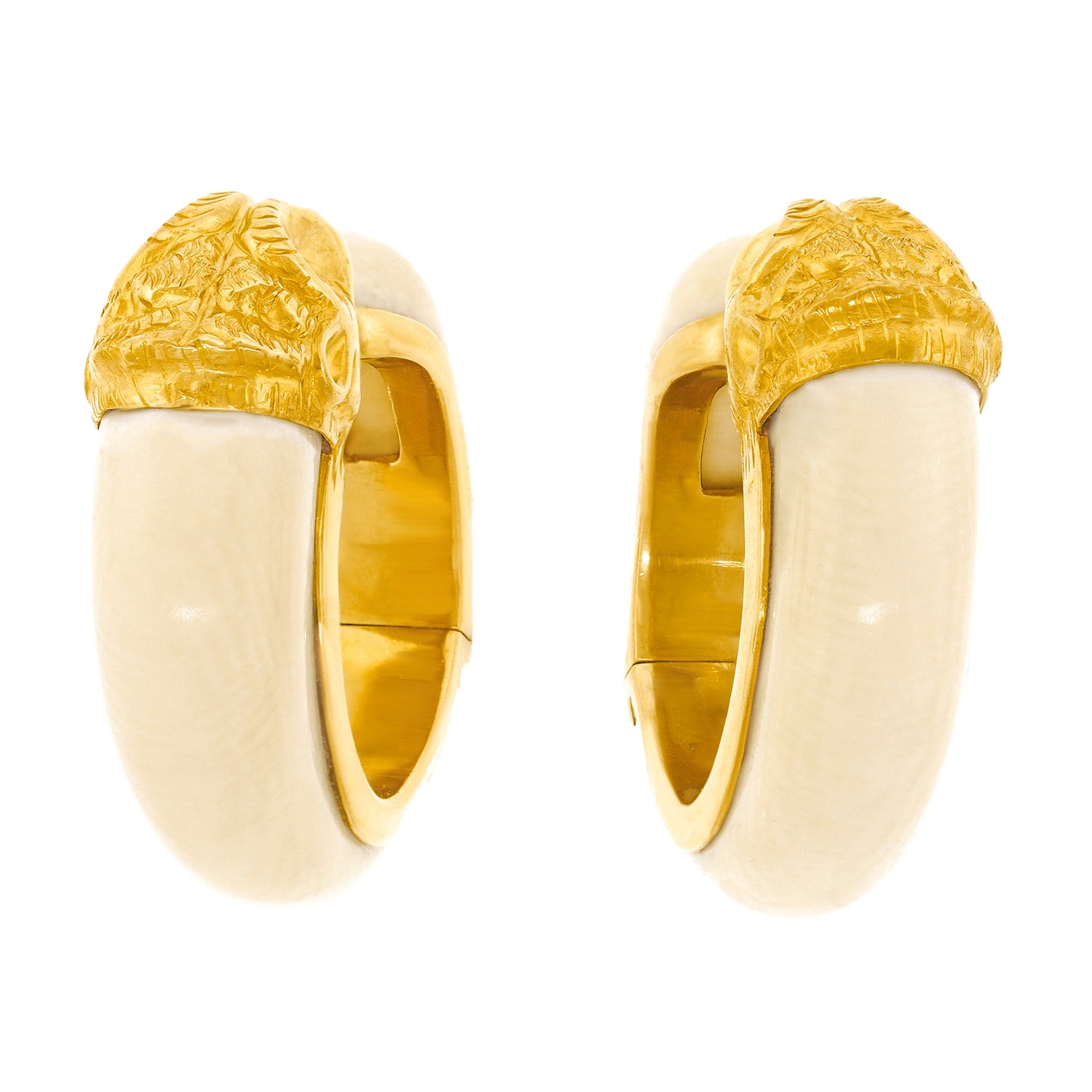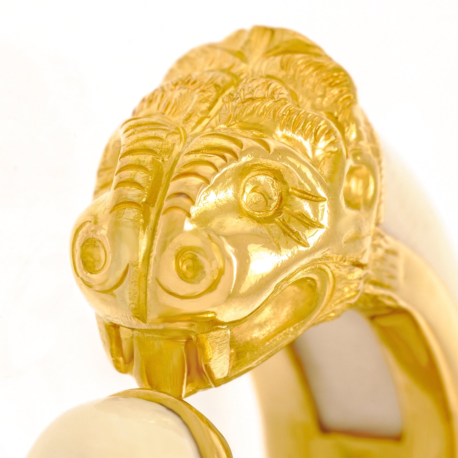 Circa 1960s, 18k, by Ilias Lalaounis, Athens Greece.  The Mycenaean lion's head motif is central to Lalaounis' iconic archeological revival designs. These 18k gold and bone (likely Camel) earrings are particularly striking, well-made examples. Excellent condition.