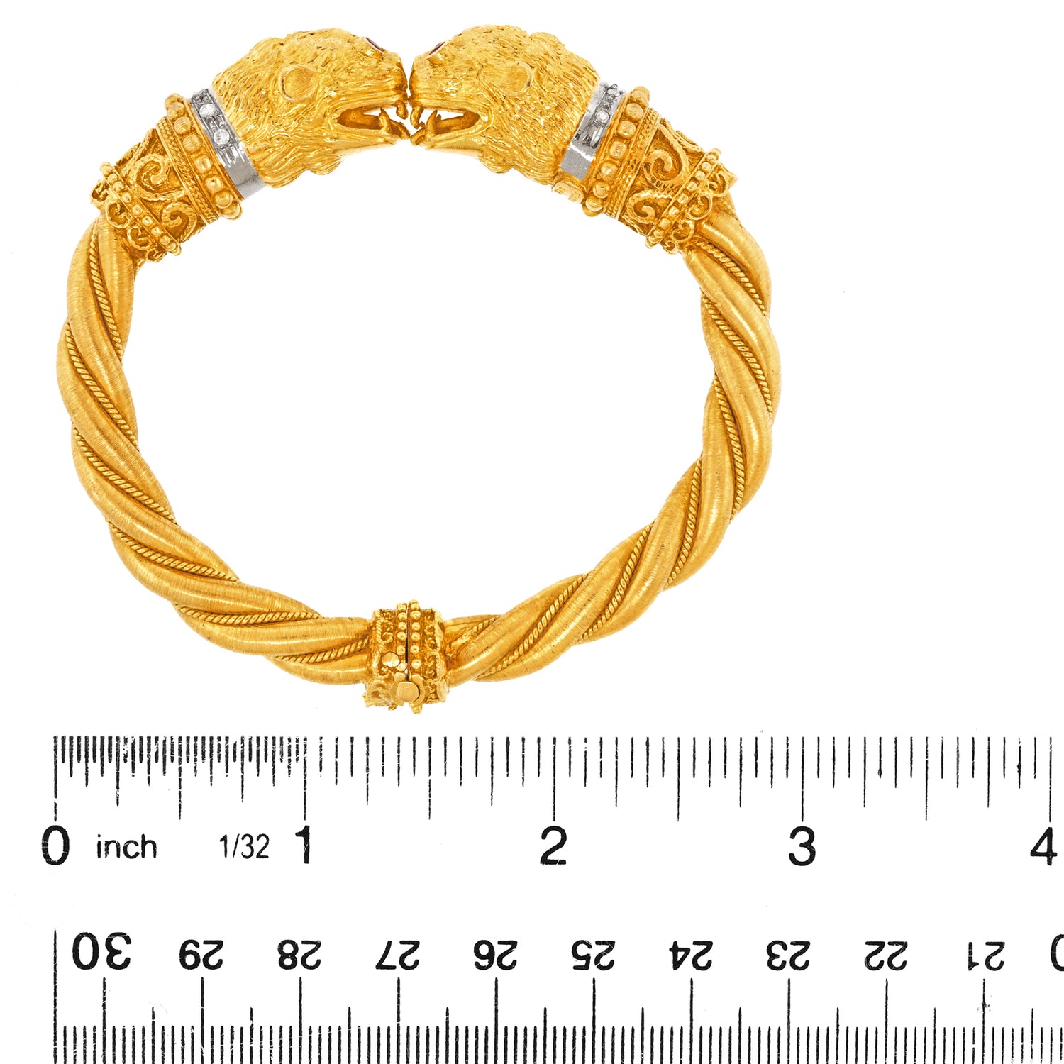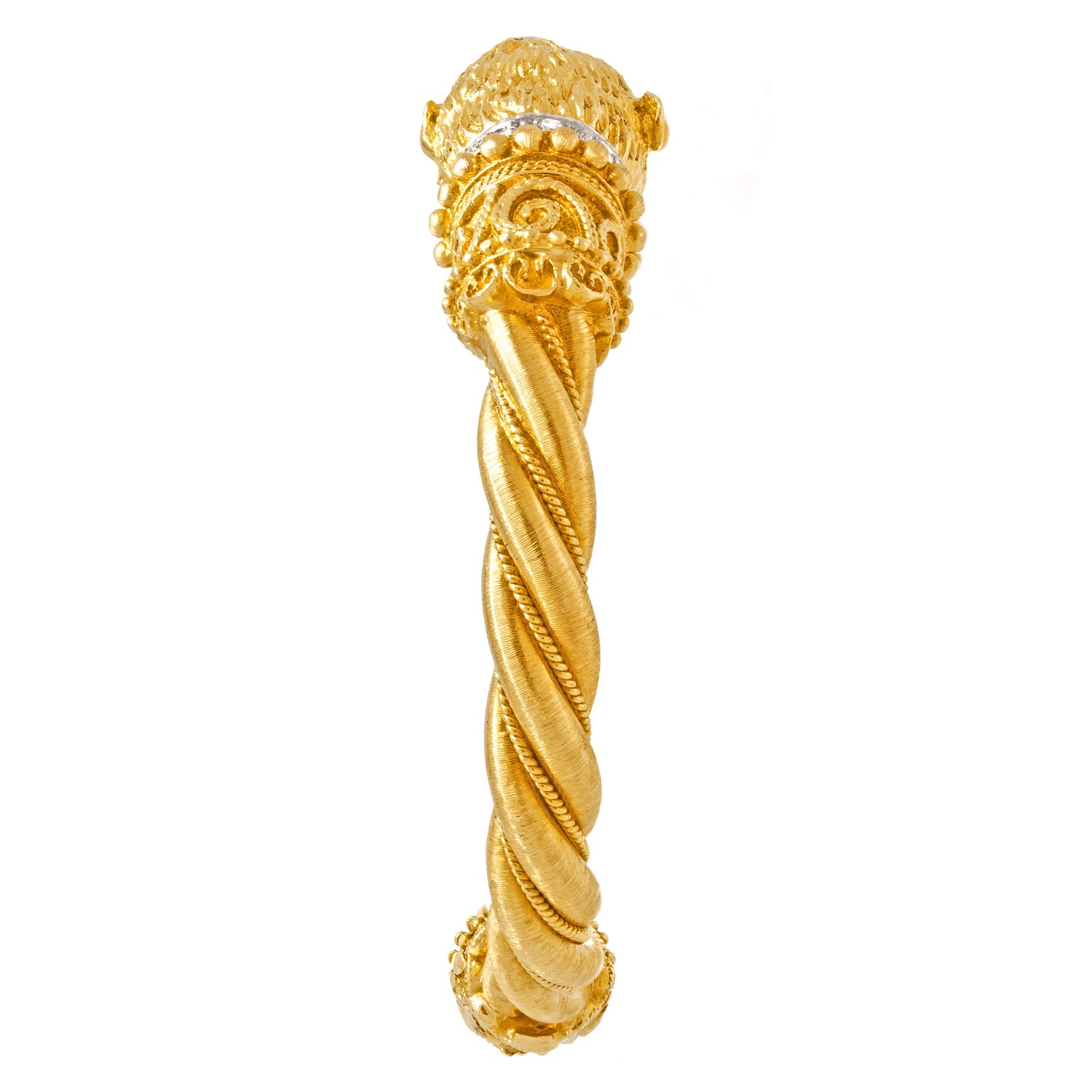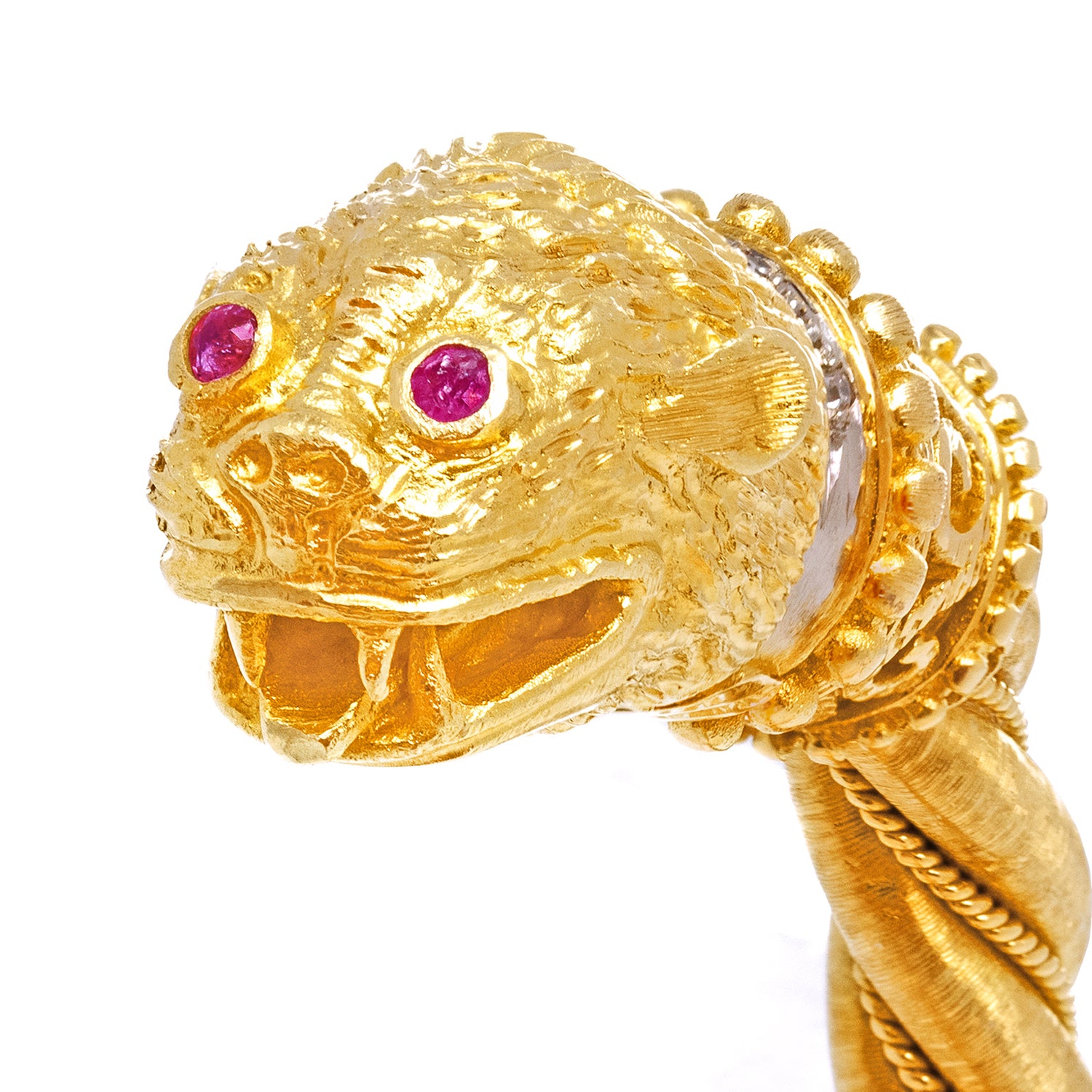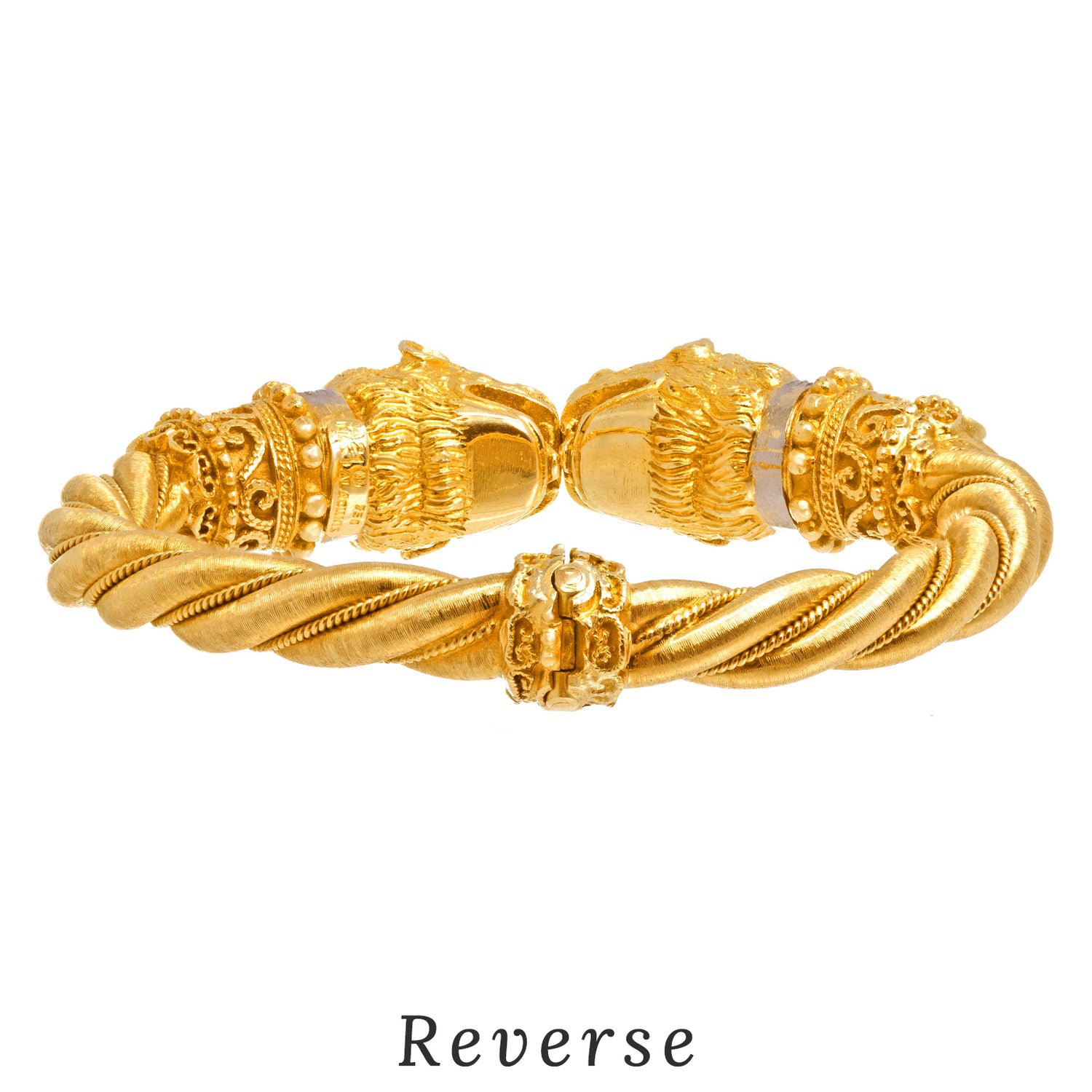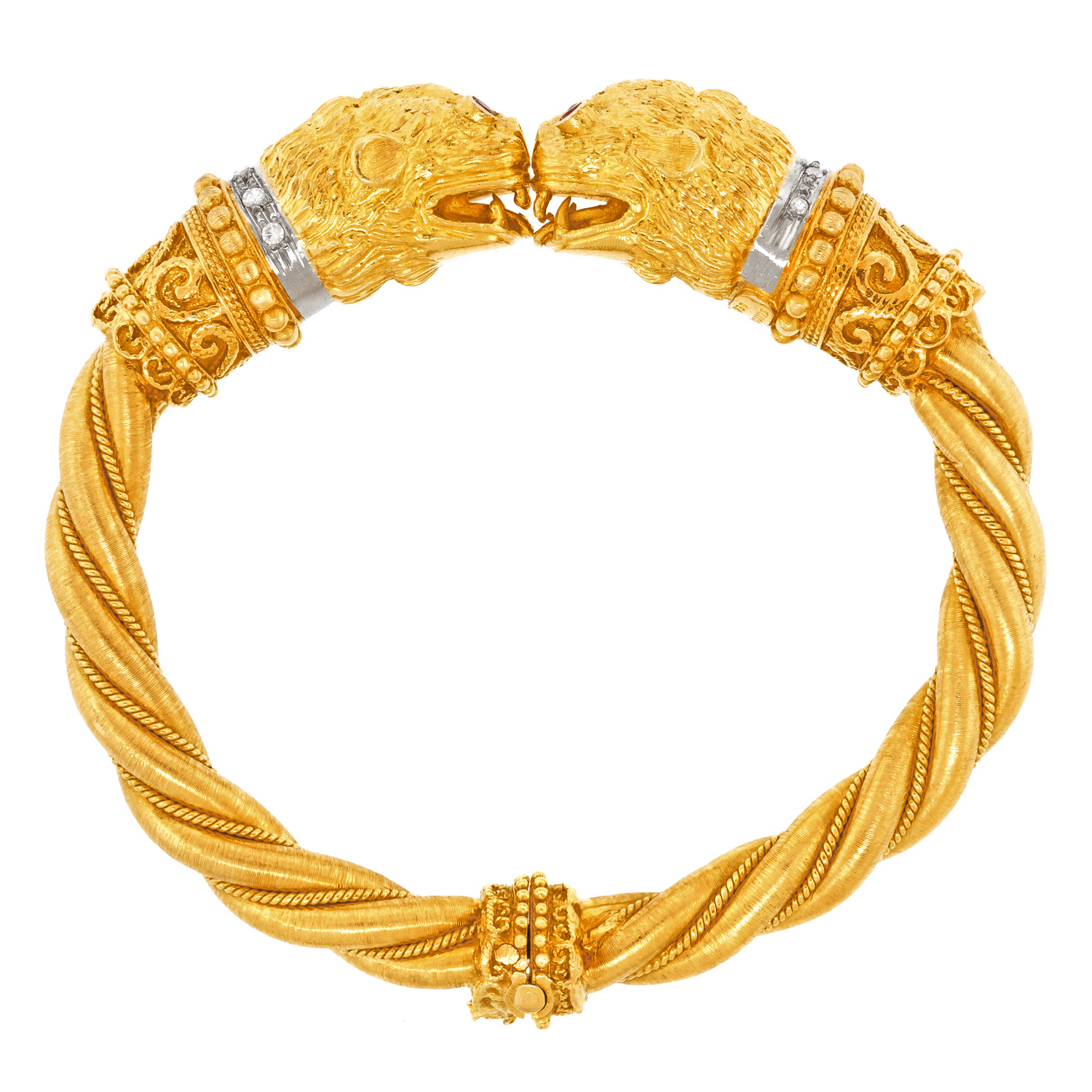 Circa 1970s, 22k, by Ilias Lalaounis, Greece. This Hi-karat gold bracelet is the perfect everyday accessory. The Mycenaean lion's head motif is central to Lalaounis' most famous archeological designs. Beautifully well-made, it is in excellent condition.