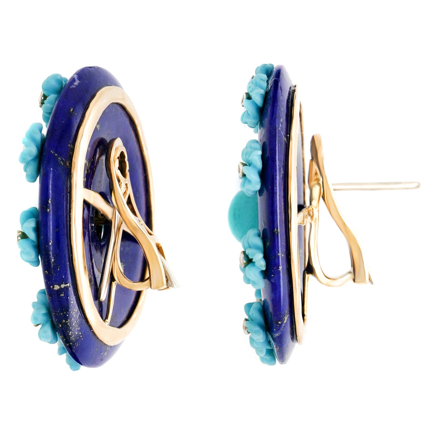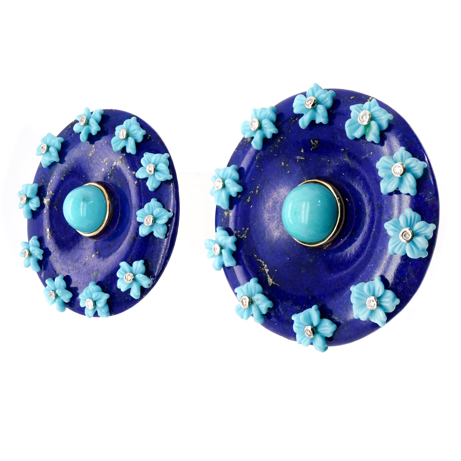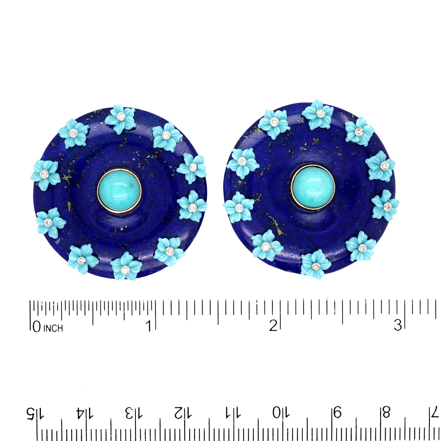 Circa 1980s, 18k, Switzerland. These striking one-of-a-kind blue-on-blue earrings are a visual delight! Their lush gold-flecked lapis is strewn with charming diamond-set turquoise flowers. Summer style doesn't get any better than this! Finely handmade in 18k yellow gold. Excellent condition.