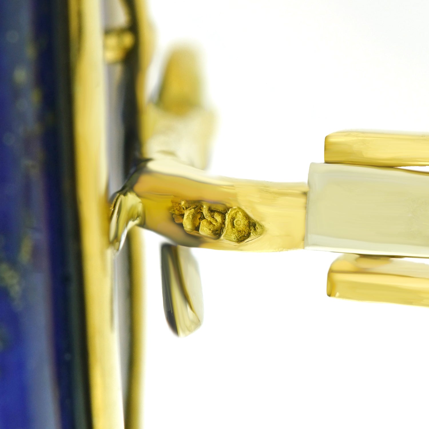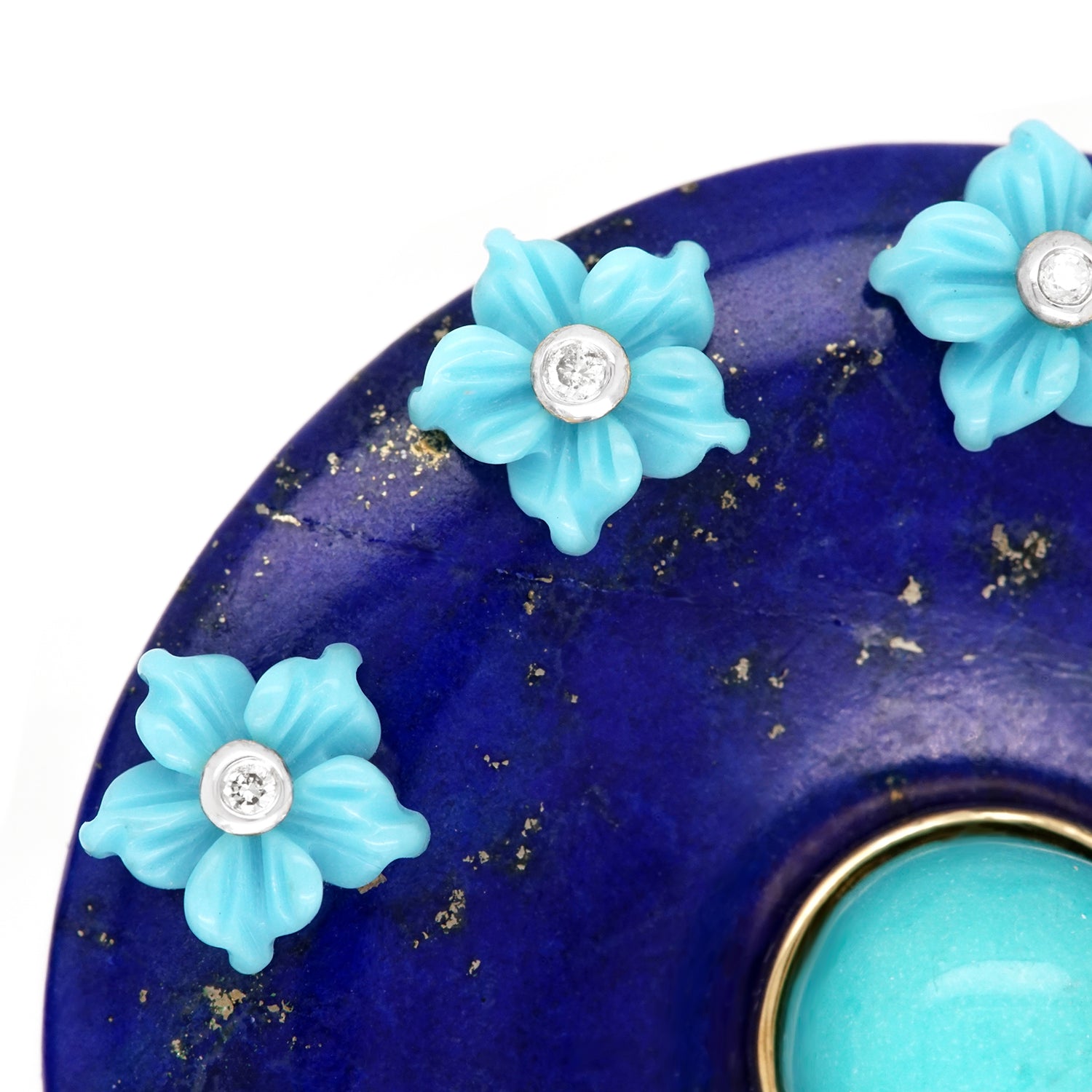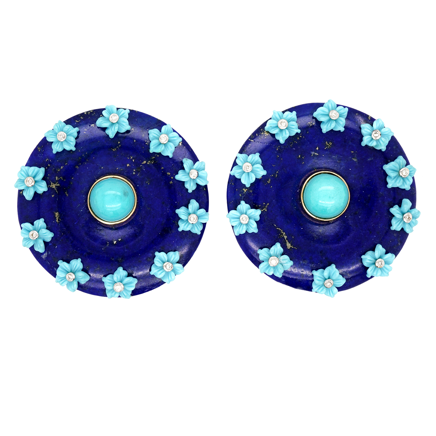 Circa 1980s, 18k, Switzerland. These striking one-of-a-kind blue-on-blue earrings are a visual delight! Their lush gold-flecked lapis is strewn with charming diamond-set turquoise flowers. Summer style doesn't get any better than this! Finely handmade in 18k yellow gold. Excellent condition.
