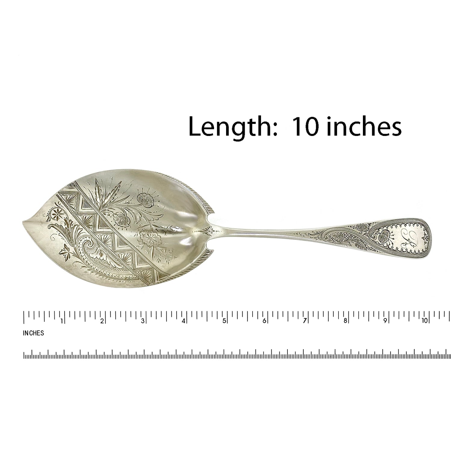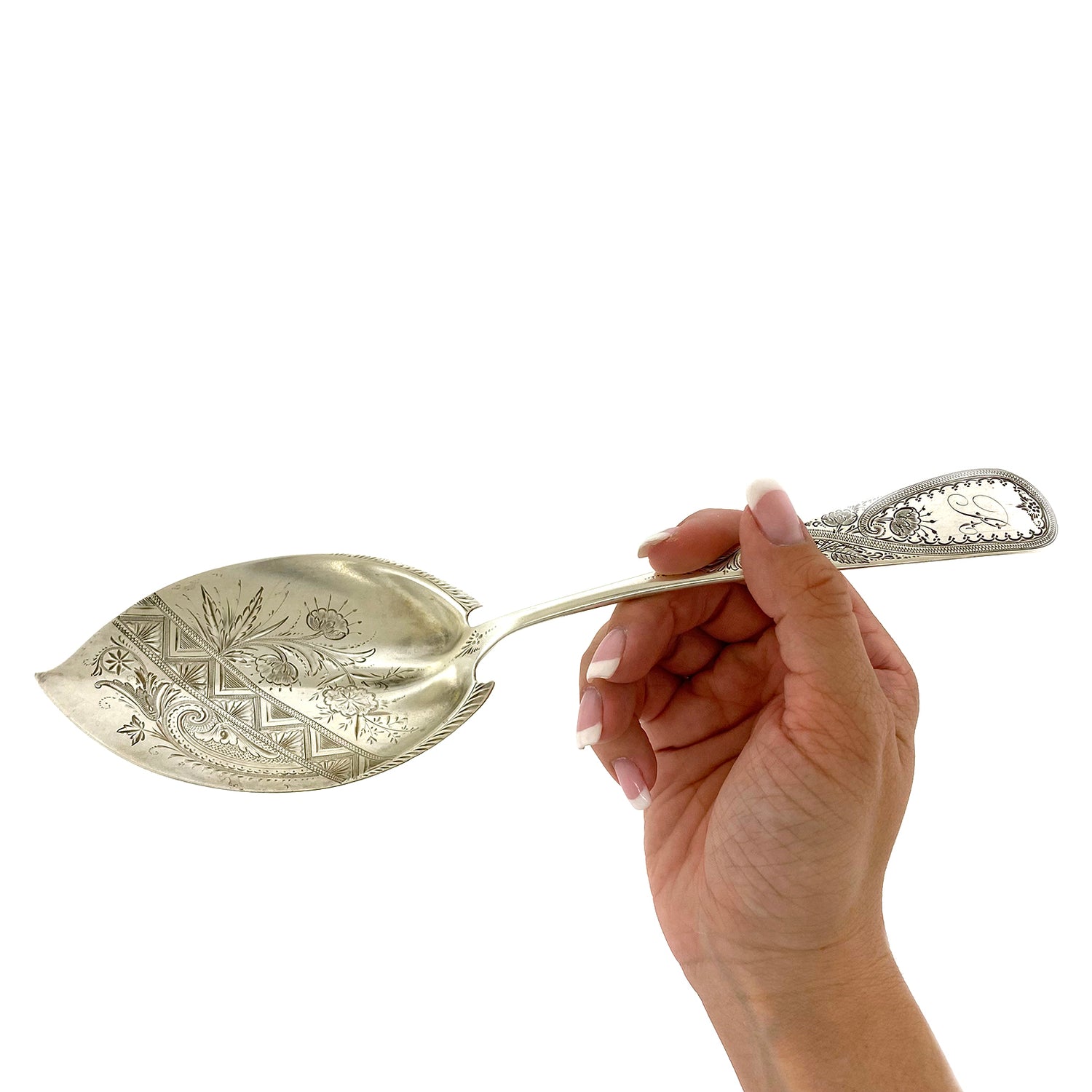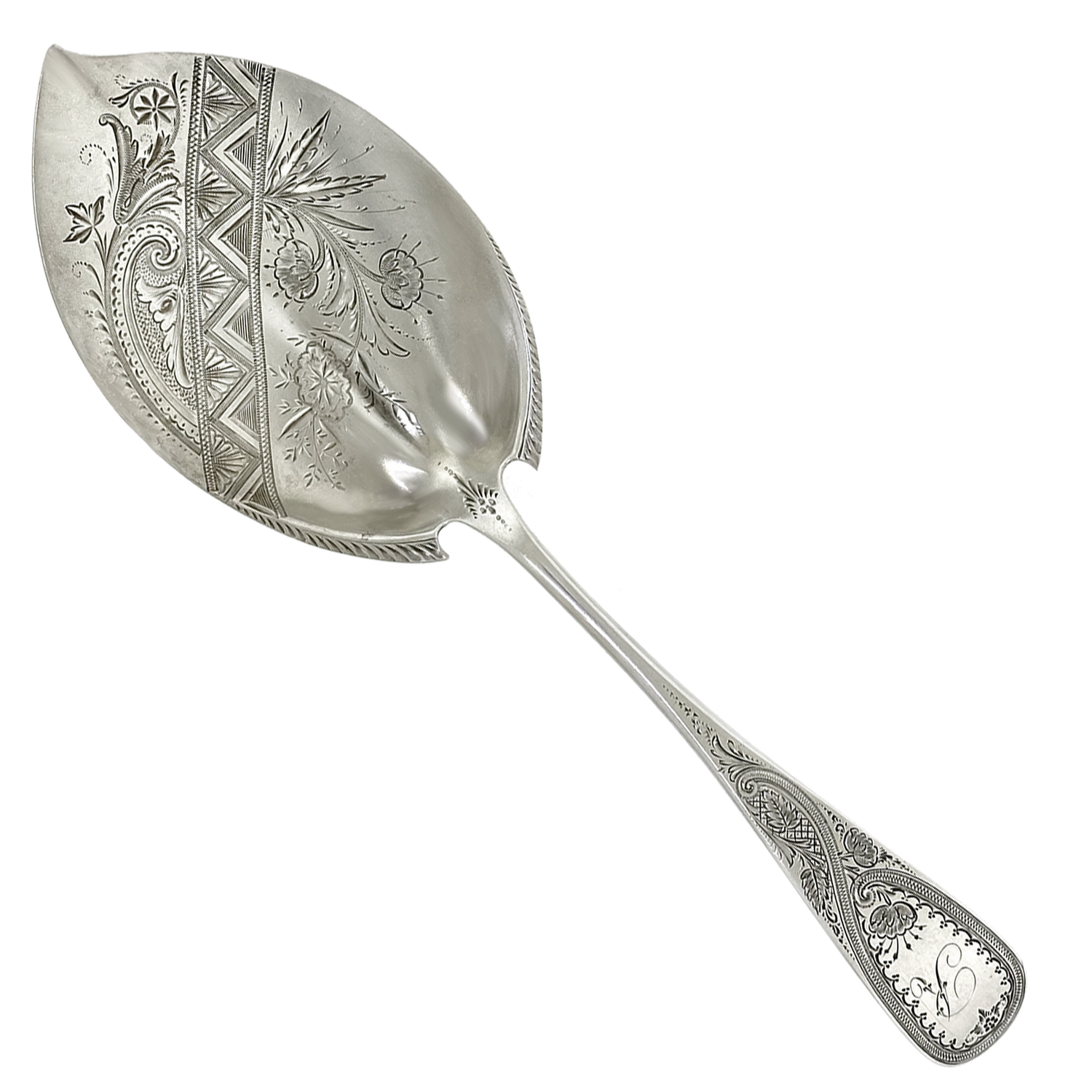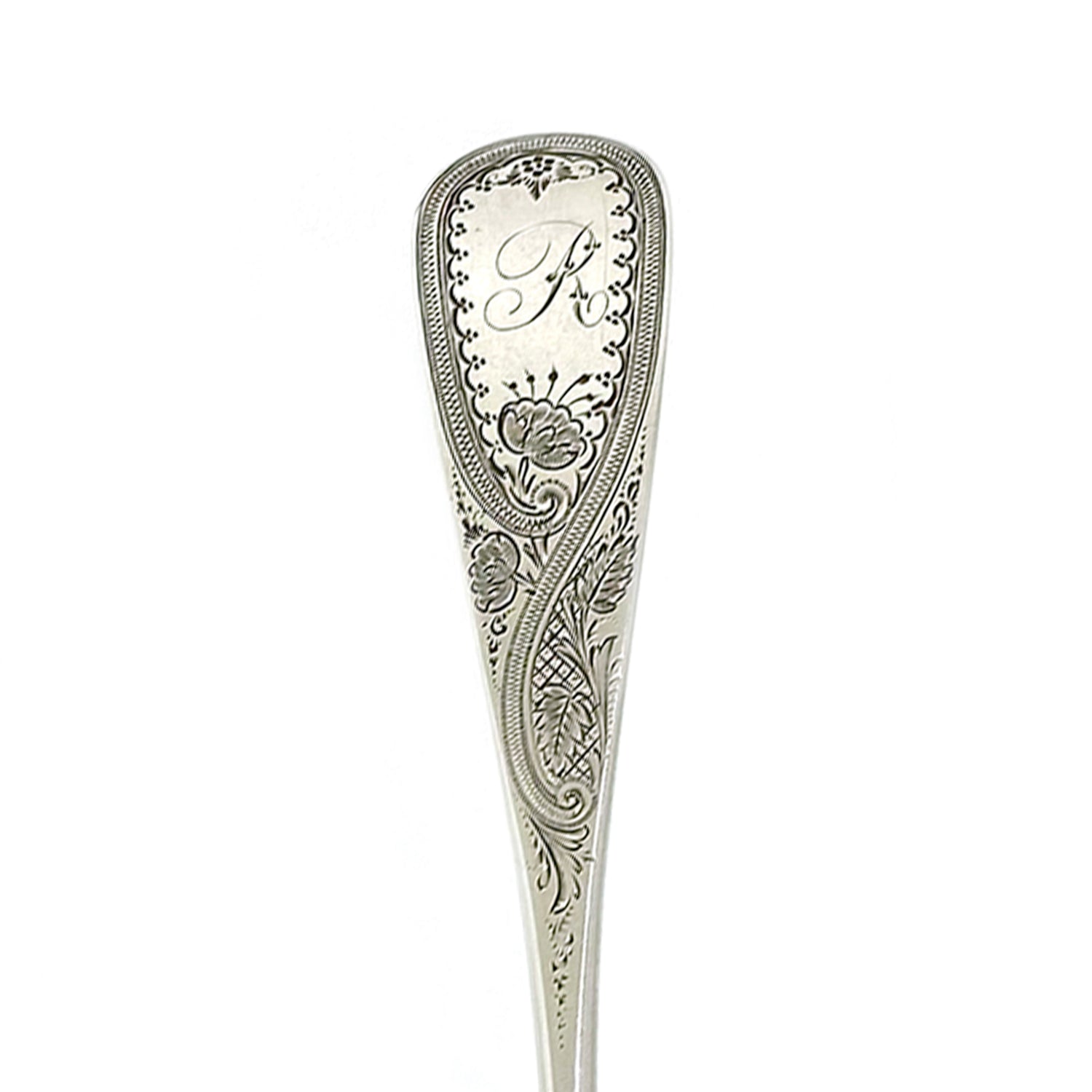 Circa 1860s, Sterling, by Peter L. Krider, Philadelphia, PA. Wonderful for serving, this large brite-cut spoon has lovely floral engraving. Excellent condition.
