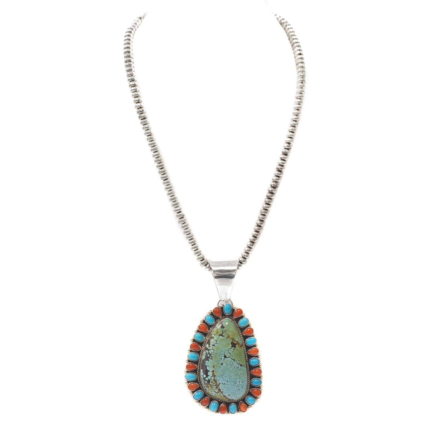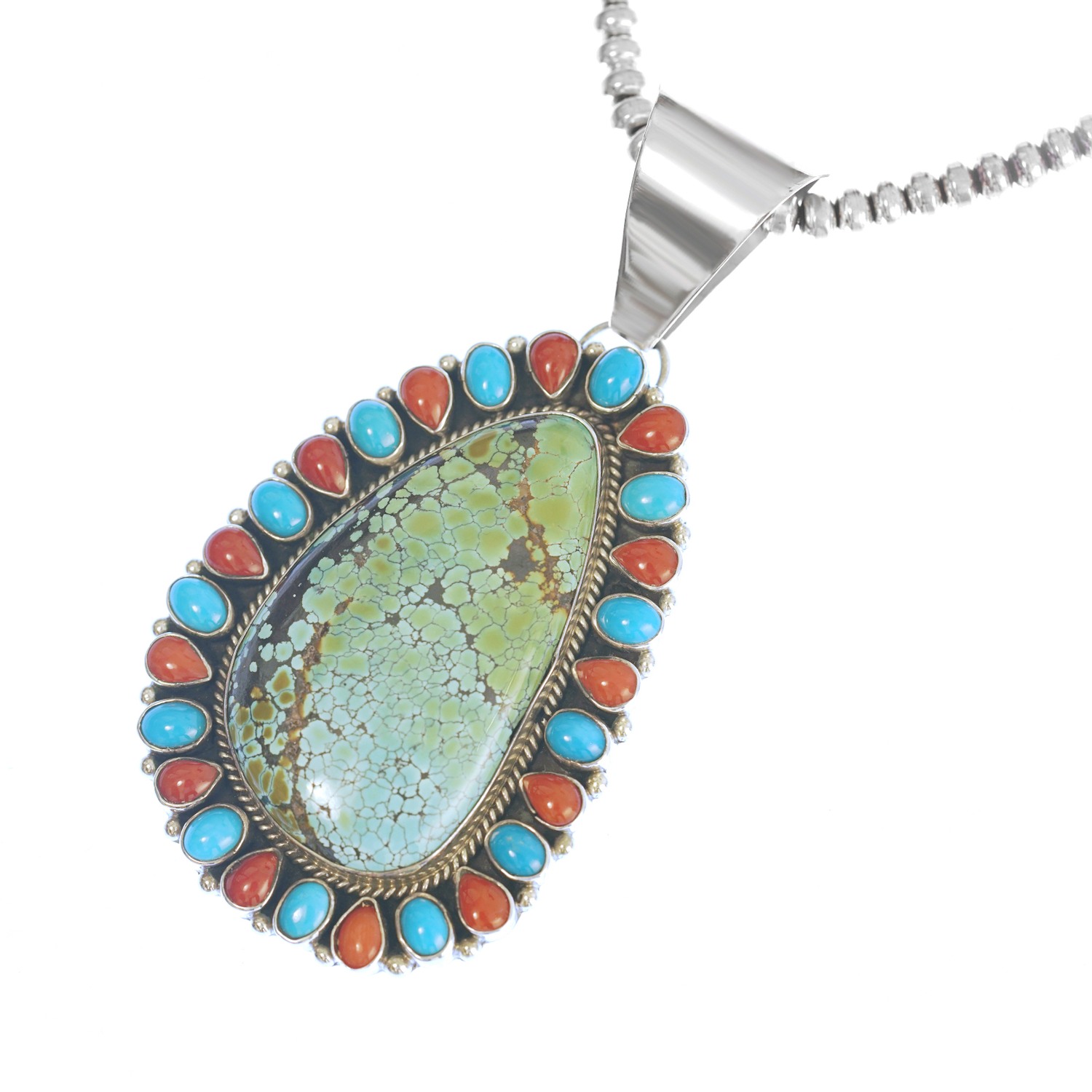 Circa 2000s, sterling, by L. Etsitty, Navajo. This stylishly large pendant necklace is set with a beautifully figured, blue-green turquoise surrounded by a sky blue turquoise and coral border. Finely hand-fashioned by contemporary Navajo silversmith L. Etsitty, this sterling necklace is in excellent condition.