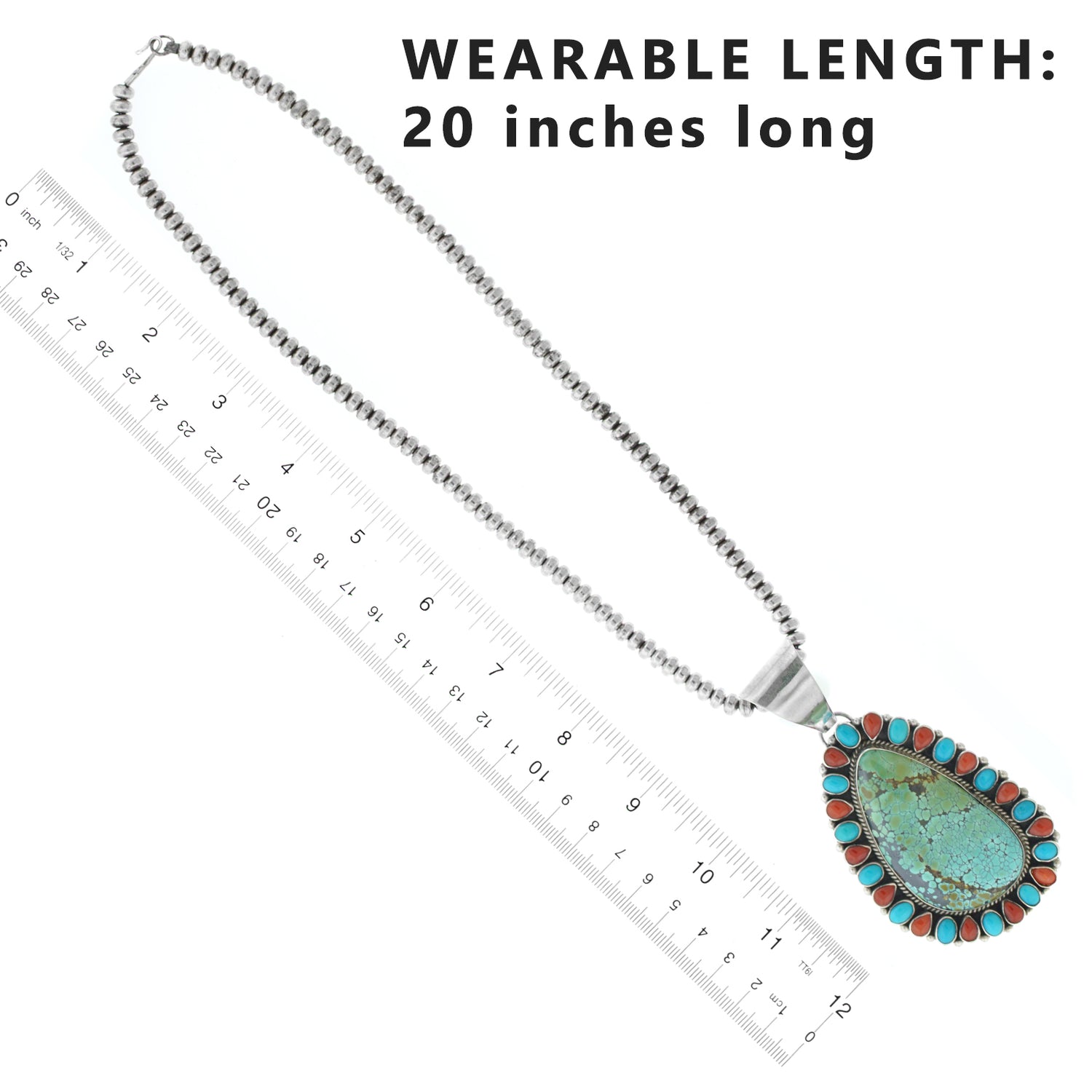 Measurements: Pendant is 3 3/4 inches high by 2 inches wide, necklace 20 inches long