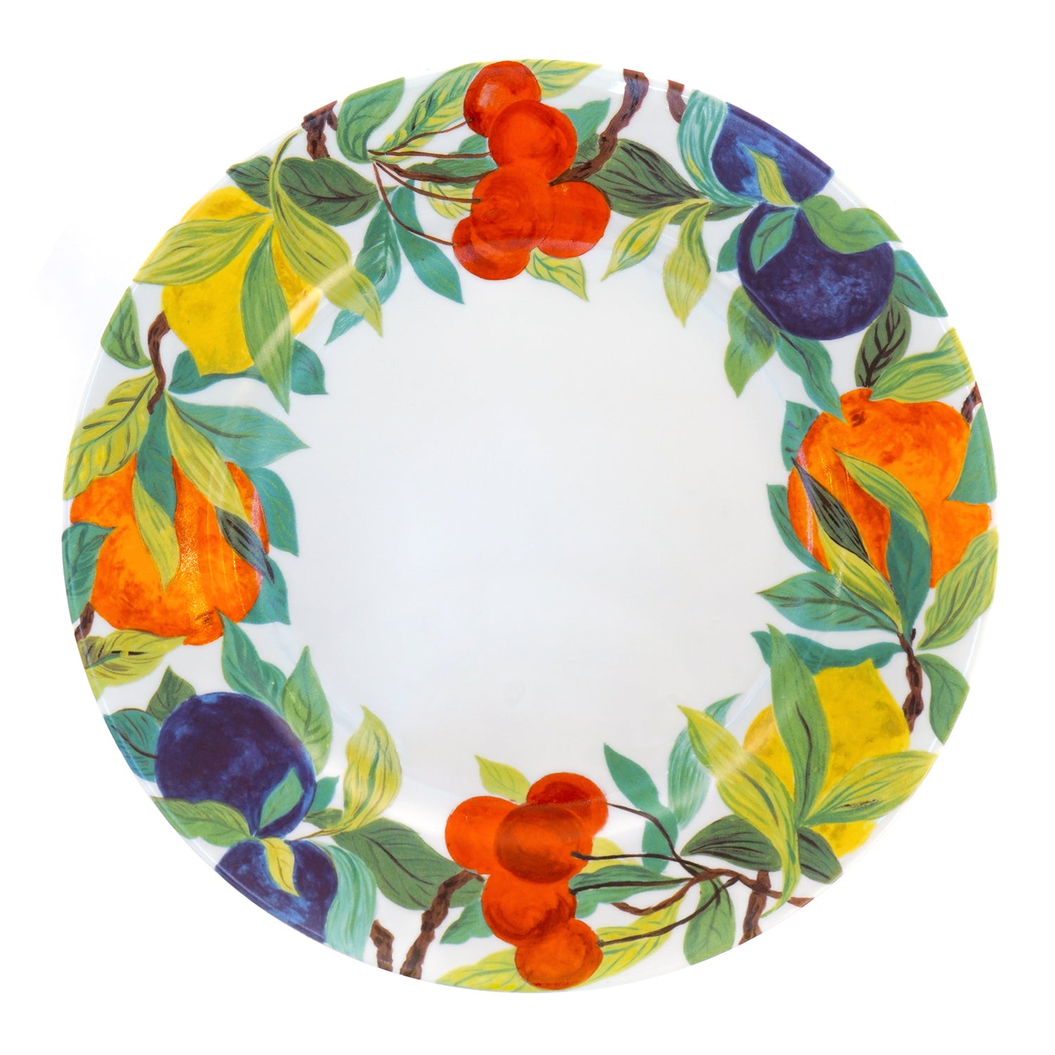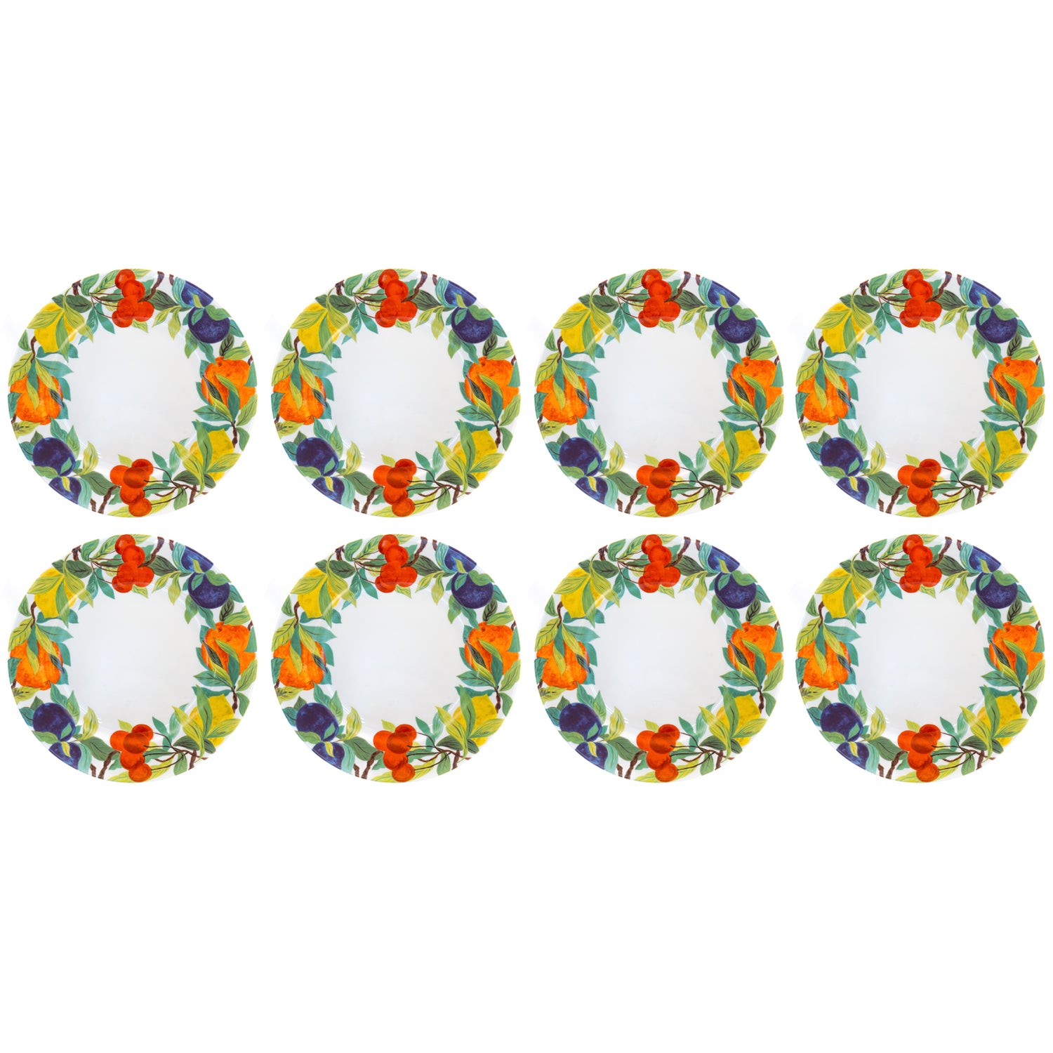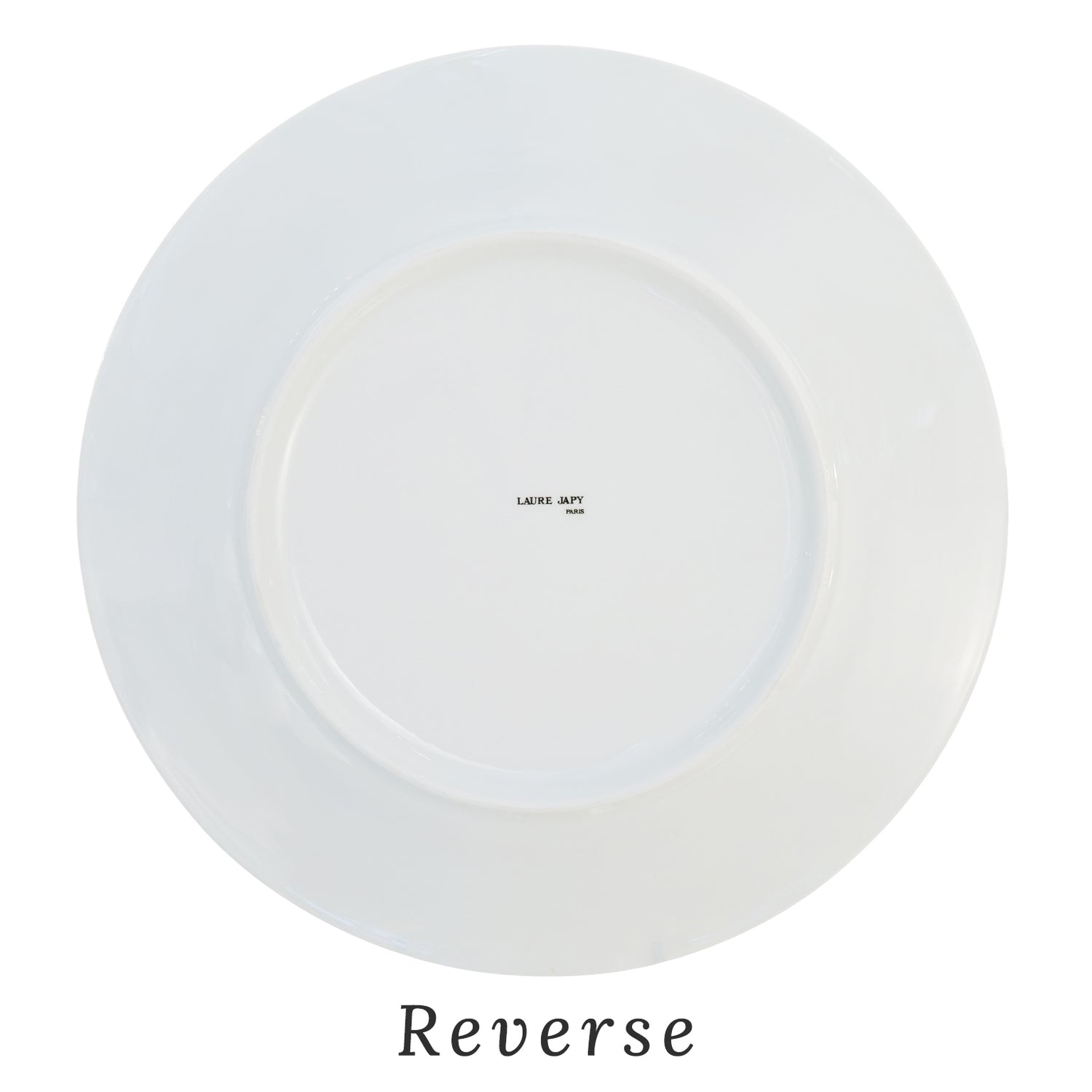 Circa 1990s, Porcelain, by Laure Japy, Paris. From the esteemed firm of Laure Japy in Paris, this set of 8 11 3/4s inch diameter chargers is a rare blanc (white center) variant of the gorgeous Jardin pattern. Perfect for spring and summer, they will bring cheerful color to any table. Hand-painted, they are in excellent condition.