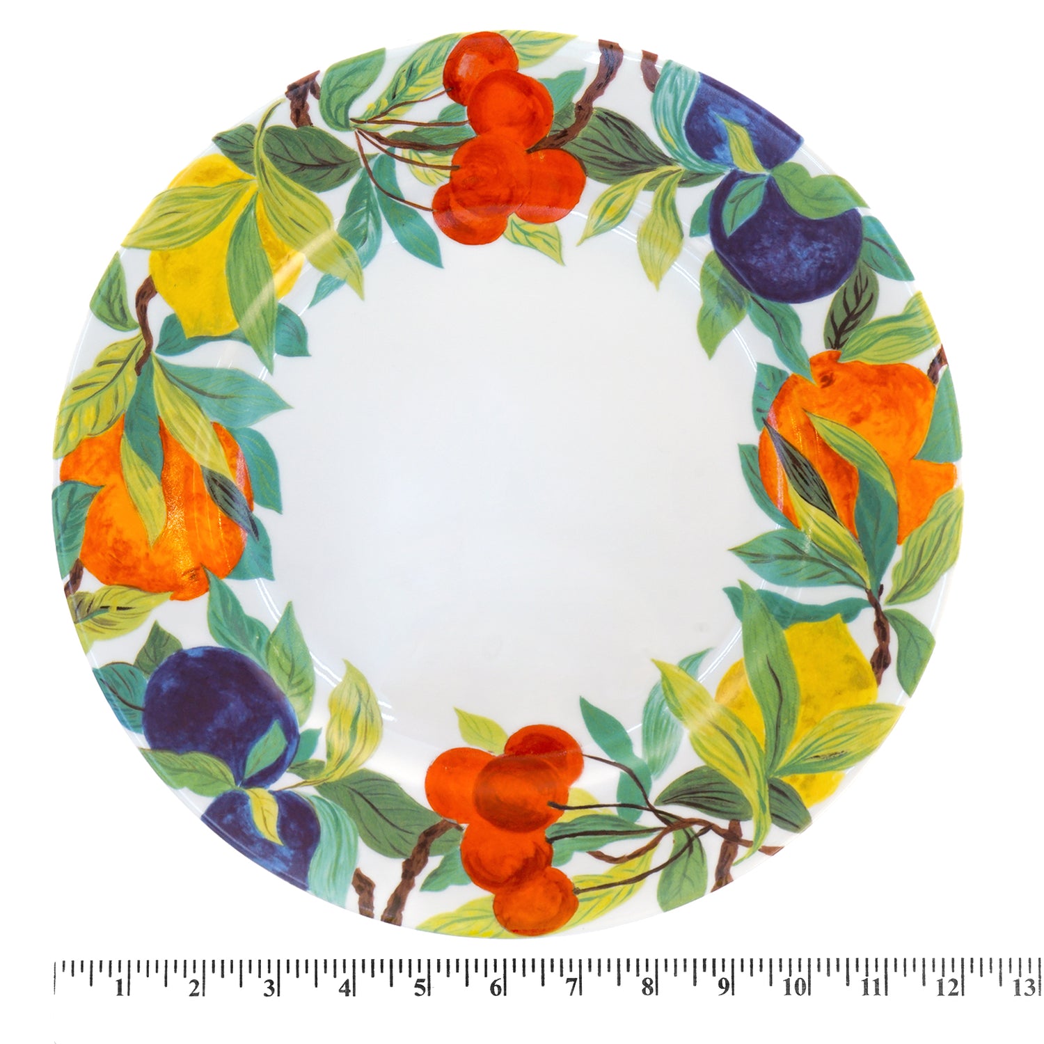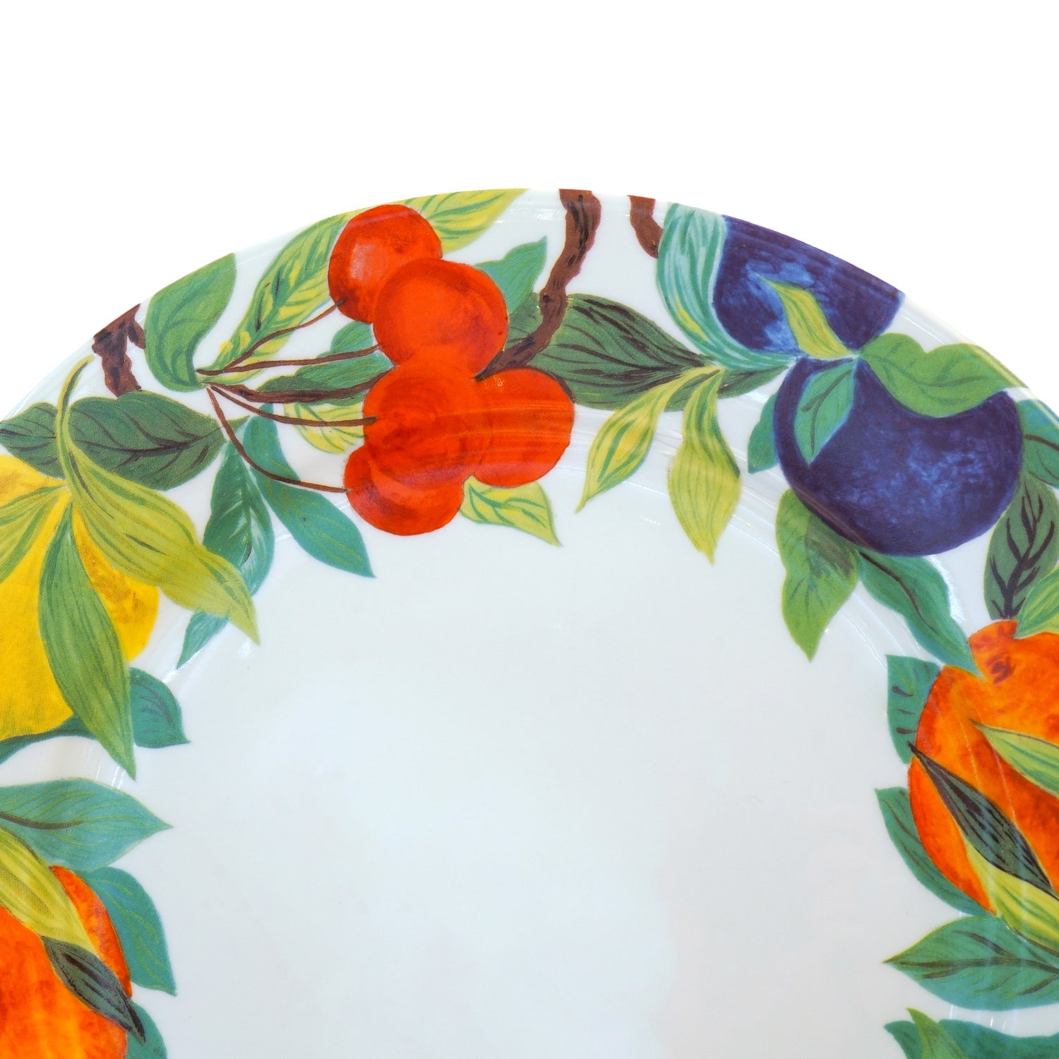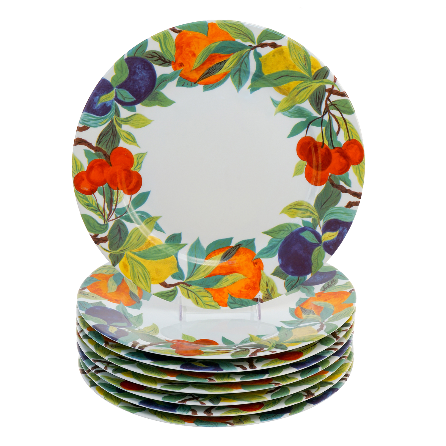 Circa 1990s, Porcelain, by Laure Japy, Paris. From the esteemed firm of Laure Japy in Paris, this set of 8 11 3/4s inch diameter chargers is a rare blanc (white center) variant of the gorgeous Jardin pattern. Perfect for spring and summer, they will bring cheerful color to any table. Hand-painted, they are in excellent condition.