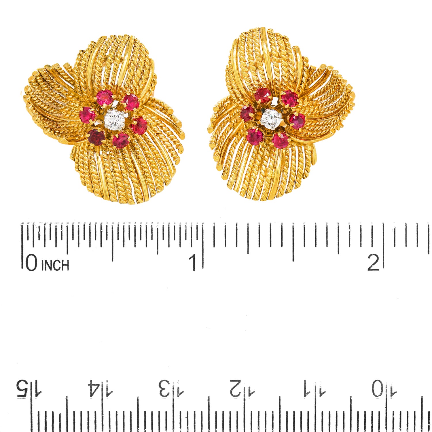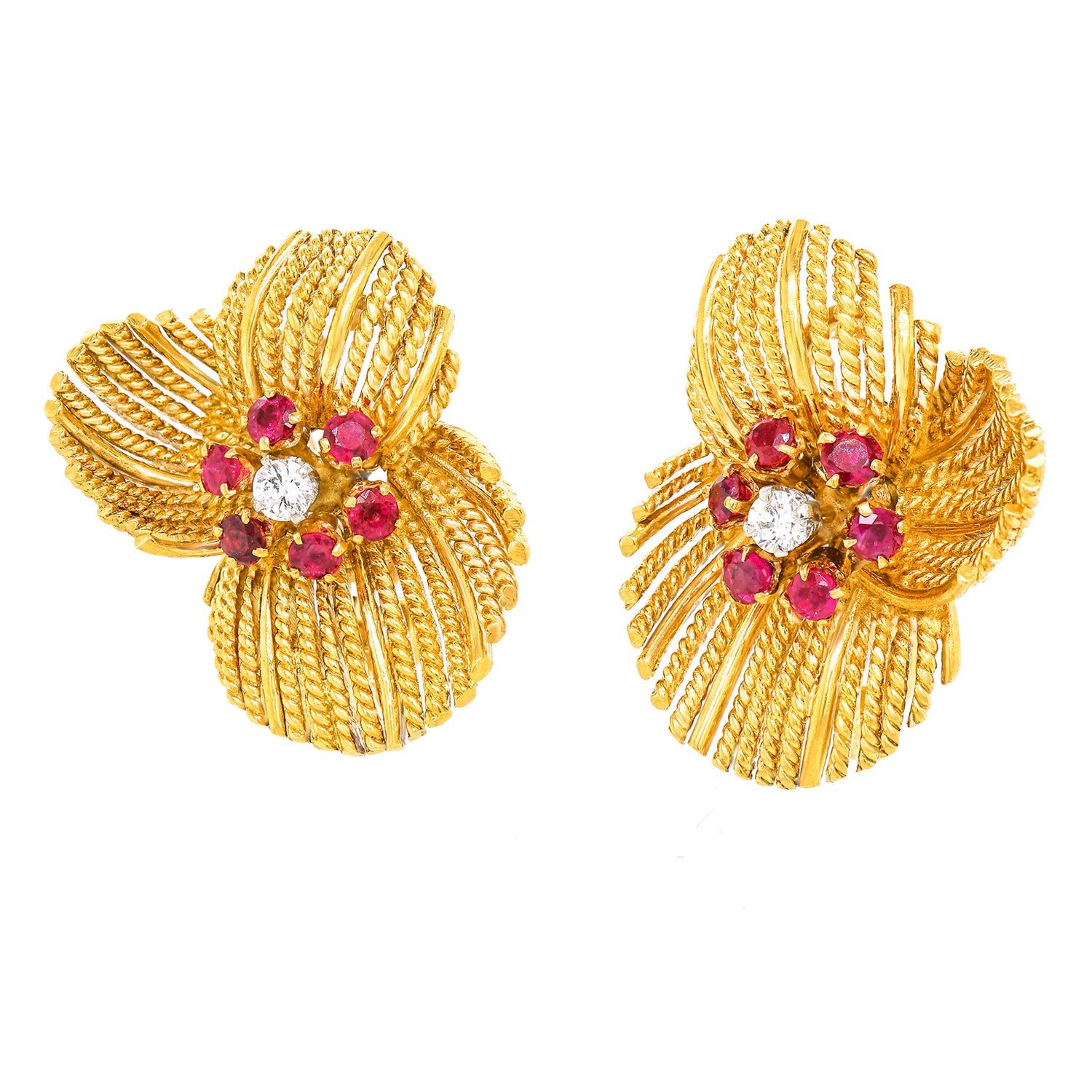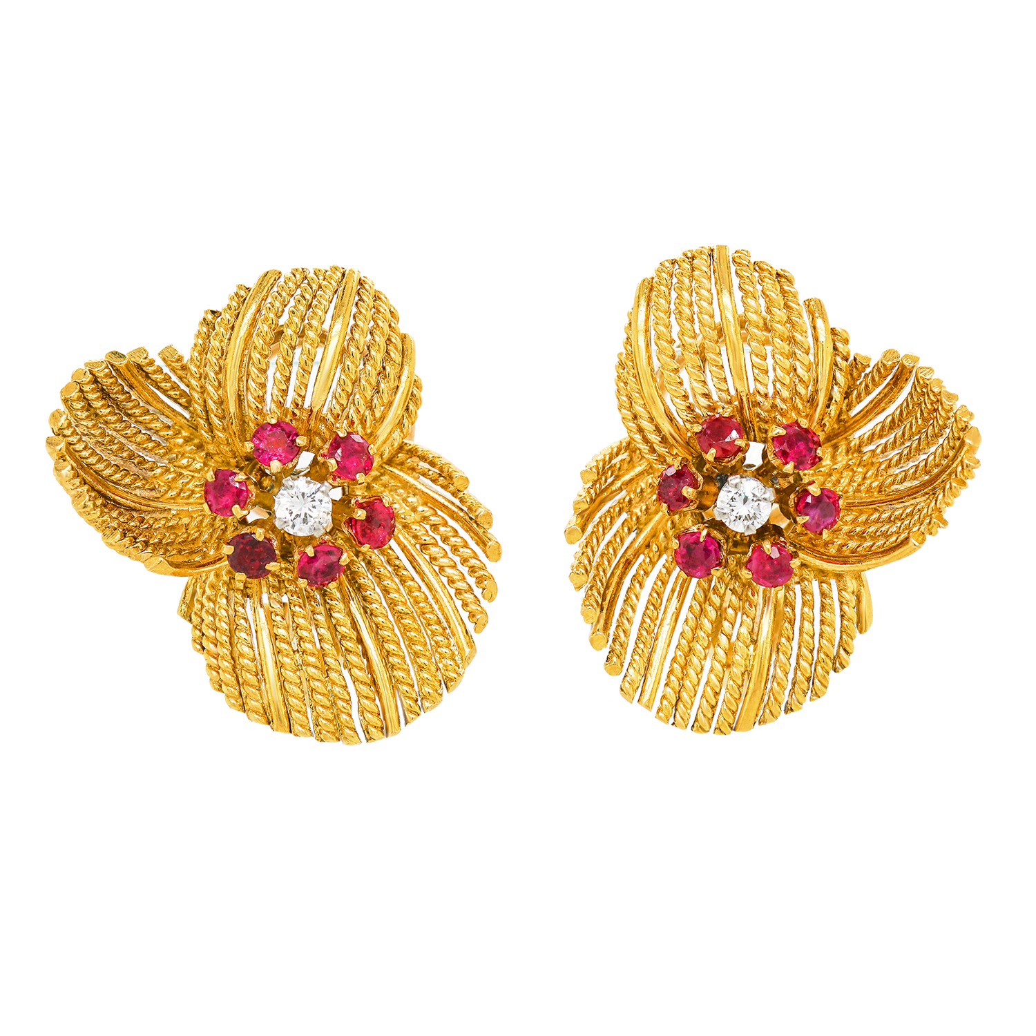 Circa 1964, 18k, London, England. From the pages of Vogue to Carnaby Street, sixties London style is fab …fabulous. These chic flower motif earrings are finely hand-fabricated in eighteen-karat yellow gold and set with bright red rubies and brilliant diamonds. Texture, shape, and form all come together for a delightful visual. Excellent condition.