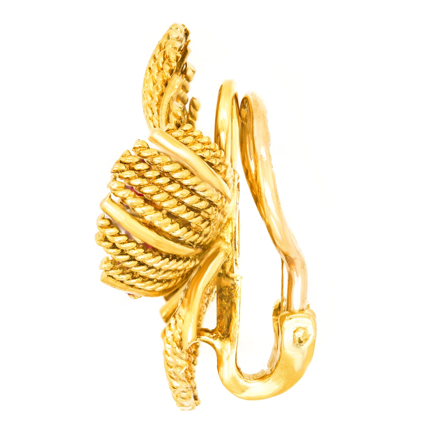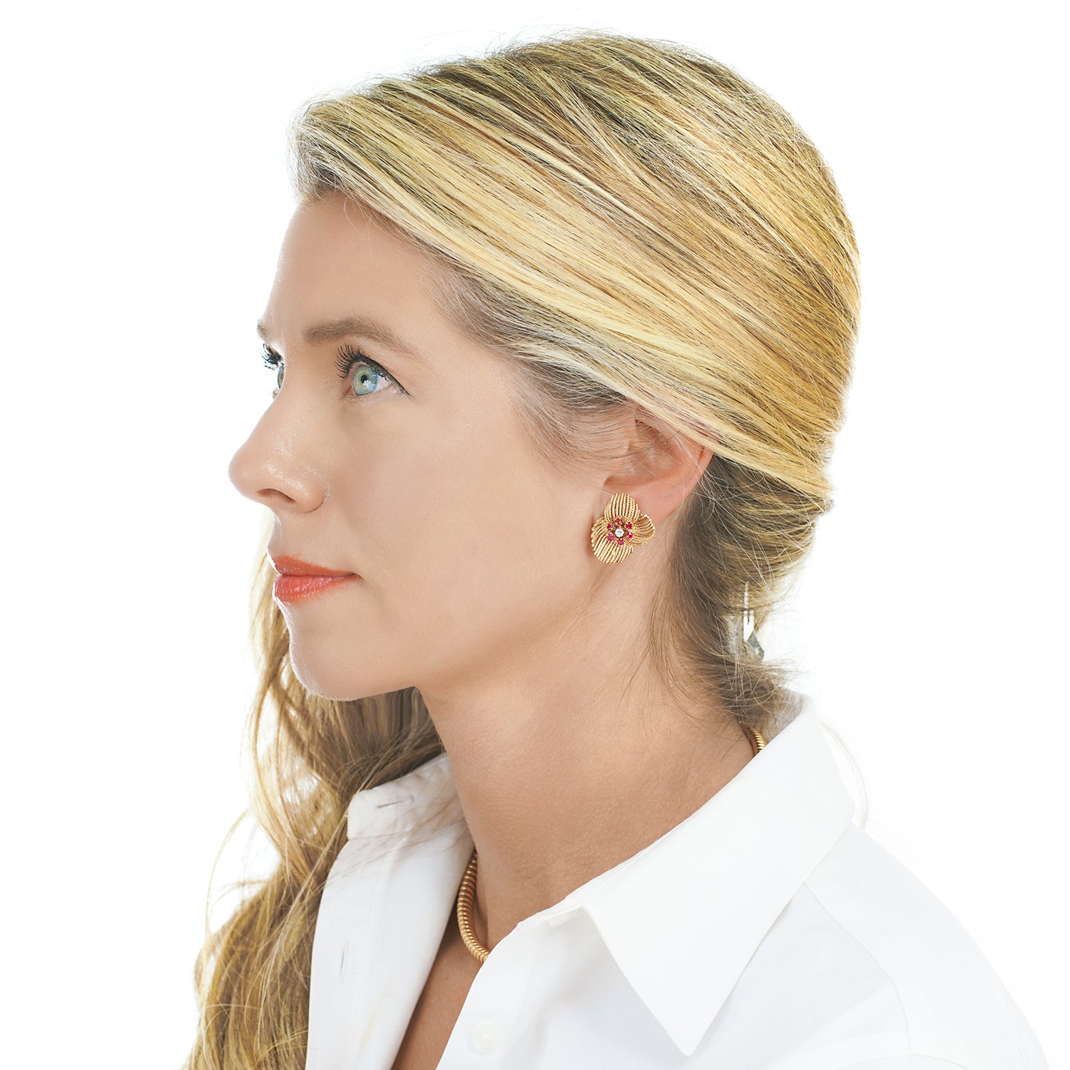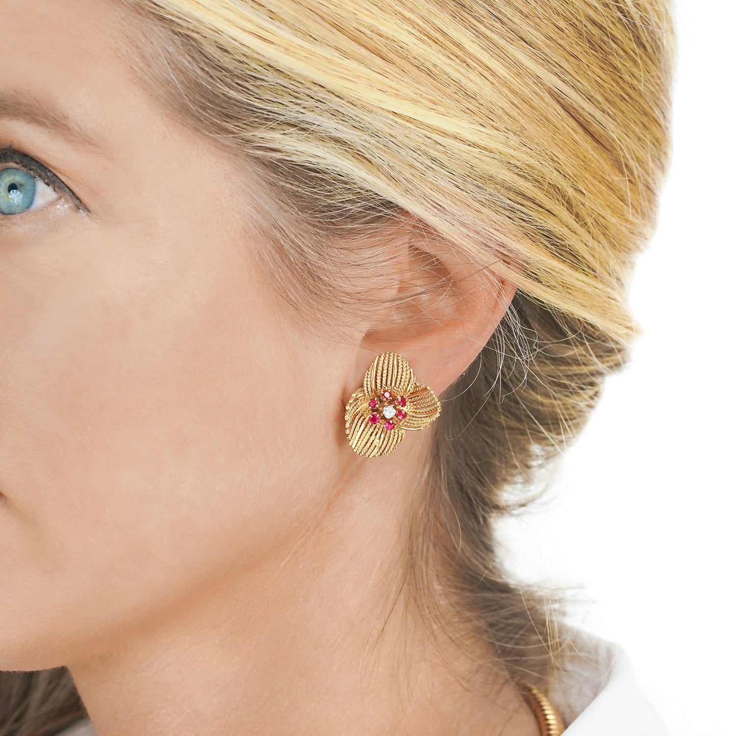 Circa 1964, 18k, London, England. From the pages of Vogue to Carnaby Street, sixties London style is fab …fabulous. These chic flower motif earrings are finely hand-fabricated in eighteen-karat yellow gold and set with bright red rubies and brilliant diamonds. Texture, shape, and form all come together for a delightful visual. Excellent condition.