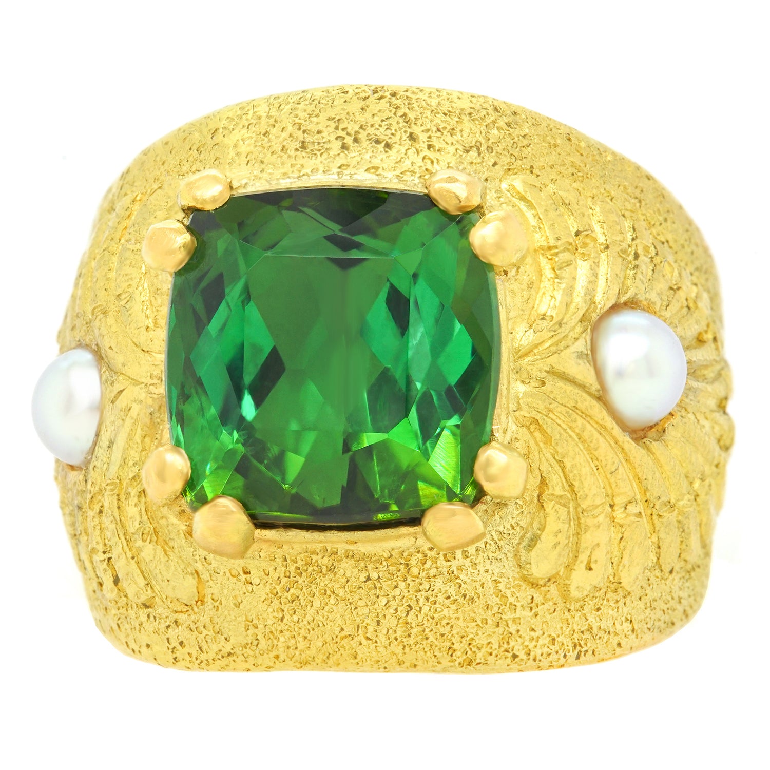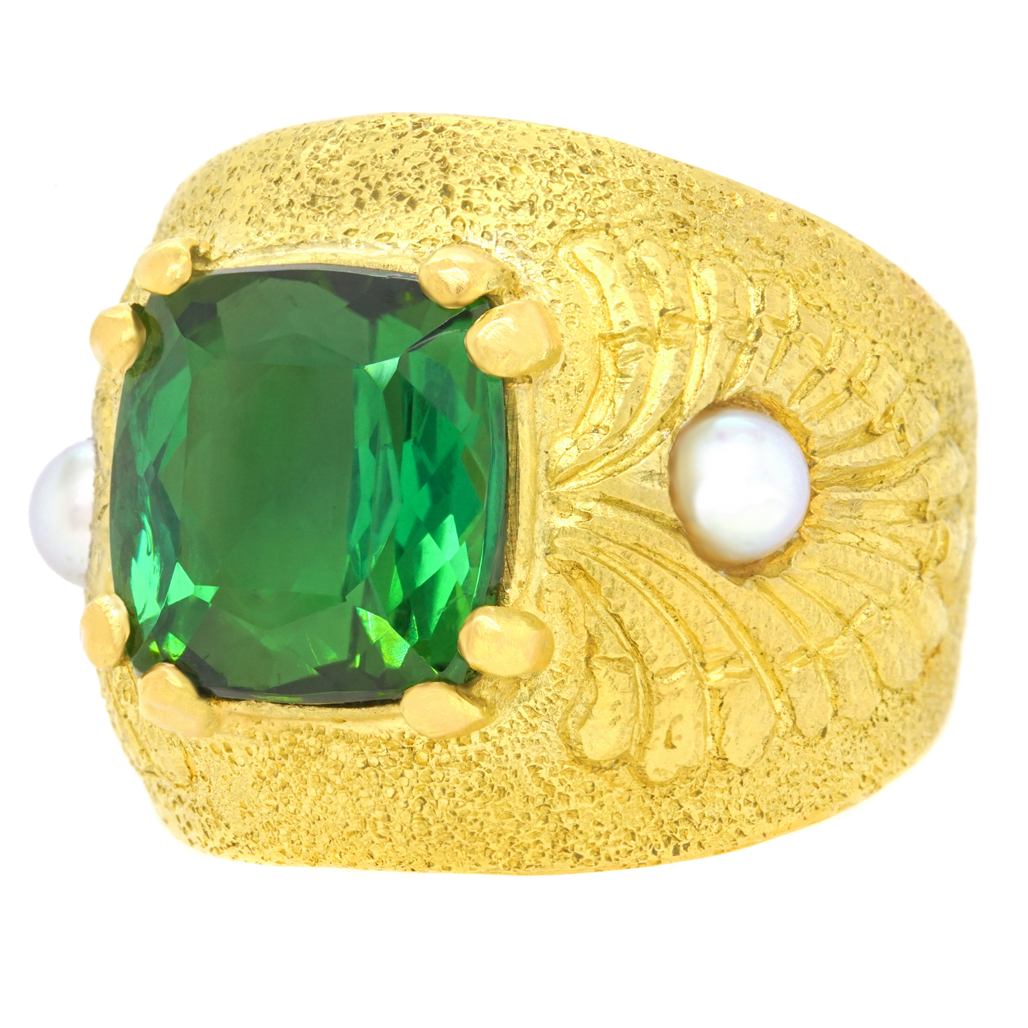 Circa 1960s, 18k, by Louis Feron, France and USA.   In a world where surreal landscapes define the surface of jewelry, the sixties was a chic time for Art becoming fashion and chic defining Art. This ring, by the Master Goldsmith and designer Louis Feron, is a stylish accessory from that moment. The look of his jewelry influenced Jean Schlumberger, Cartier, and Verdura as he designed and fabricated for them and many others. This ring is a masterwork set with a superb 7.0-carat green tourmaline and two bright pearls. Excellent condition.