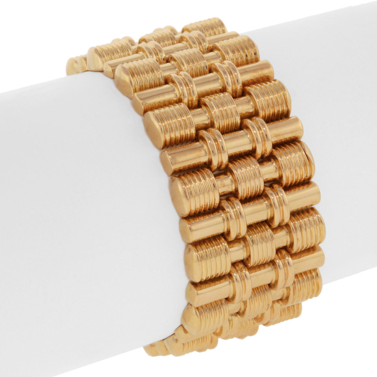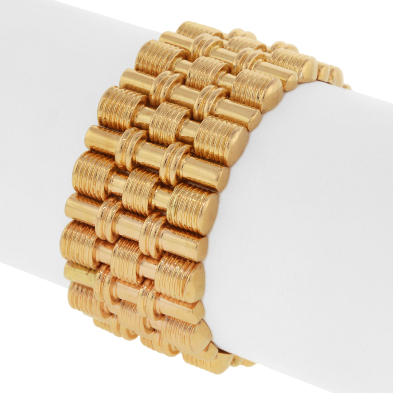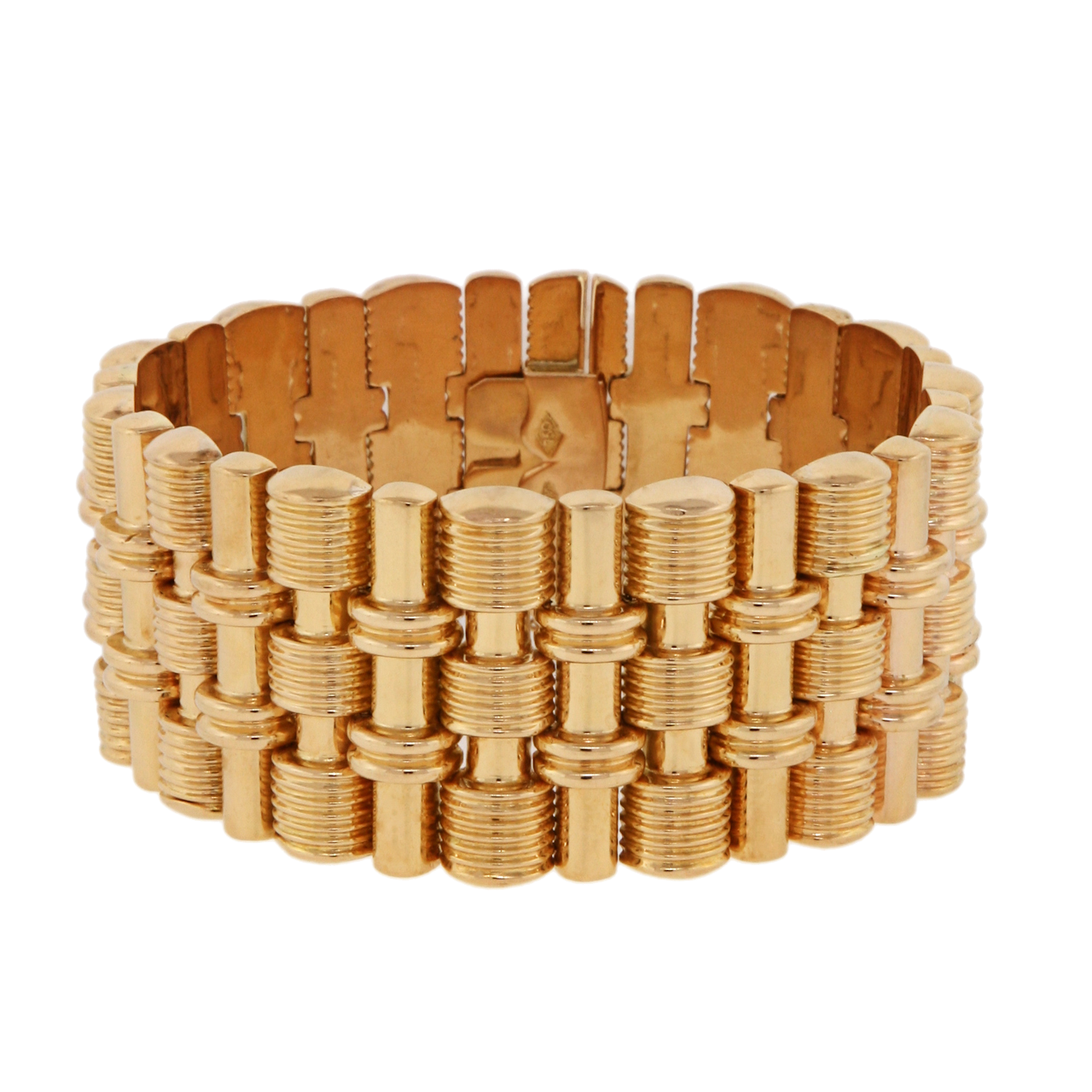 Circa 1938-40, 18k, Italy. The aloof deco moment has waned and the machine age rises. With it comes sleek, streamlined objects like this bracelet. As at home on the catwalk in the new millennium as it was in Venice in the thirties, this fashion forward 18k gold piece of body decoration has a polished cosmopolitan look. Excellent condition. Note: While it is 8" long, it can be shortened.