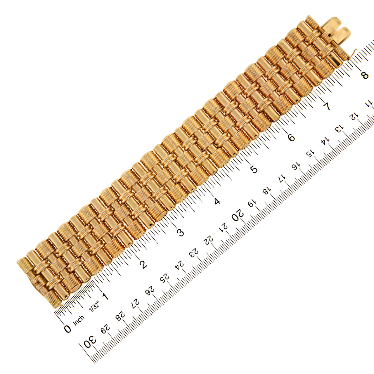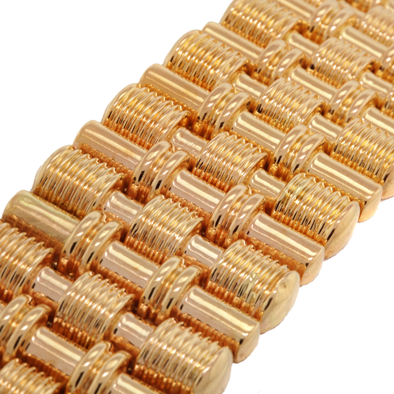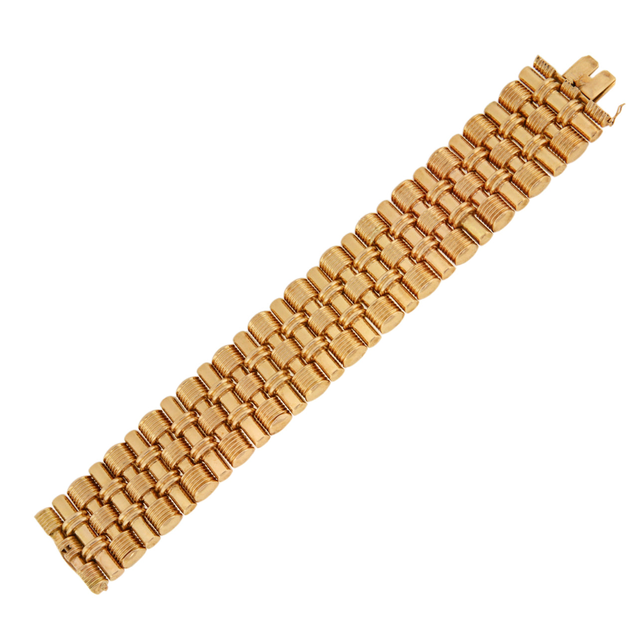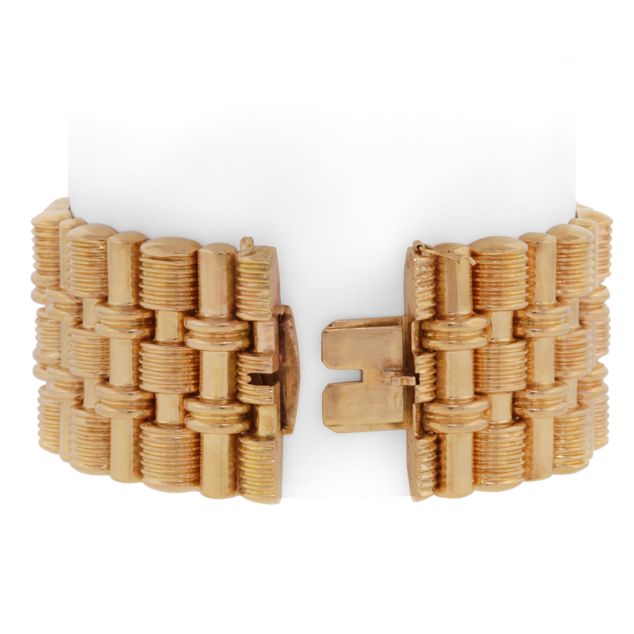 Circa 1938-40, 18k, Italy. The aloof deco moment has waned and the machine age rises. With it comes sleek, streamlined objects like this bracelet. As at home on the catwalk in the new millennium as it was in Venice in the thirties, this fashion forward 18k gold piece of body decoration has a polished cosmopolitan look. Excellent condition. Note: While it is 8" long, it can be shortened.