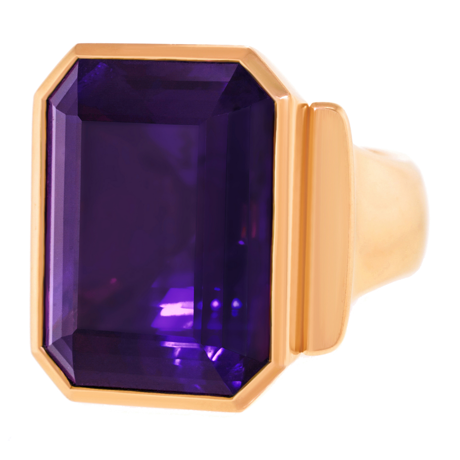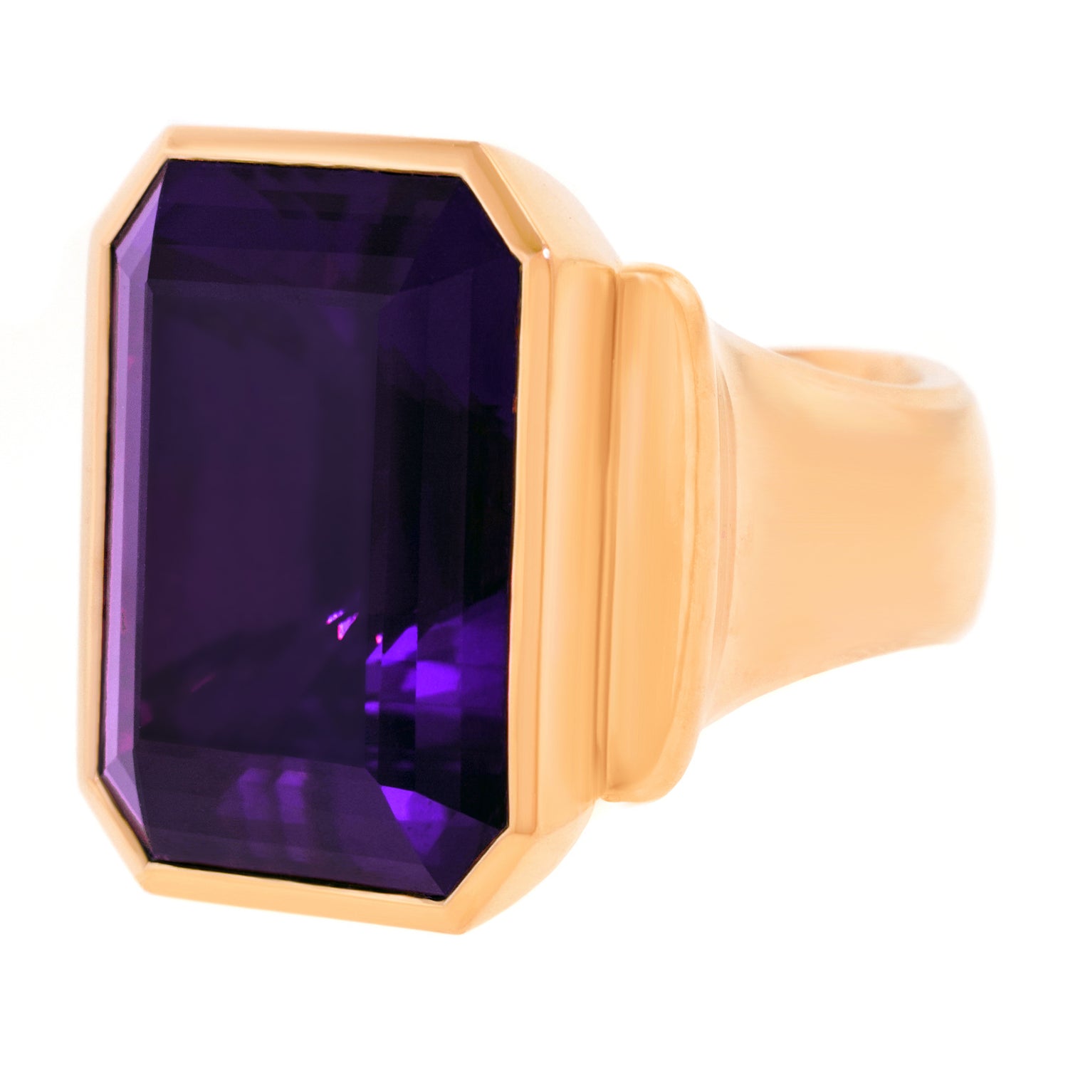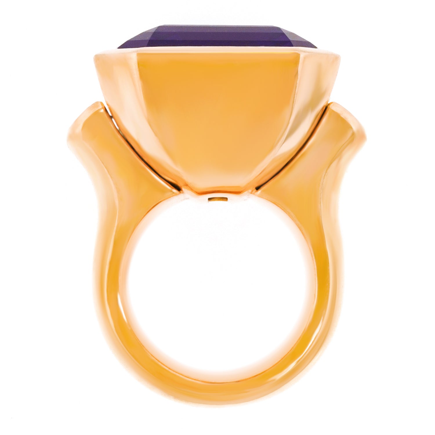 Circa 1980s, 18k, by Majo Fruithof, Zurich, Switzerland.  Stylishly bold, this 18k yellow gold ring features an 80-carat, deeply-hued amethyst. Working from her atelier in Zurich and known for sleekly massive designs, Majo Fruithof was one of the leading female goldsmiths in Europe (now retired). Playing with scale and lush color are her signature design traits. Weighing more than most bracelets, the ring is meticulously fabricated and in excellent condition.