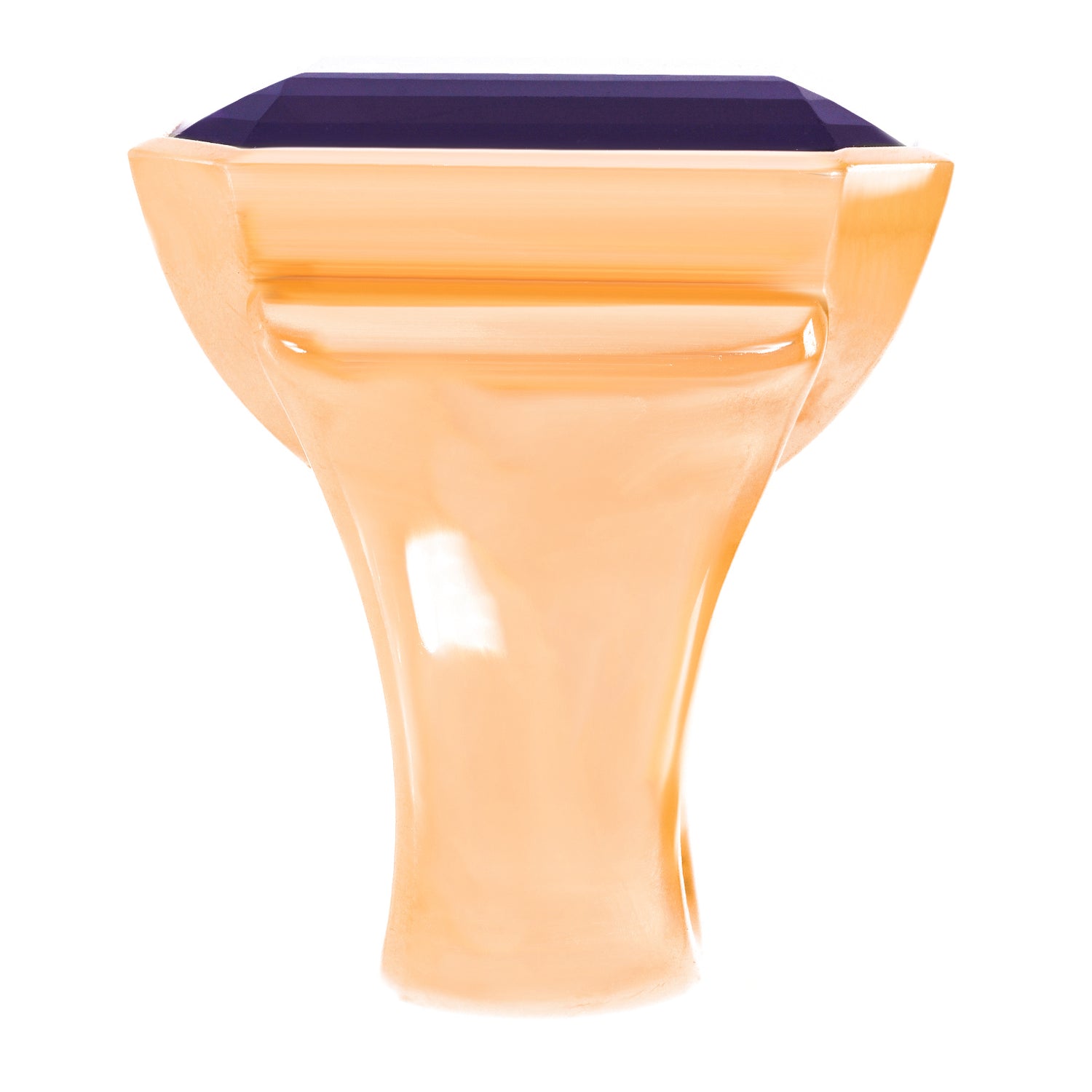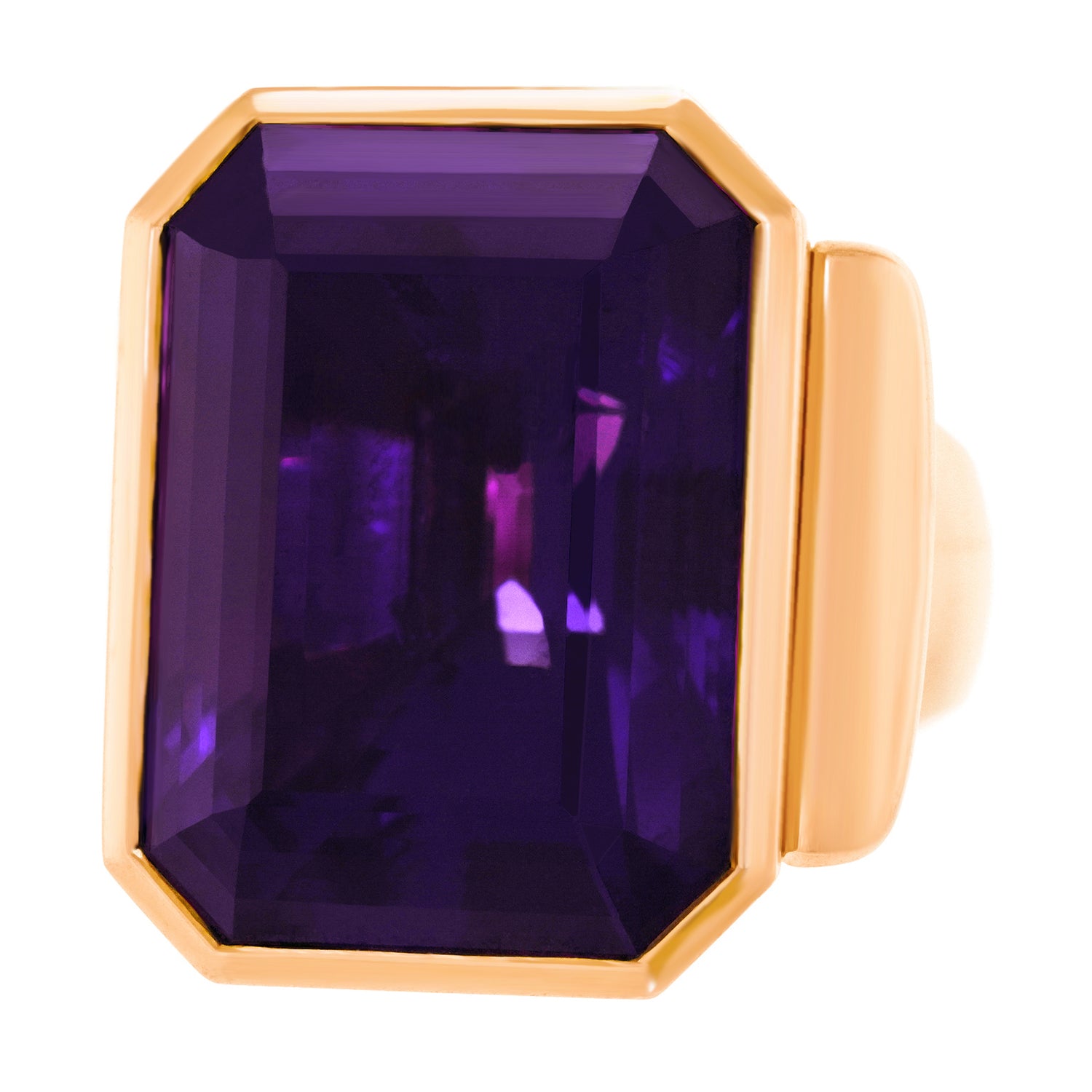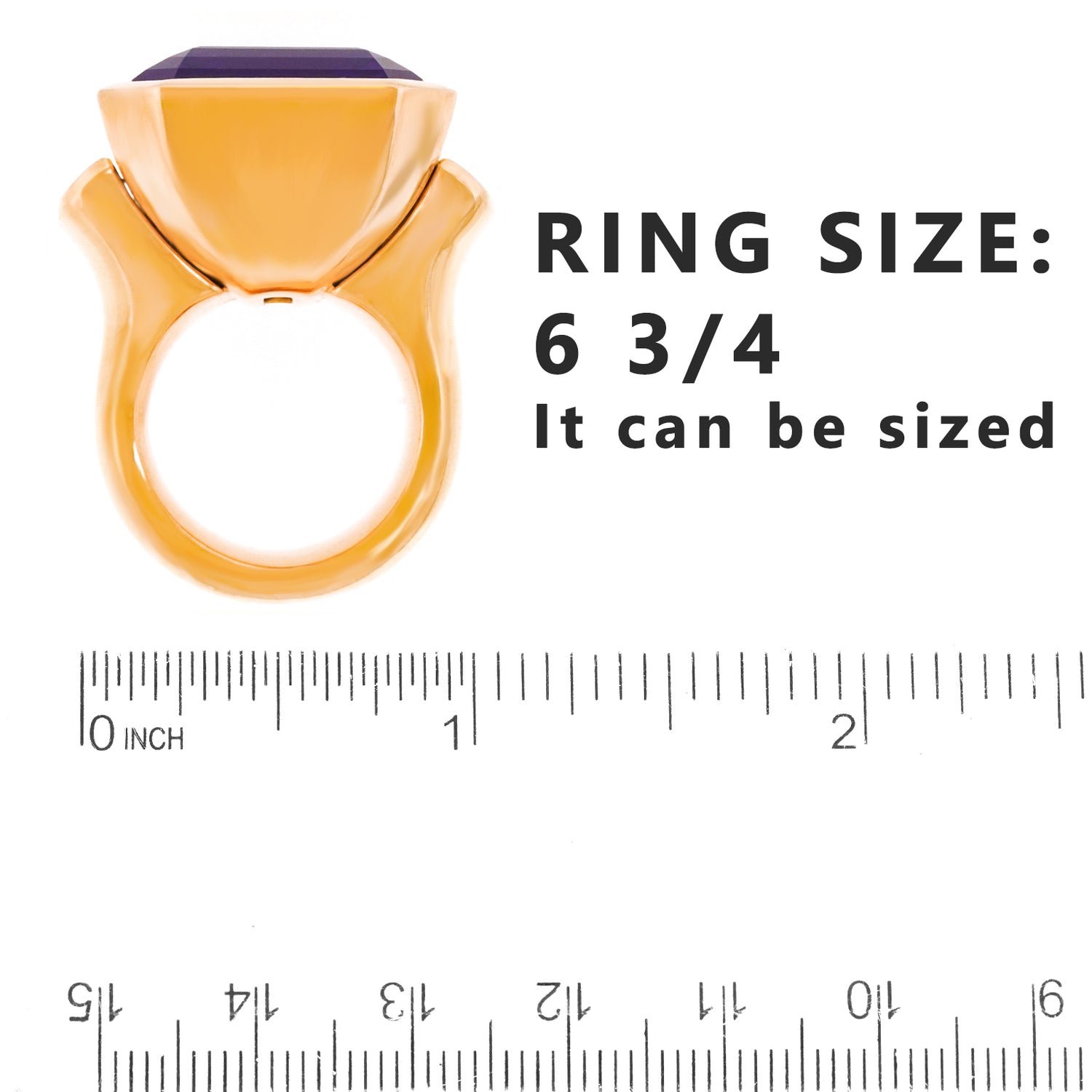 Circa 1980s, 18k, by Majo Fruithof, Zurich, Switzerland.  Stylishly bold, this 18k yellow gold ring features an 80-carat, deeply-hued amethyst. Working from her atelier in Zurich and known for sleekly massive designs, Majo Fruithof was one of the leading female goldsmiths in Europe (now retired). Playing with scale and lush color are her signature design traits. Weighing more than most bracelets, the ring is meticulously fabricated and in excellent condition.