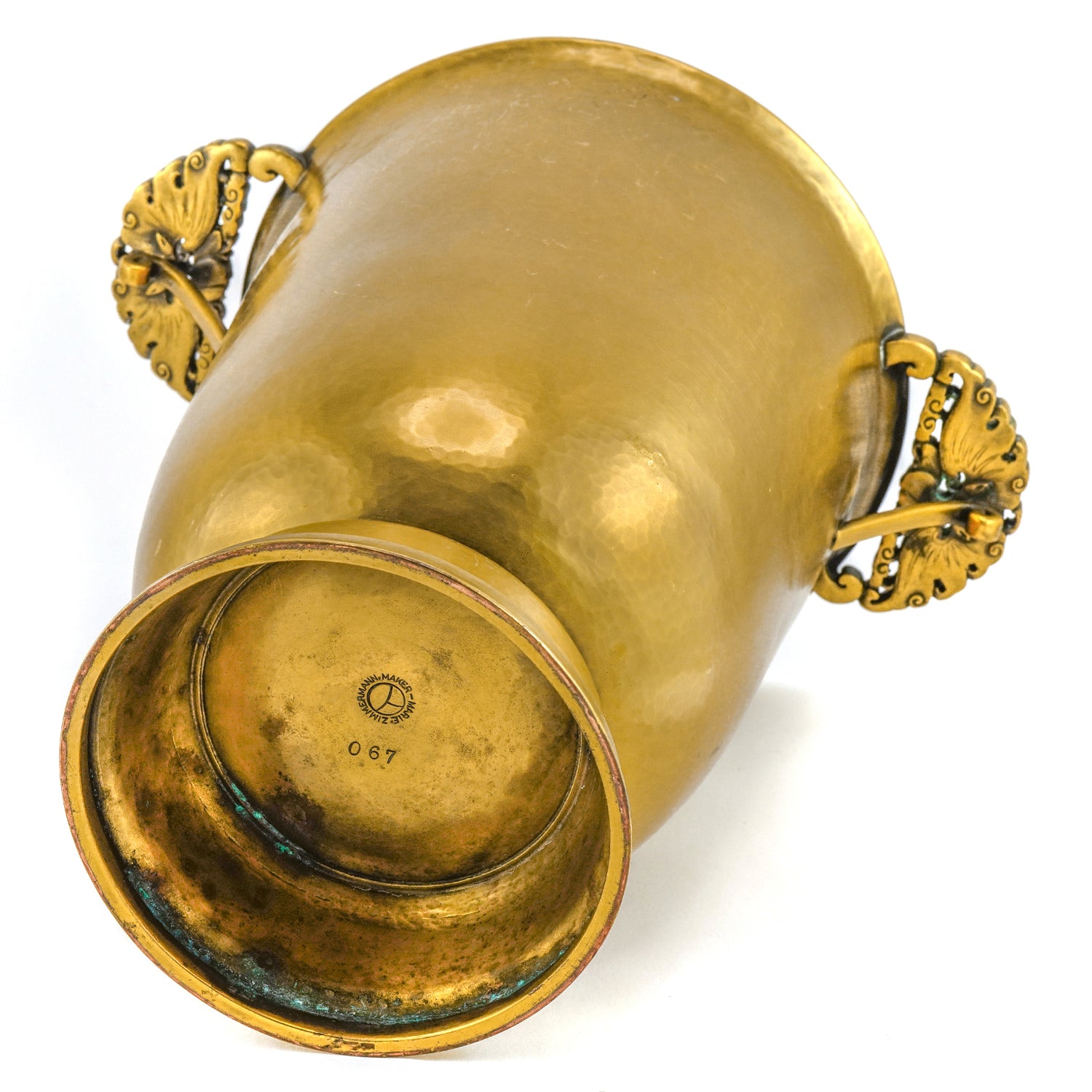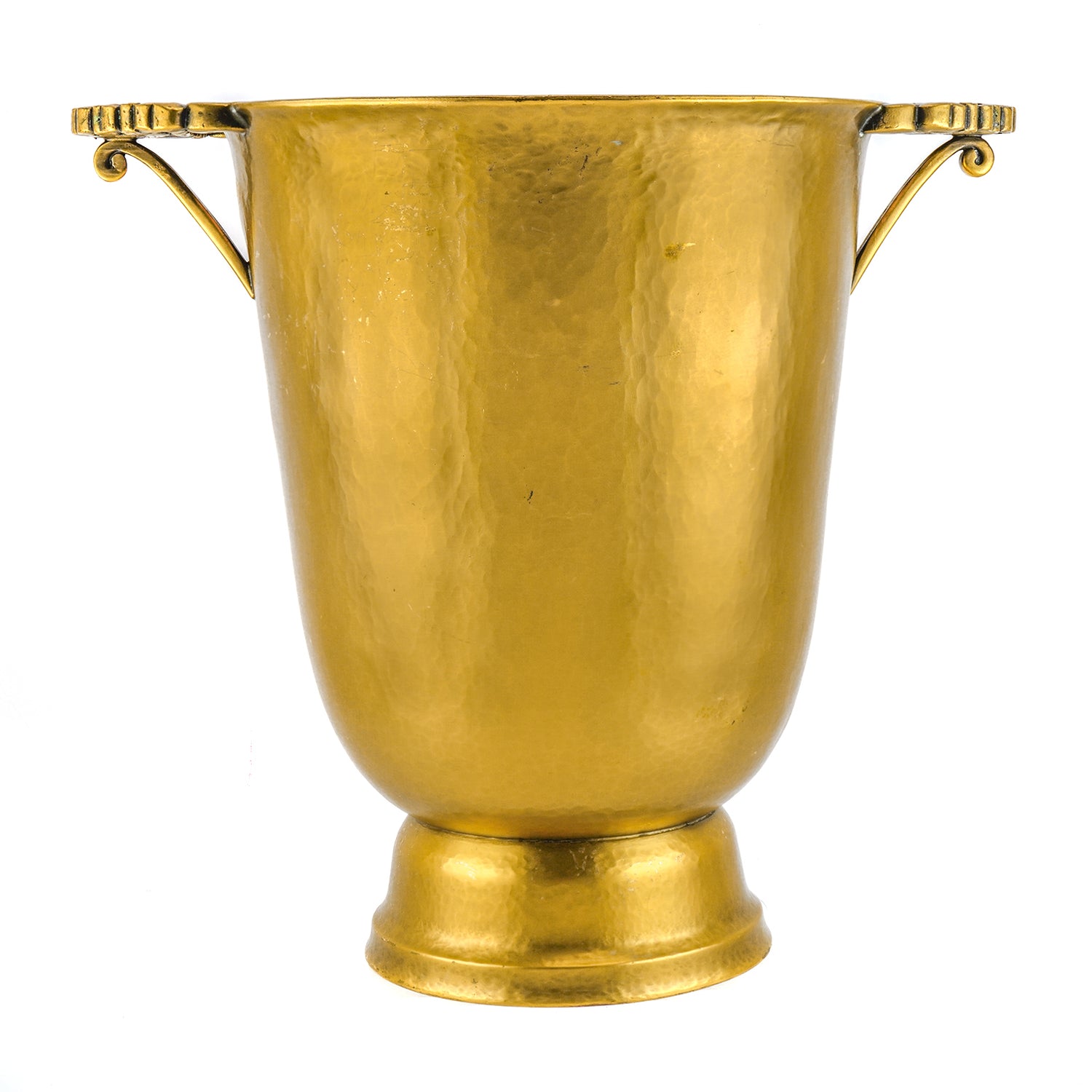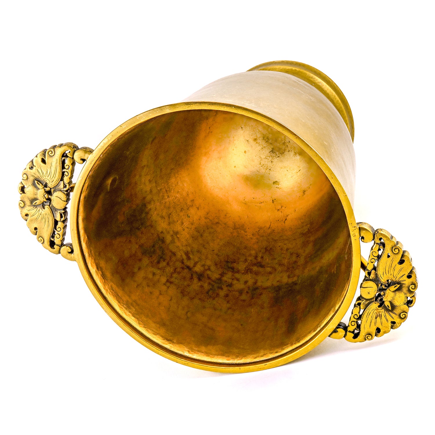 Circa 1920s, Gilded Copper and Bronze, by Marie Zimmerman, American. This champagne cooler, or possibly vase, is an exceptional example of Marie Zimmerman's early work. Gilded in high karat deeply colored gold, the body is fabricated from hammered copper (a rare material for her) and the handles are bronze. The form is serene with bat motif handles in the Chinese taste. Very good condition.