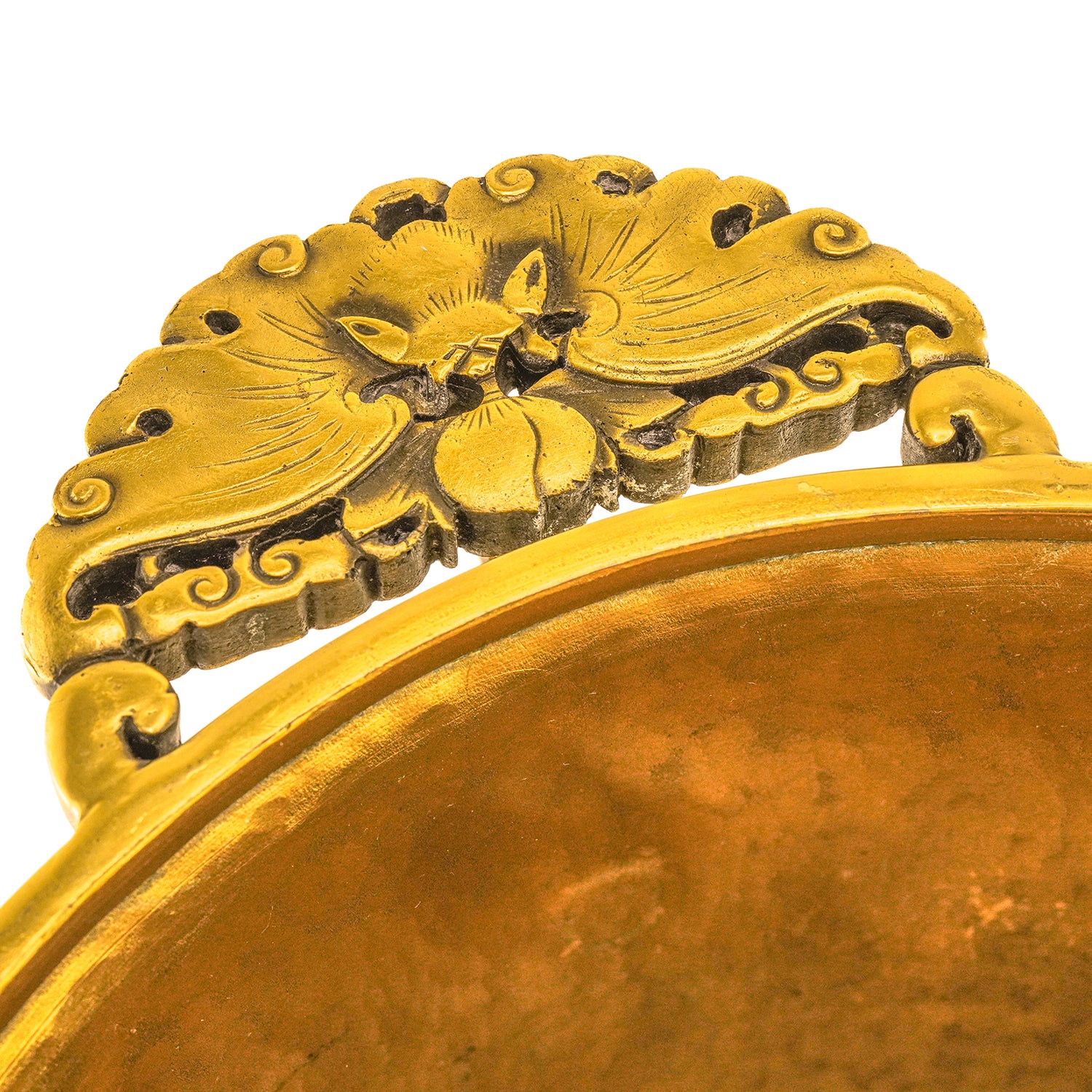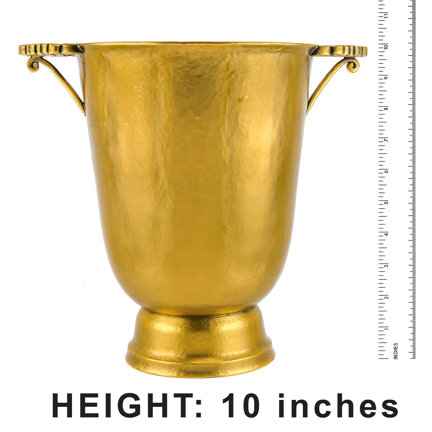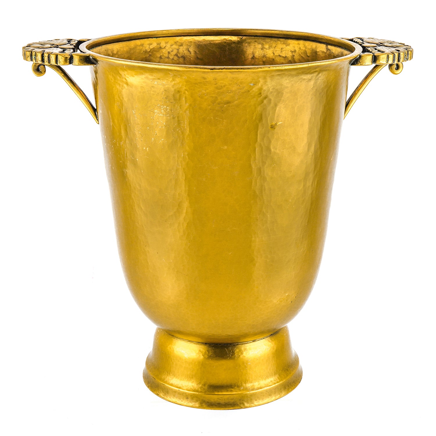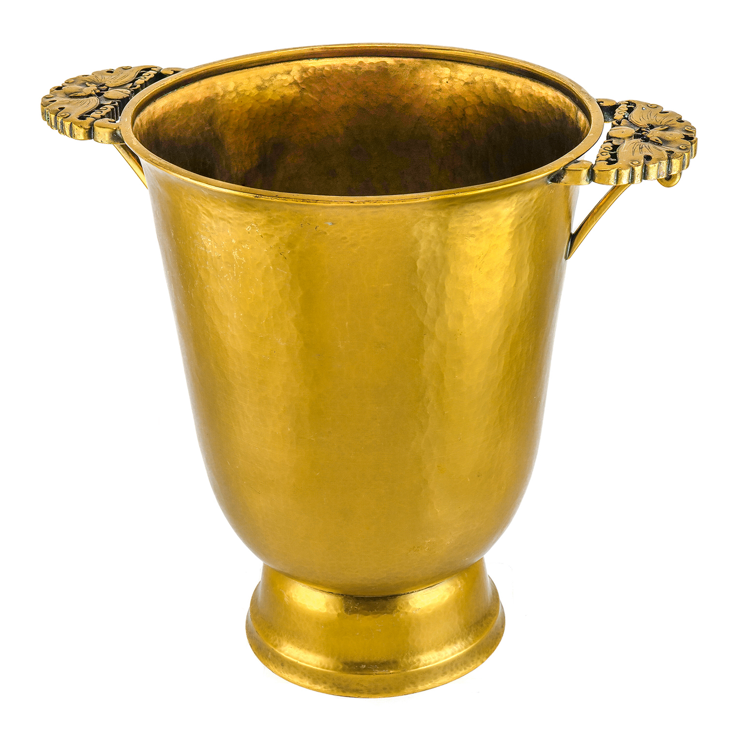 Circa 1920s, Gilded Copper and Bronze, by Marie Zimmerman, American. This champagne cooler, or possibly vase, is an exceptional example of Marie Zimmerman's early work. Gilded in high karat deeply colored gold, the body is fabricated from hammered copper (a rare material for her) and the handles are bronze. The form is serene with bat motif handles in the Chinese taste. Very good condition.