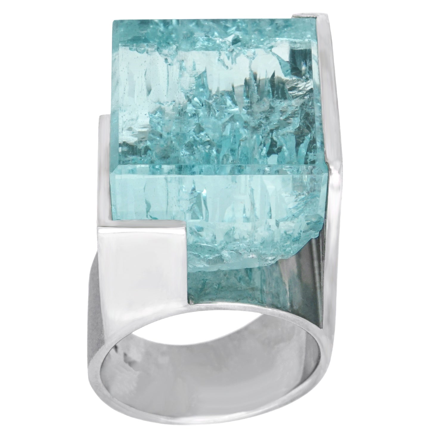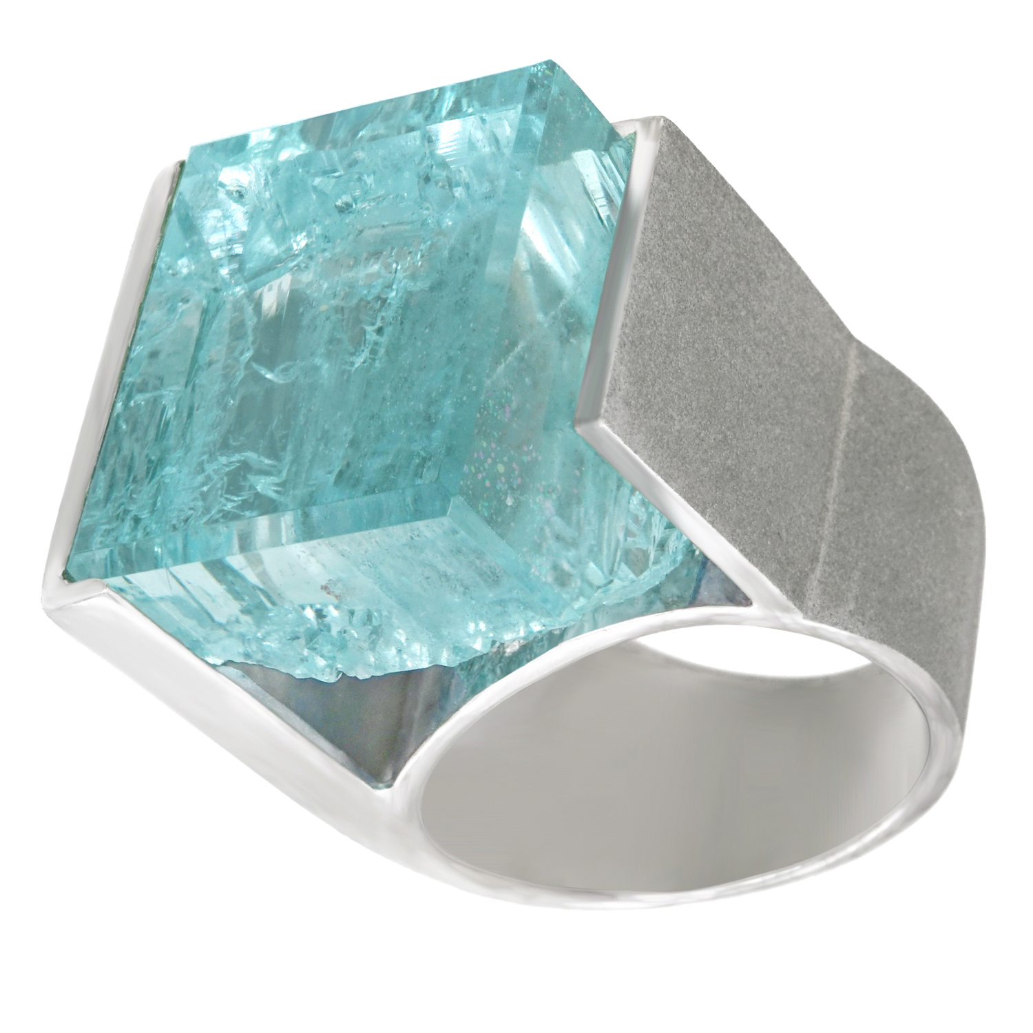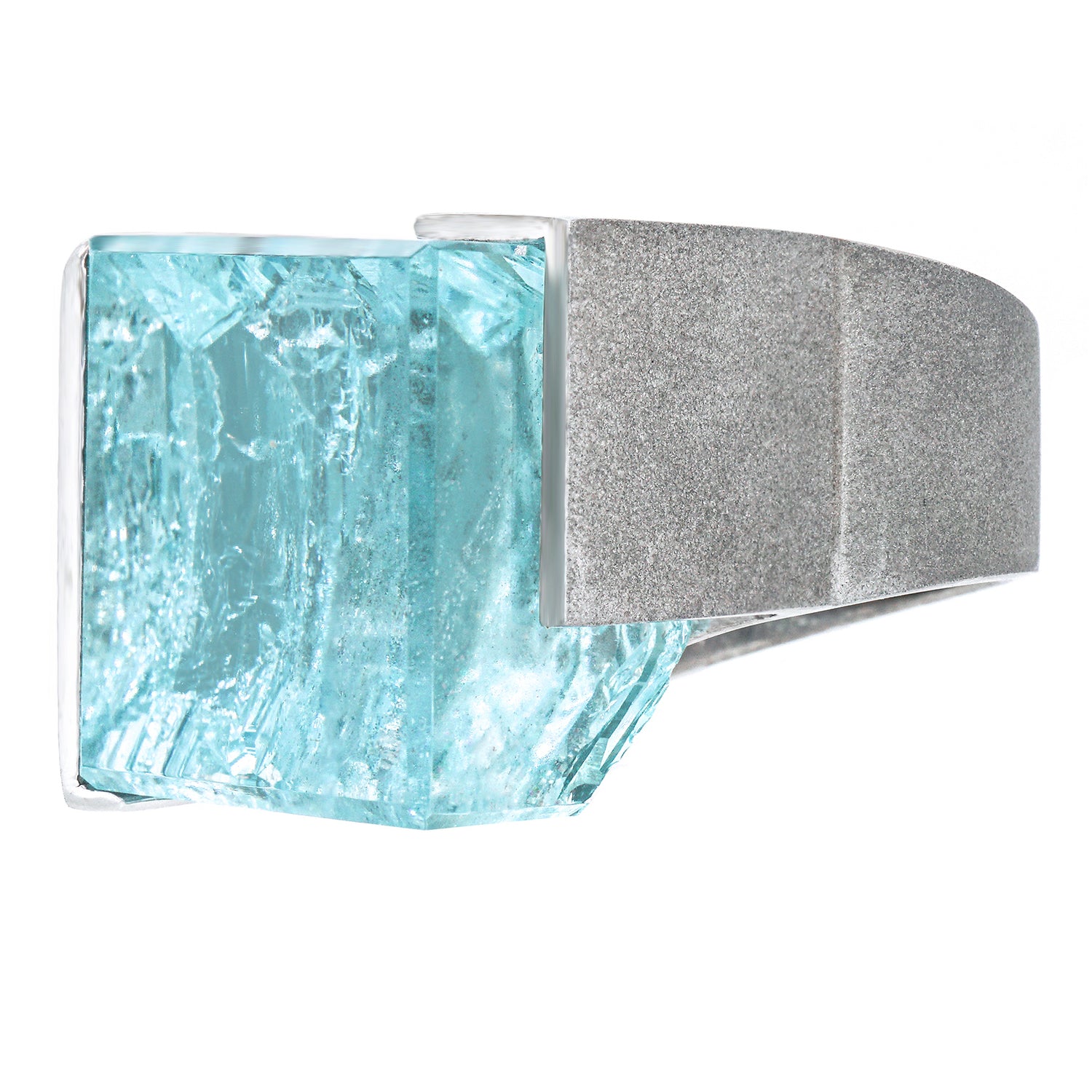 Circa 1970s, palladium, Switzerland.    This stunning one-of-a-kind ring features a magnificent 48.60-carat cube of aquamarine in a sleek Swiss Modern frame. The highly dimensional, textured palladium is juxtaposed with the brutalist landscape of the stone for a raw, highly sculptural visual experience. Meticulously fabricated, this ring is in excellent condition.
