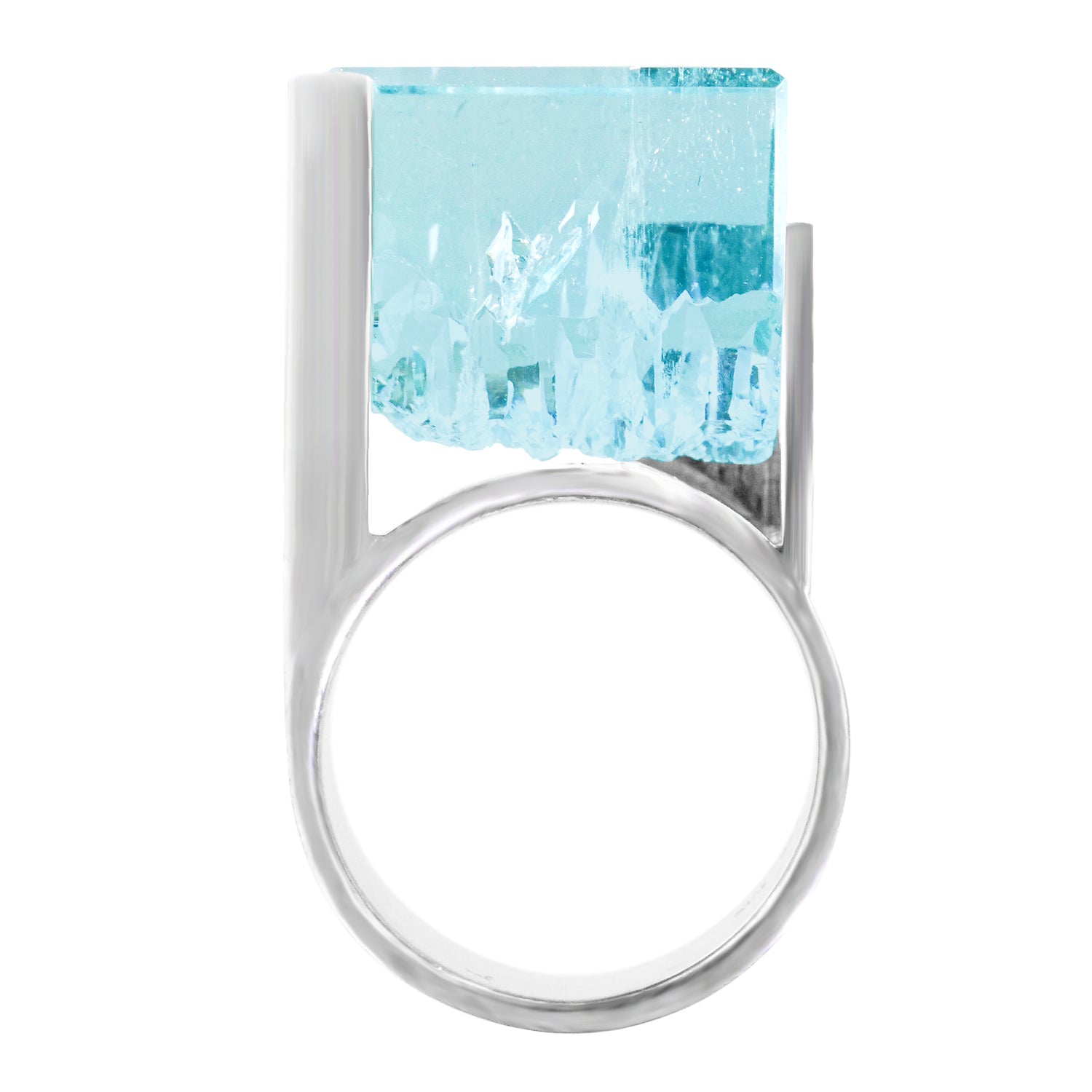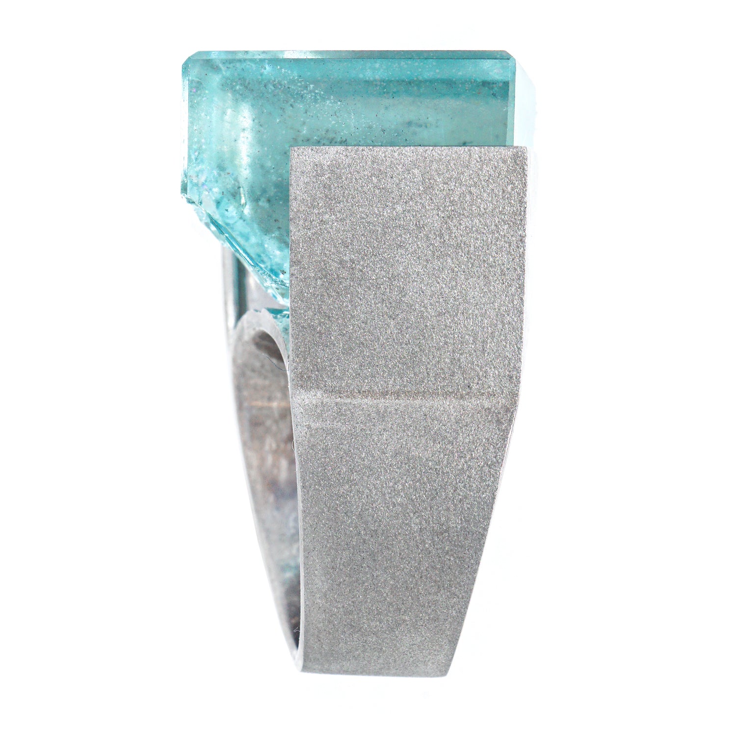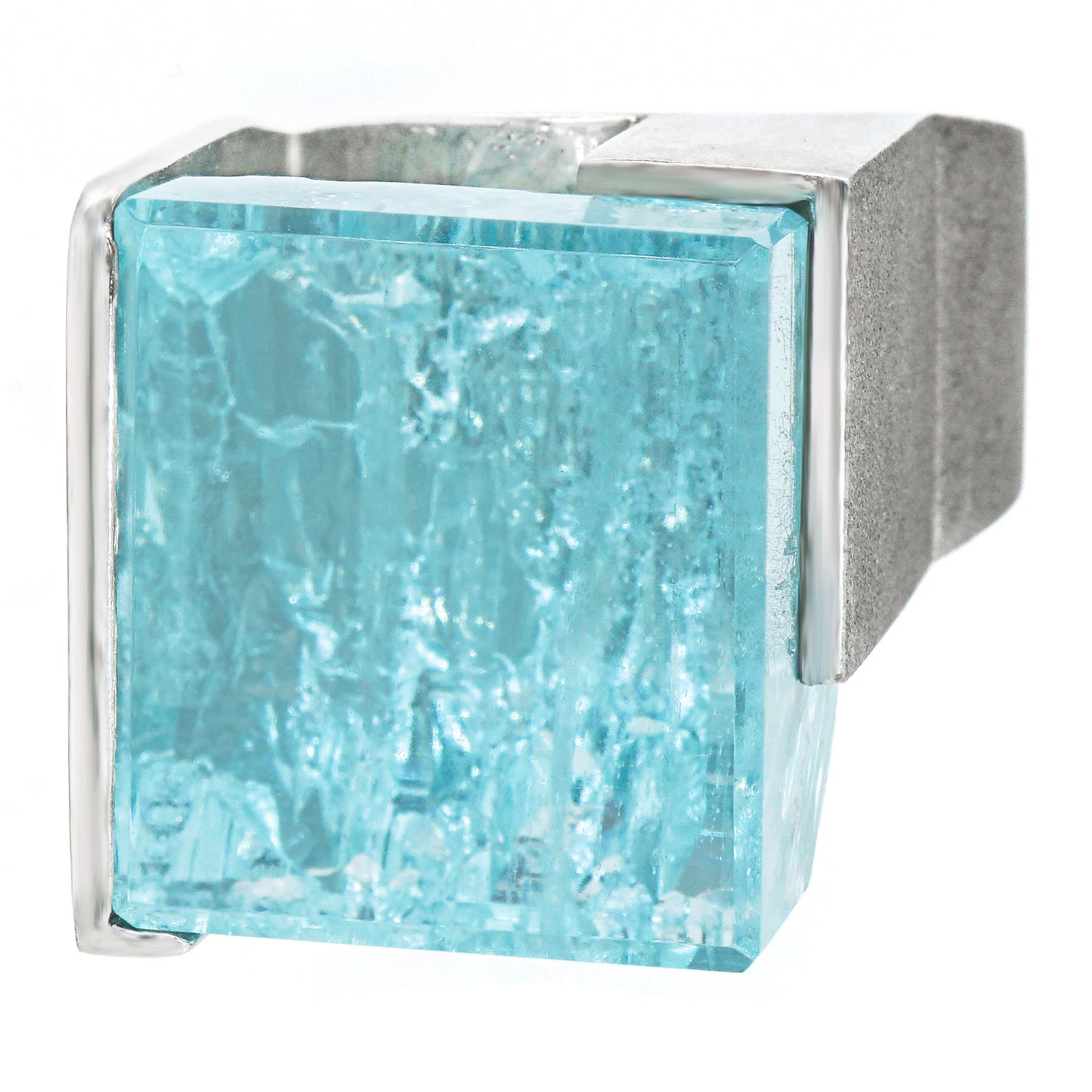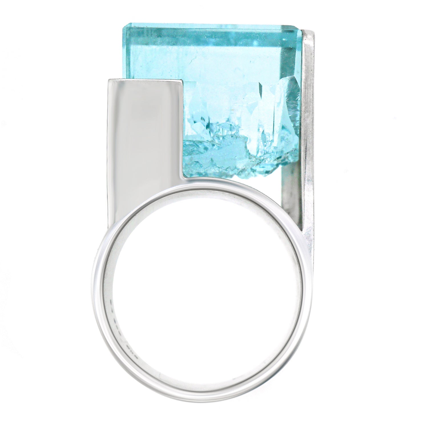 Circa 1970s, palladium, Switzerland.    This stunning one-of-a-kind ring features a magnificent 48.60-carat cube of aquamarine in a sleek Swiss Modern frame. The highly dimensional, textured palladium is juxtaposed with the brutalist landscape of the stone for a raw, highly sculptural visual experience. Meticulously fabricated, this ring is in excellent condition.