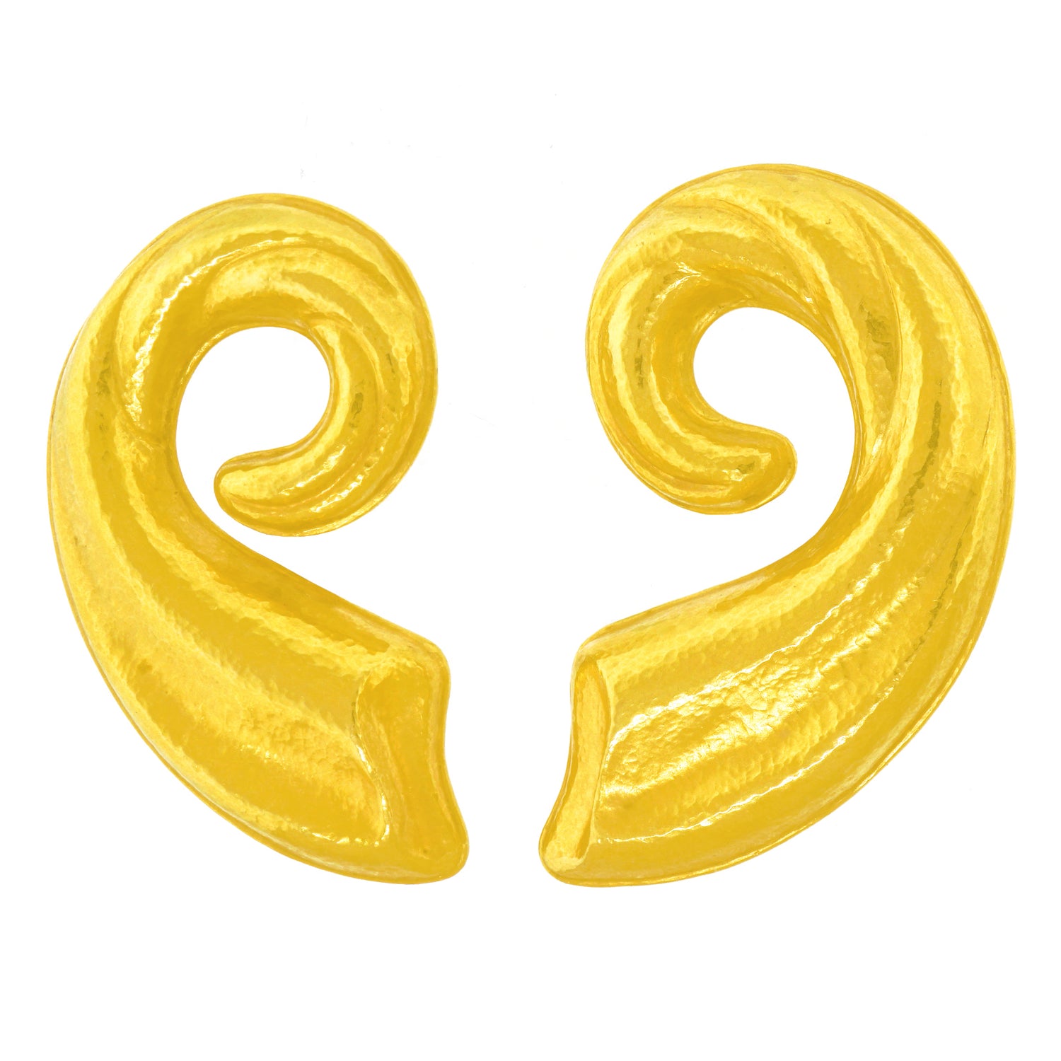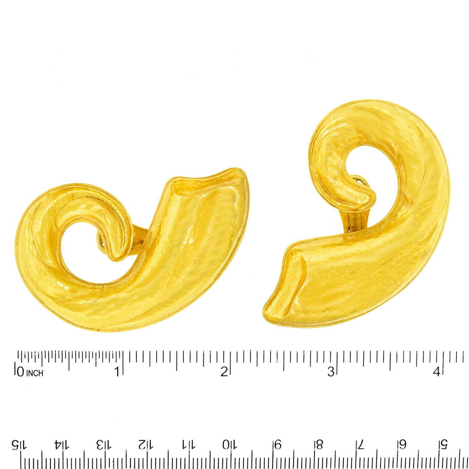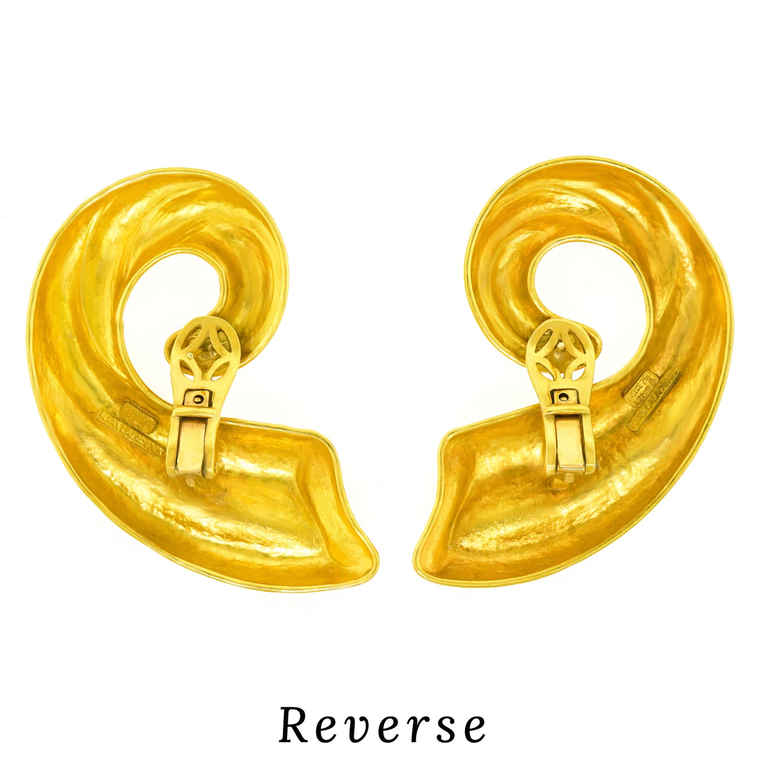 Circa 1970s, 18k, by Lalaounis, Greece. Simple is elegant. Primitive is sophisticated. From Aboriginal petroglyphs to modern art, Paleolithic spirals, one of Ilias Lalaounis' favorite motifs, are found in cultures the world over. These earrings are chic, well-made larger examples of his work. Excellent condition.