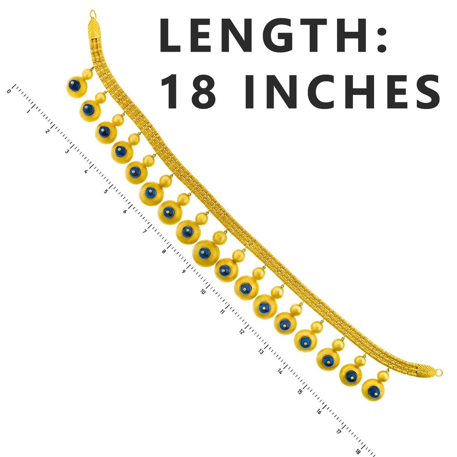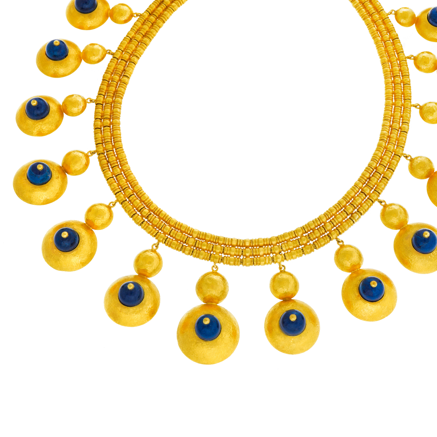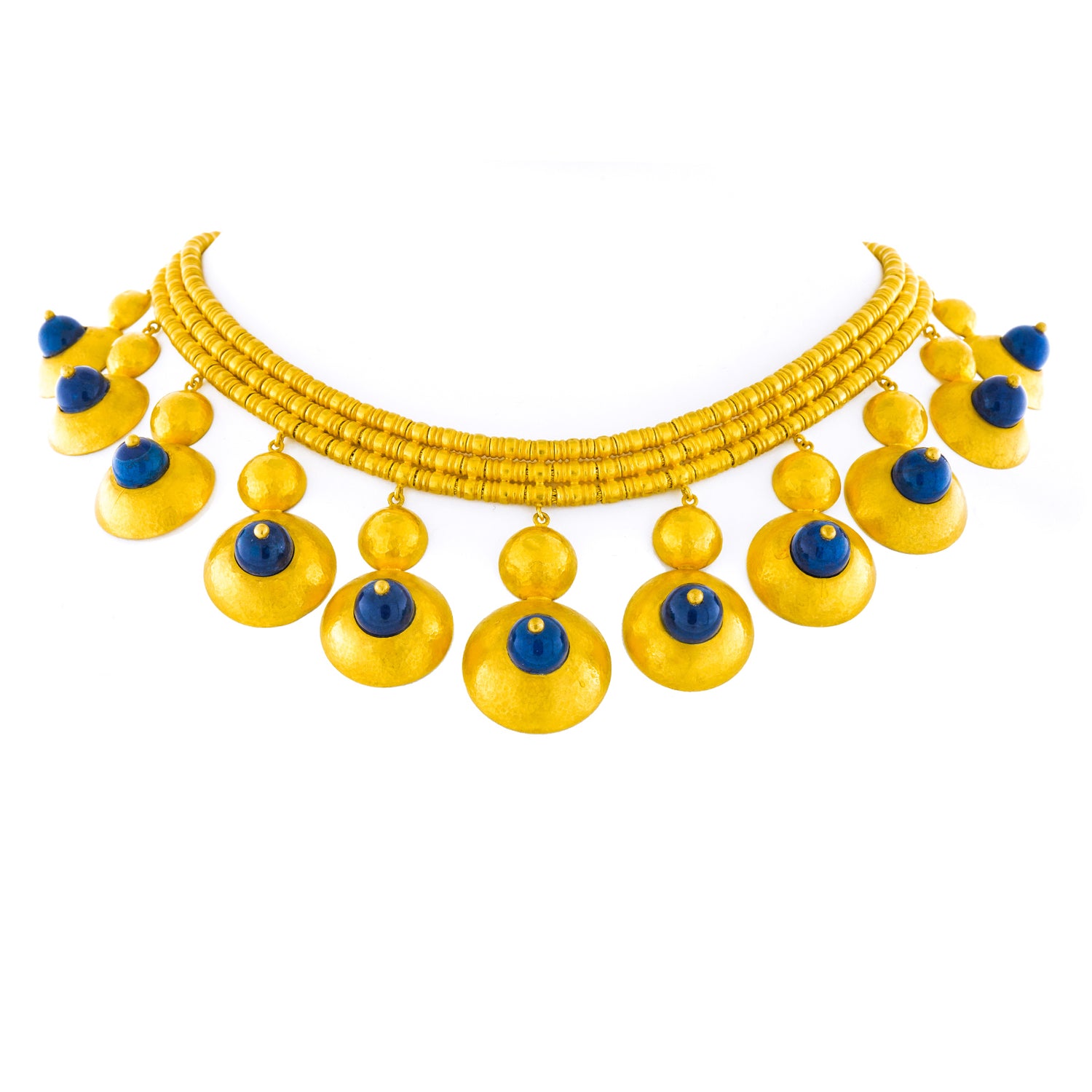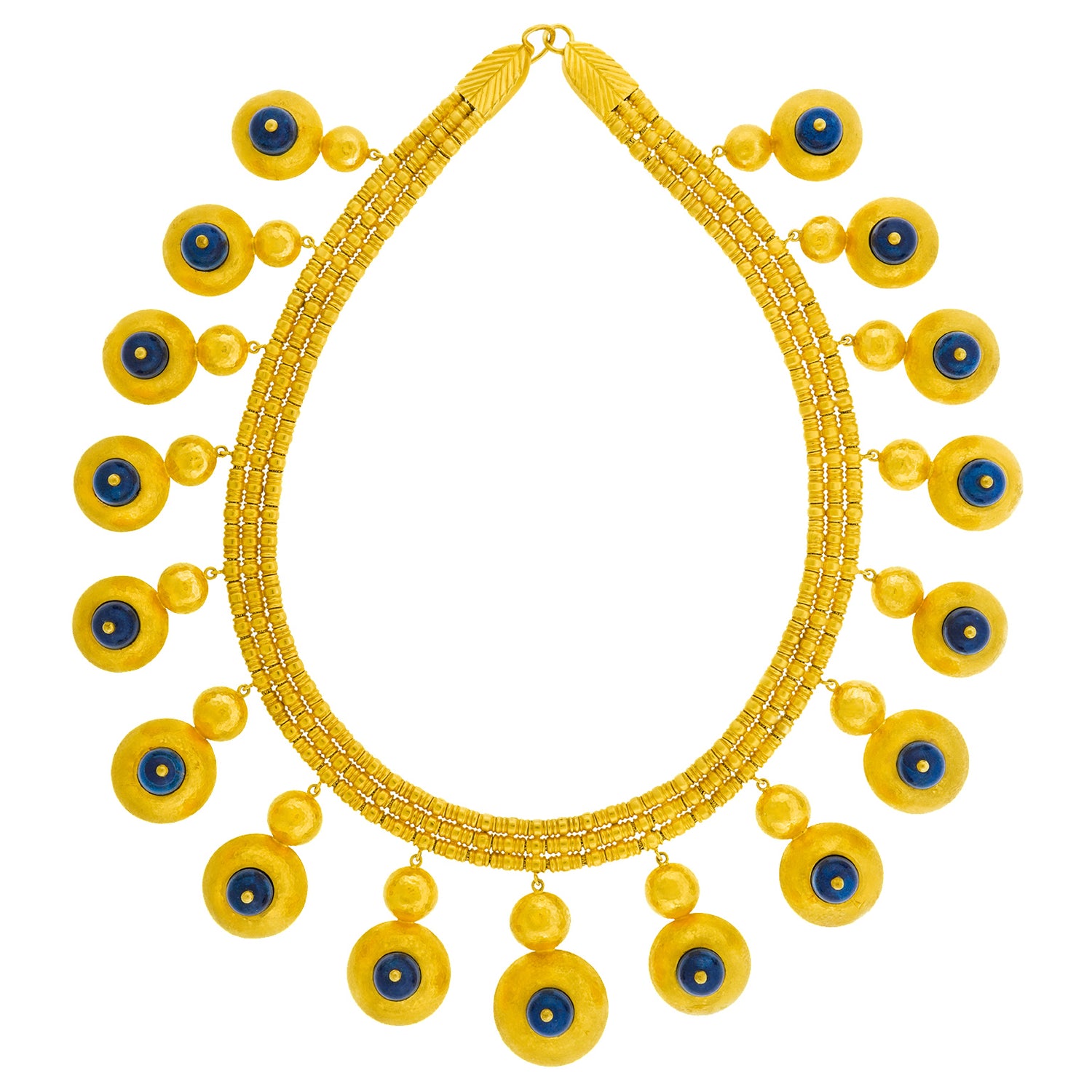 Circa 1960s, 22k, by Ilias Lalaounis, Greece. This boldly stylish gold necklace by Lalaounis features lapis-set festoons. With flirty movement, they also delicately chime! Ilias Lalaounis was a visionary creating jewelry based on classical Greek, archaic, and ethnic themes. As an added bonus, this necklace is one of the rare earlier examples made in 22-karat gold, instead of 18k. Meticulously handcrafted, this necklace is in excellent condition.