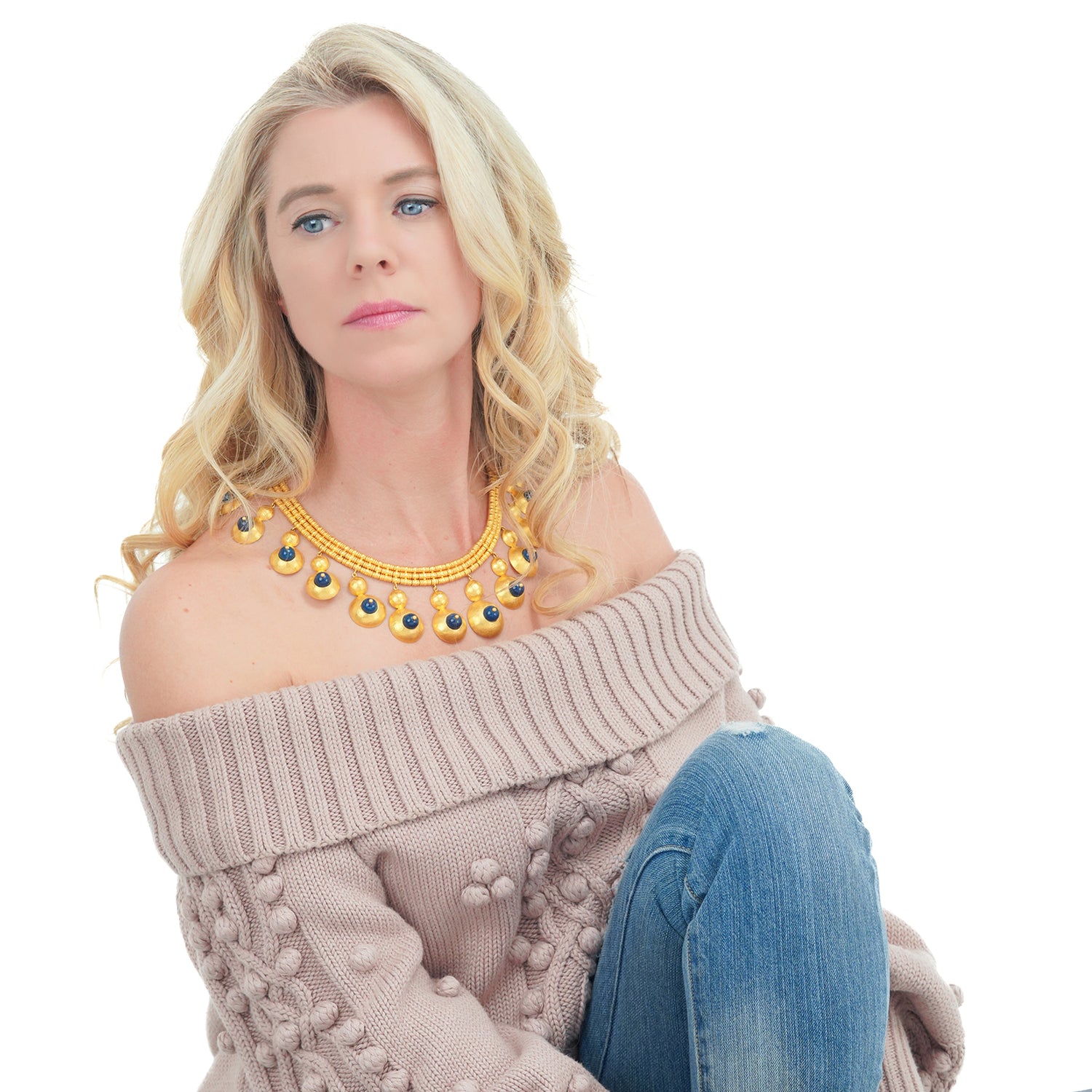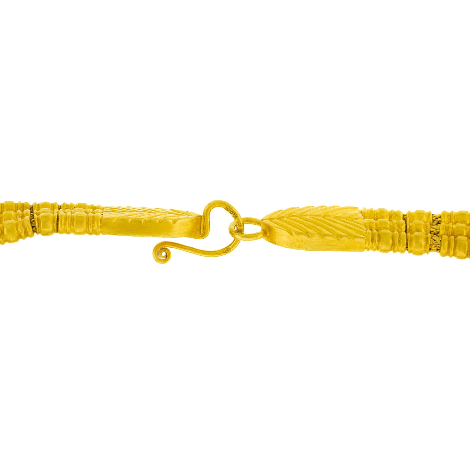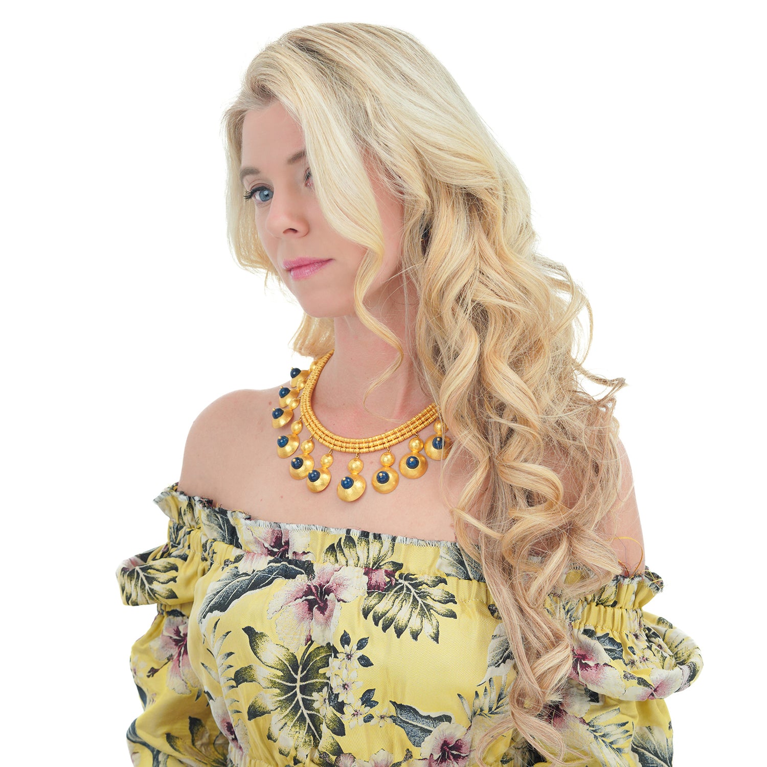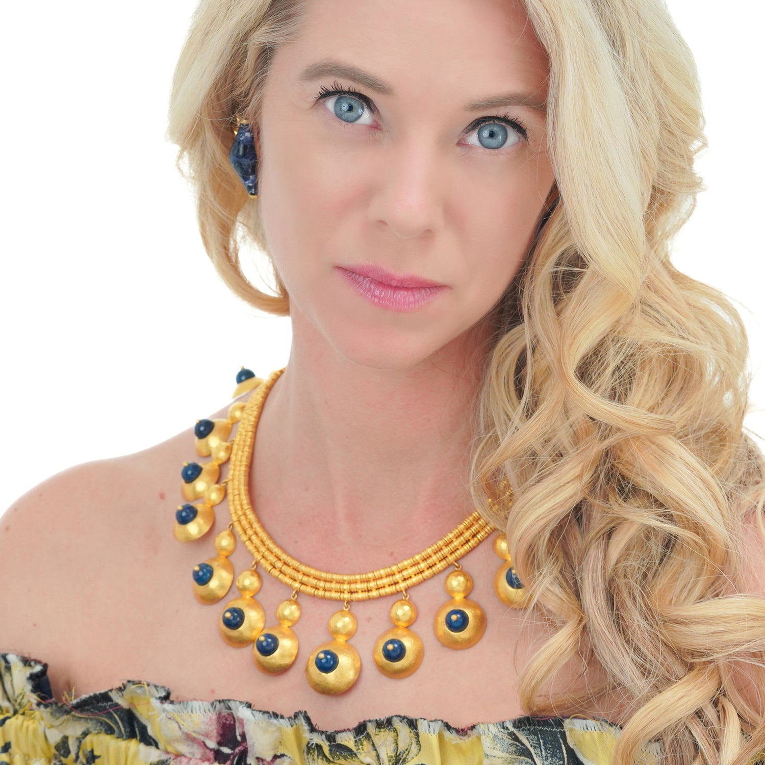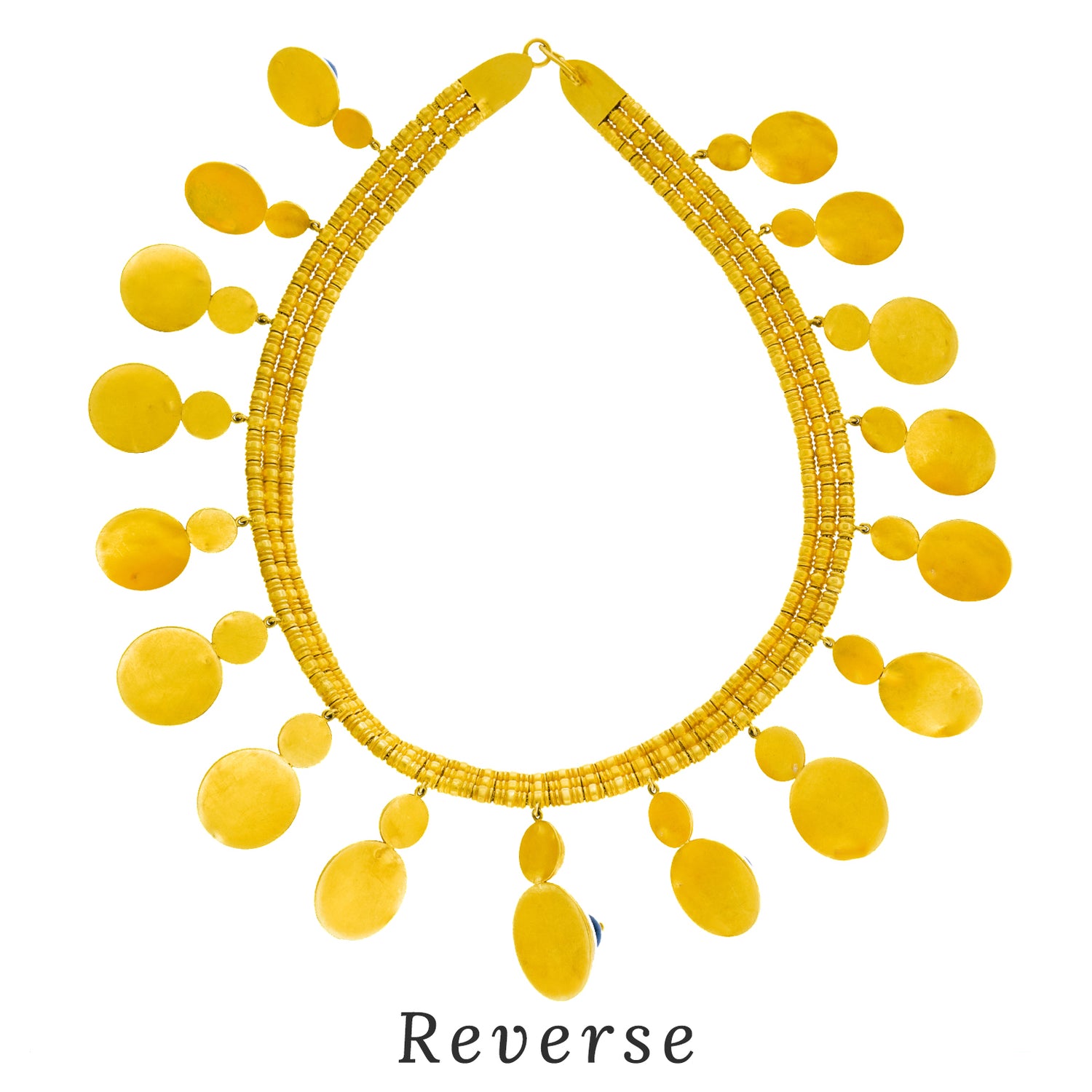 Circa 1960s, 22k, by Ilias Lalaounis, Greece. This boldly stylish gold necklace by Lalaounis features lapis-set festoons. With flirty movement, they also delicately chime! Ilias Lalaounis was a visionary creating jewelry based on classical Greek, archaic, and ethnic themes. As an added bonus, this necklace is one of the rare earlier examples made in 22-karat gold, instead of 18k. Meticulously handcrafted, this necklace is in excellent condition.