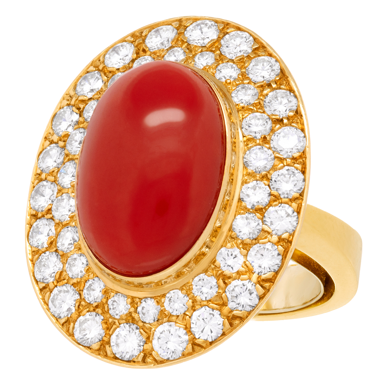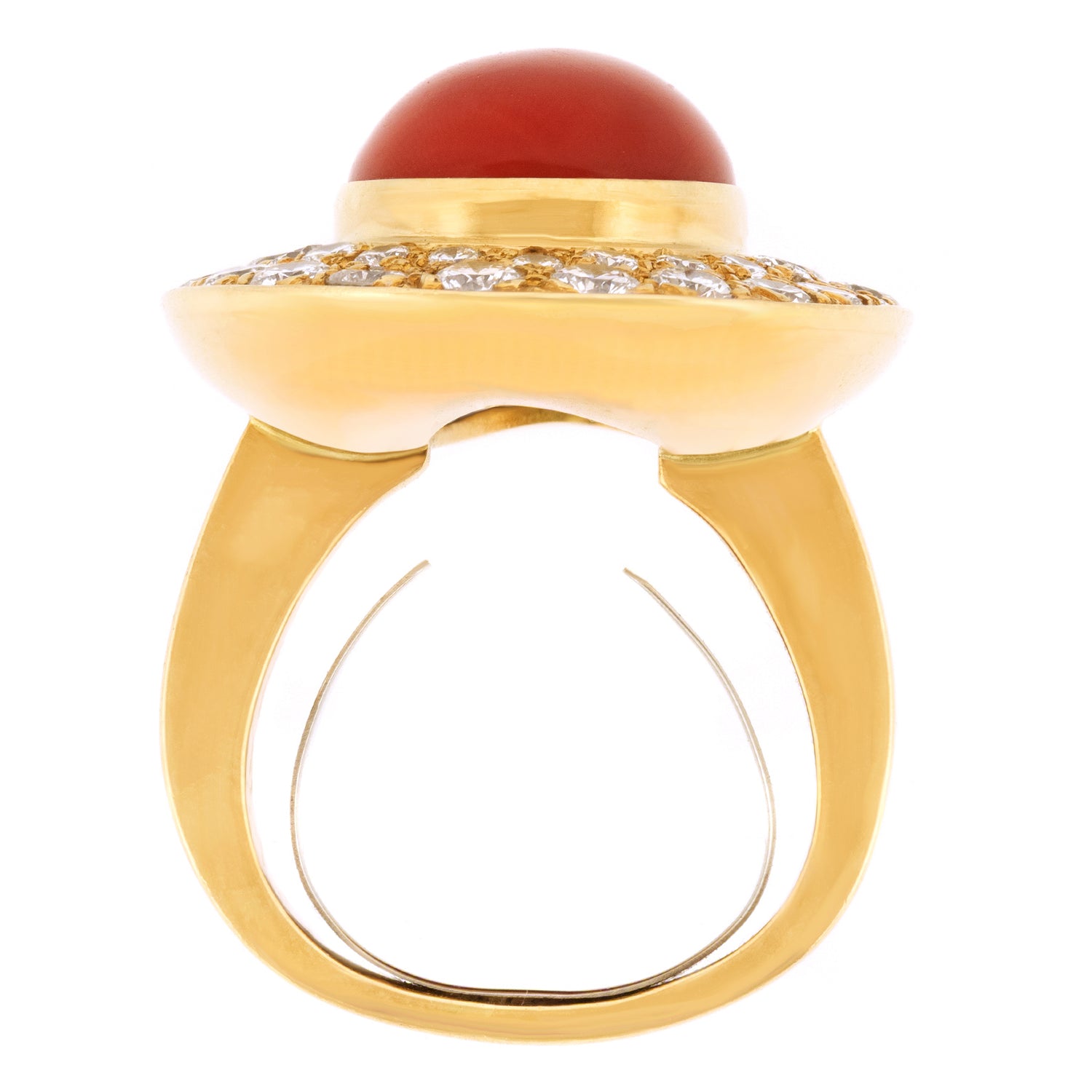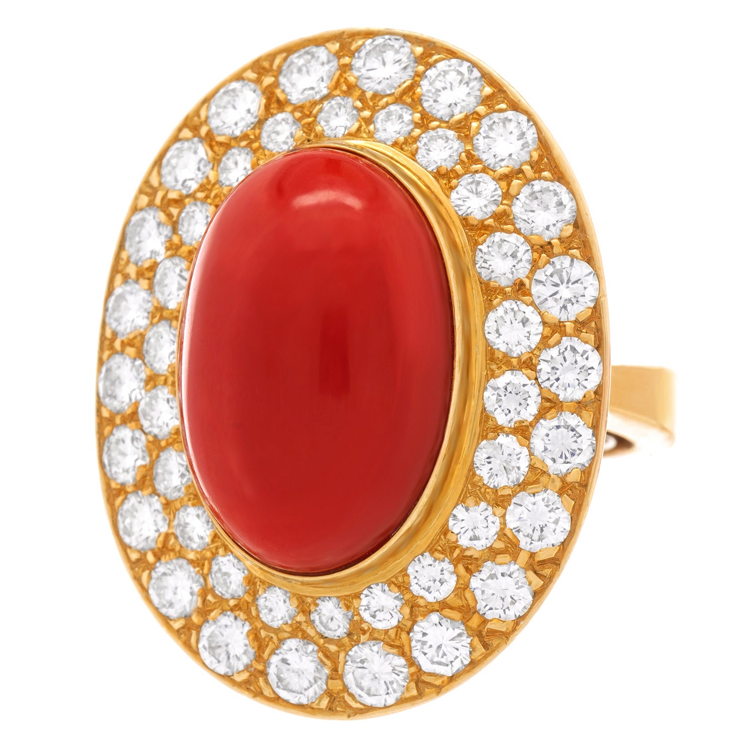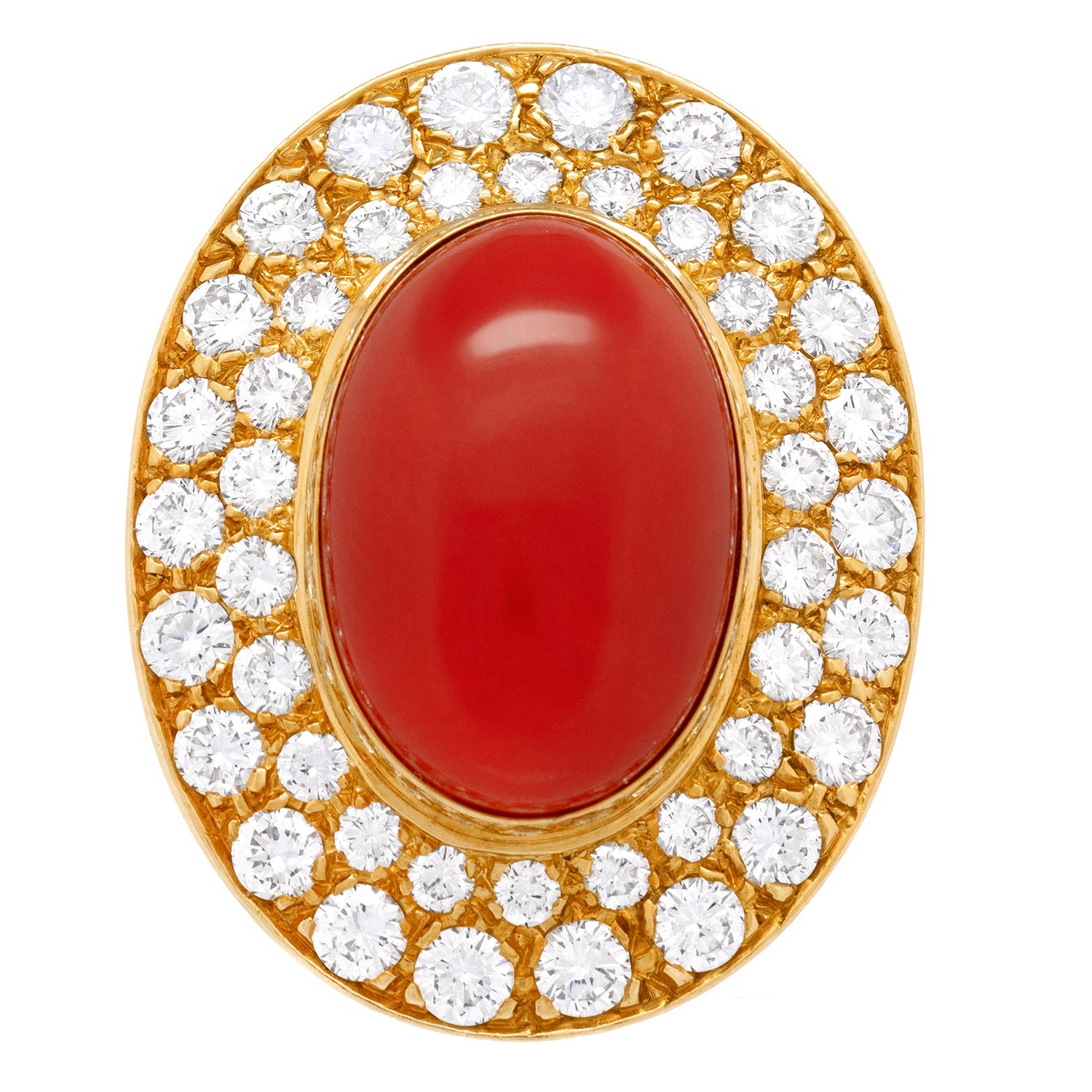 Circa 1960s, 18k, Swiss. This glamorous sixties ring features a large finely hued coral cabochon in a sparkly frame set with five carats of brilliant white diamonds (G-F color, VS clarity). The coral is of the finest quality, its color and surface are spectacular. Exquisitely fashioned, it is in excellent condition.