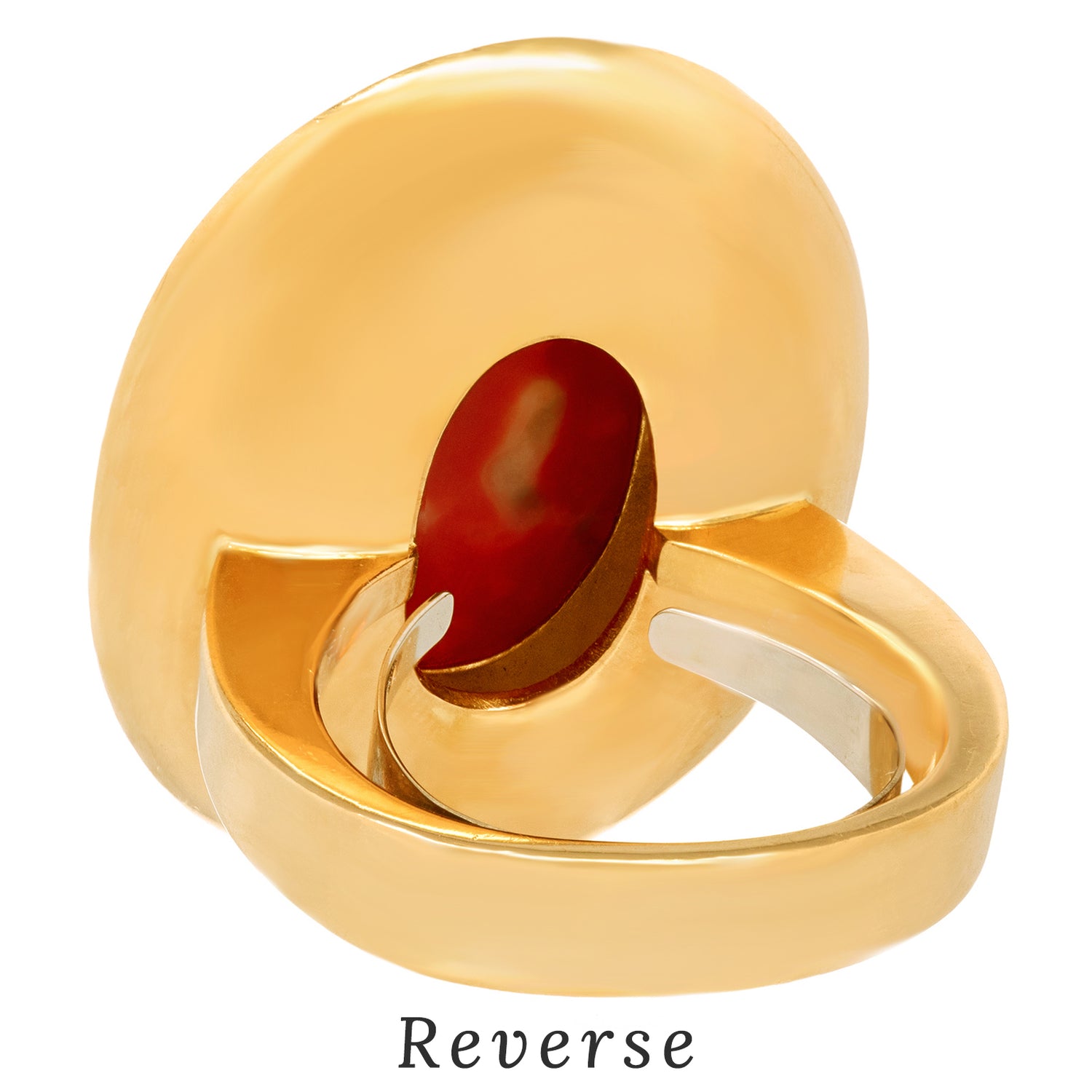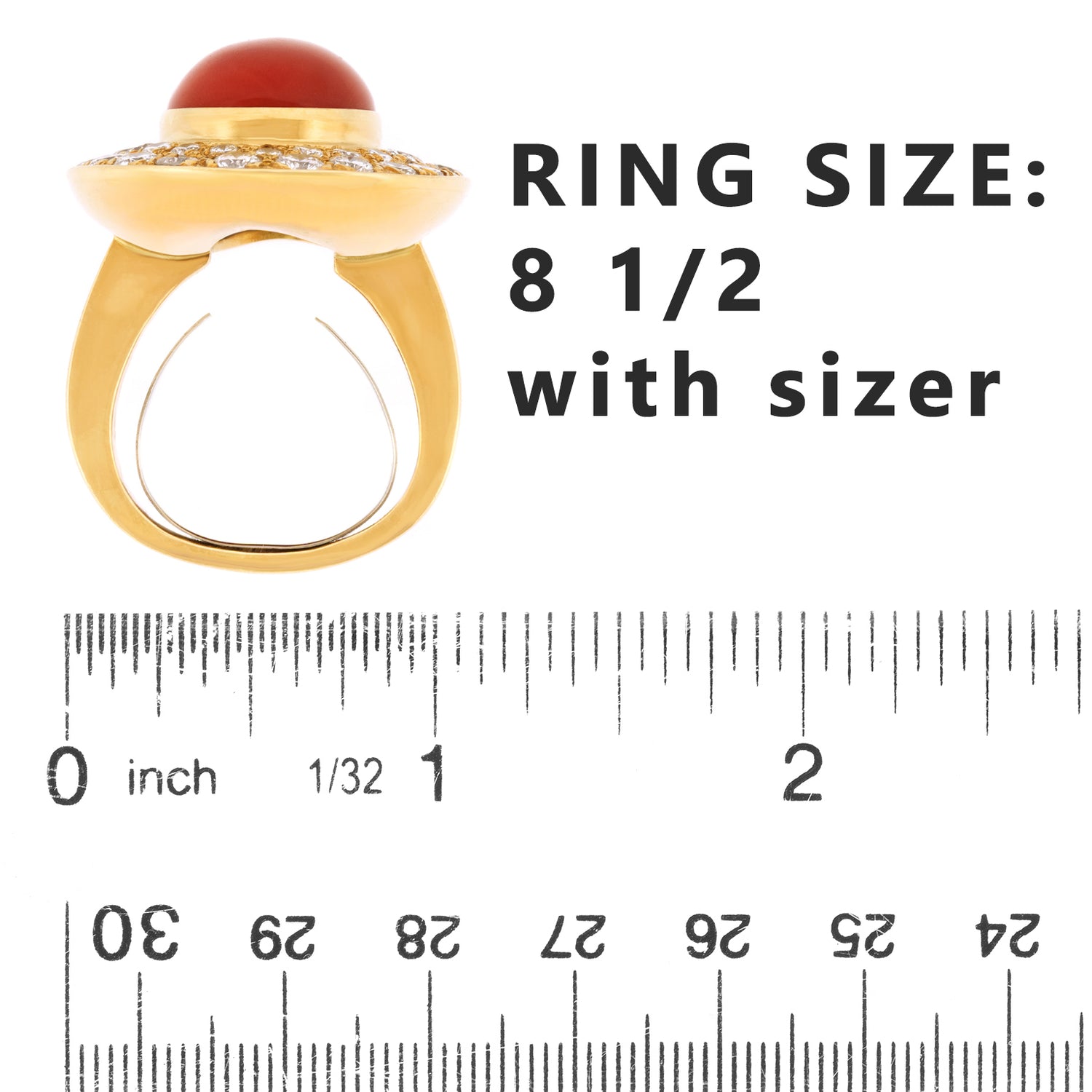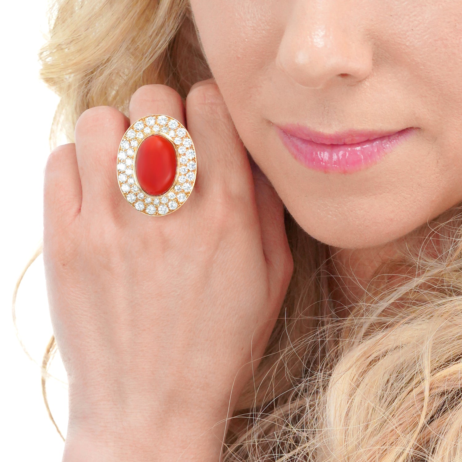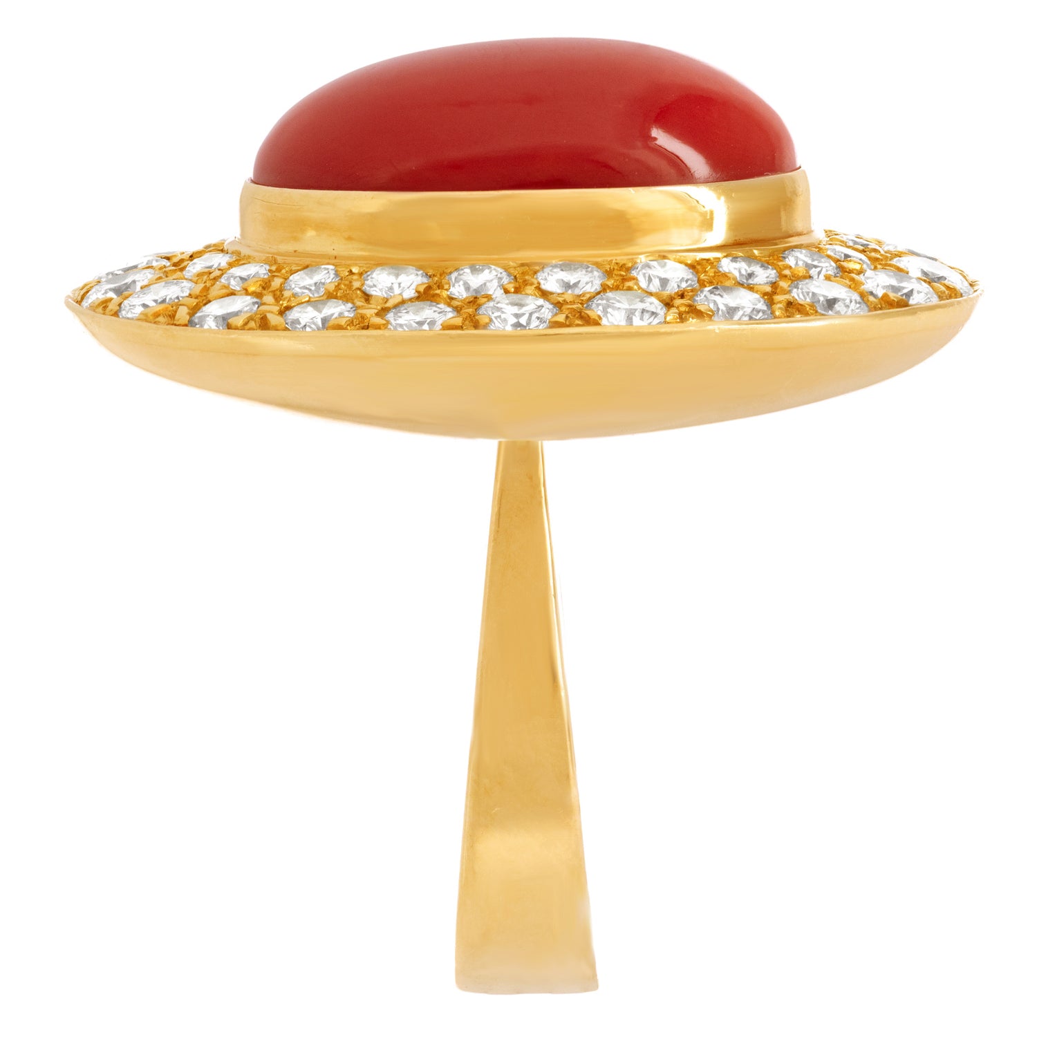Circa 1960s, 18k, Swiss. This glamorous sixties ring features a large finely hued coral cabochon in a sparkly frame set with five carats of brilliant white diamonds (G-F color, VS clarity). The coral is of the finest quality, its color and surface are spectacular. Exquisitely fashioned, it is in excellent condition.