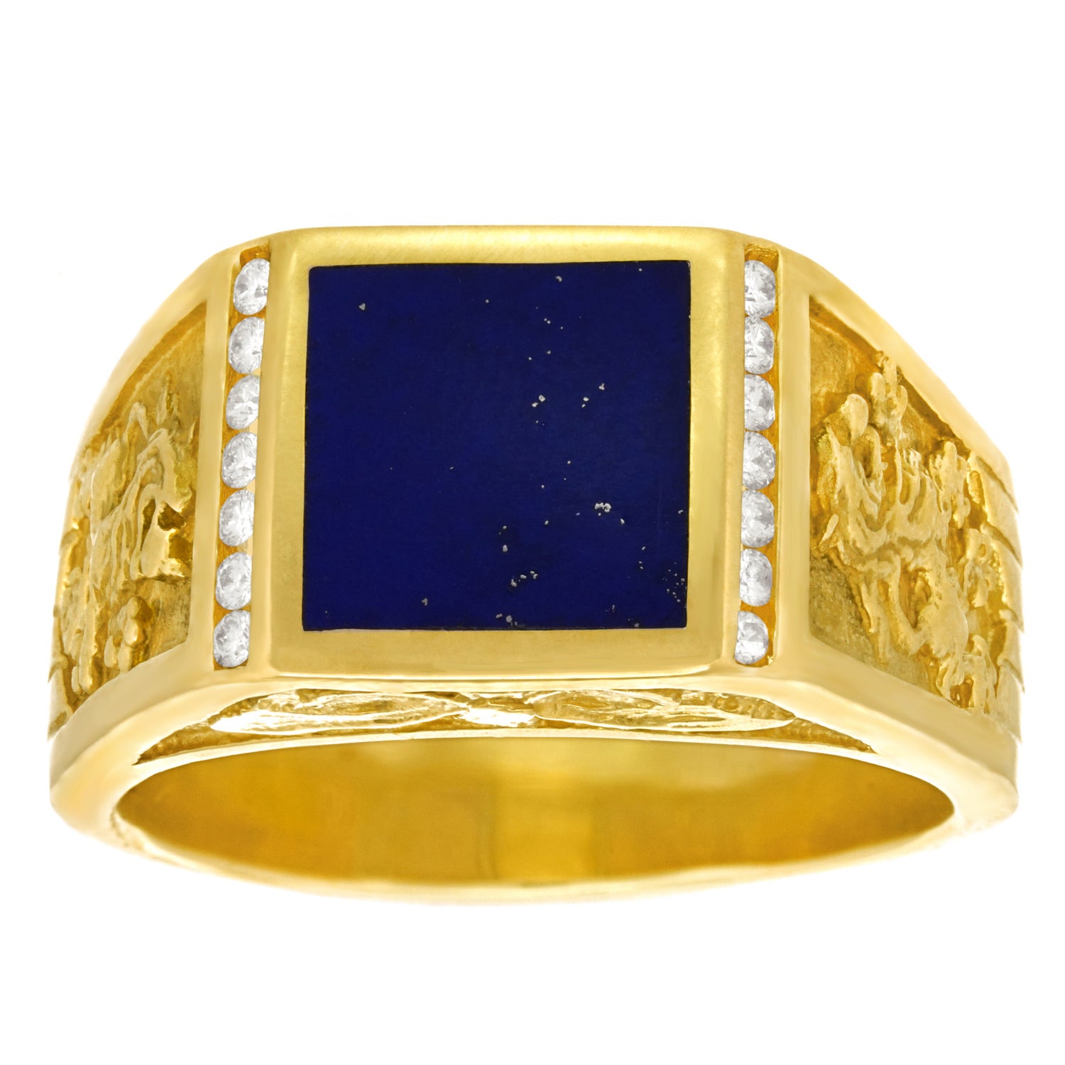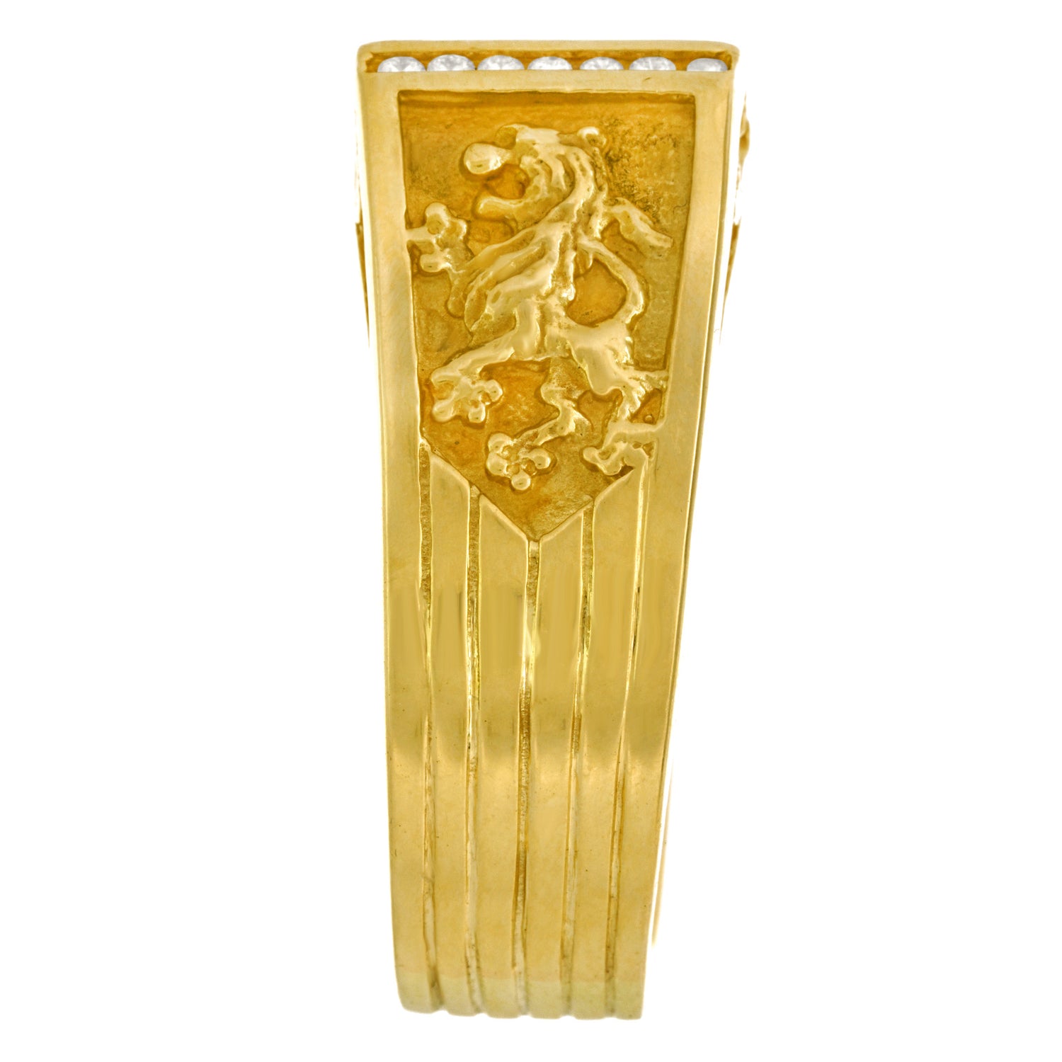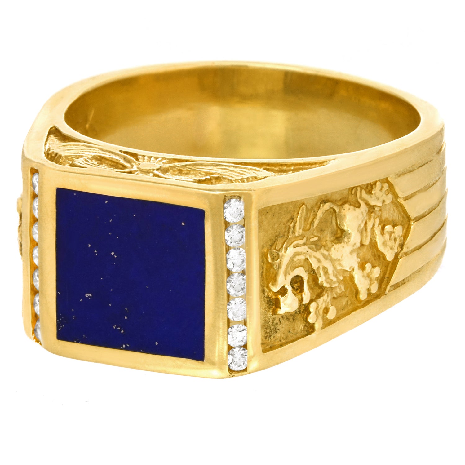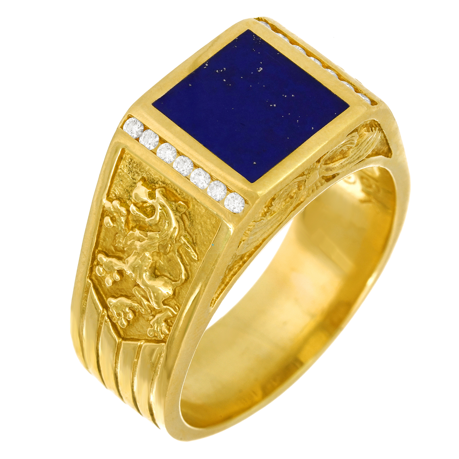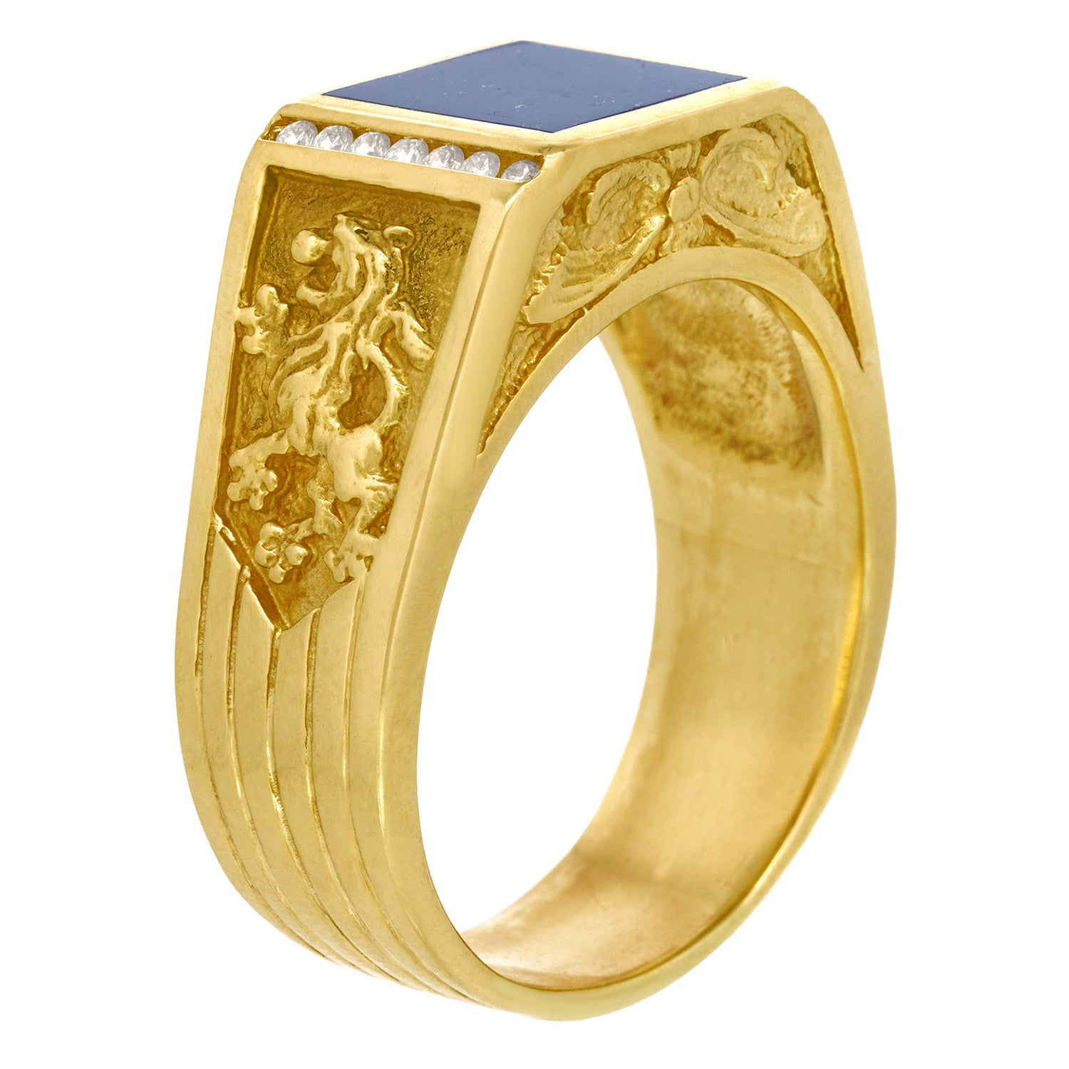 Circa 1960s, 18k, American. This spectacular men's ring is decorated with lions rampant and set with a fine lapis and brilliant white diamonds (.14 carats total weight of H color, VS clarity). This modern interpretation of a Renaissance finger ring is timeless, very, very heavy, exceedingly well made, comfortable, and in excellent condition.