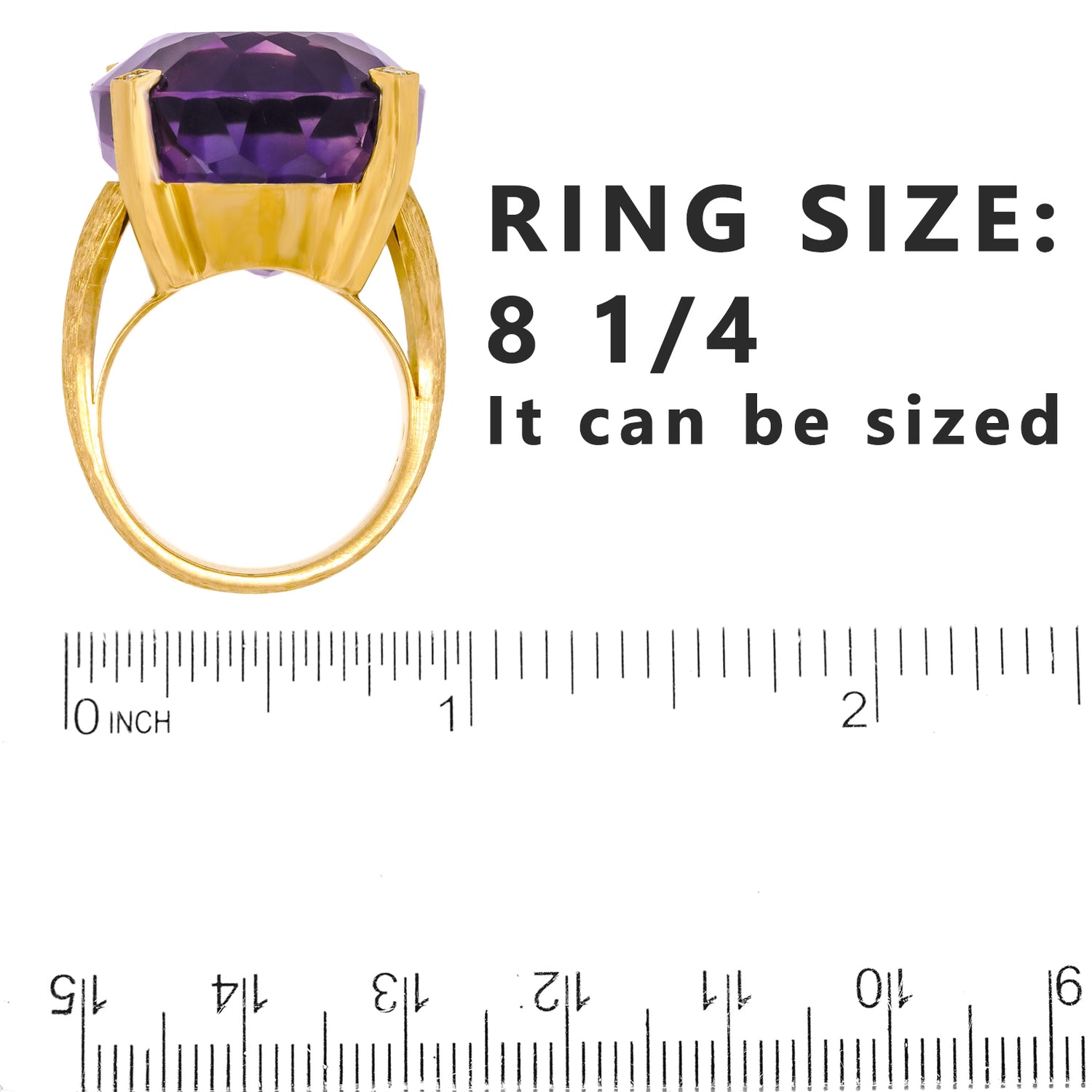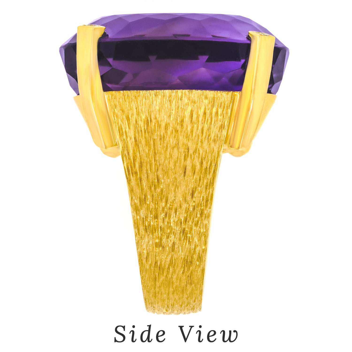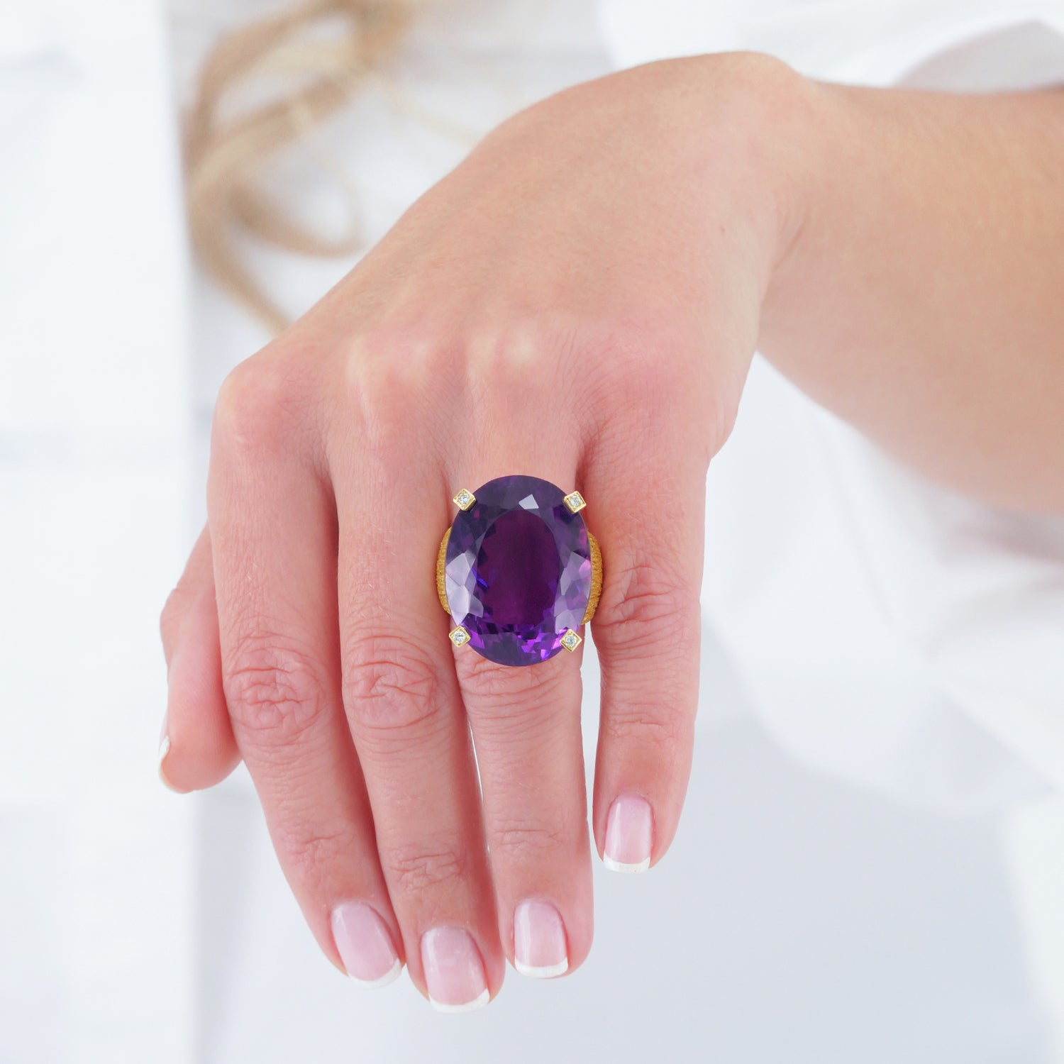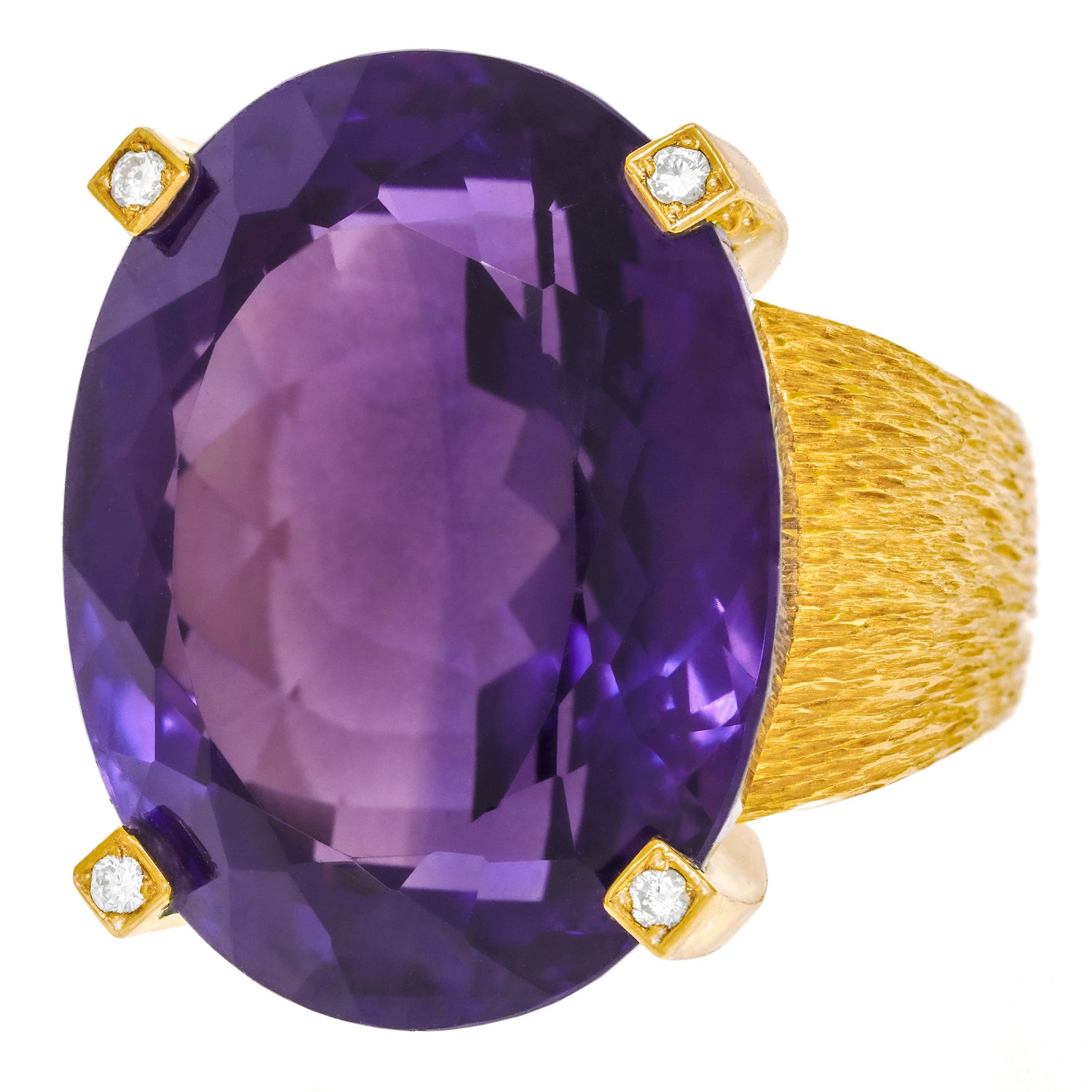 Circa 1970s, 18k, Switzerland.  This colorfully chic Modernist ring features a massive 40.0-carat amethyst. This gorgeous deeply-hued purple stone beautifully complements the minimalist contemporary design. The body of the ring is hand-textured and diamonds accent the four prongs for that something extra! Handmade in eighteen-karat yellow gold, this ring is in excellent condition.
