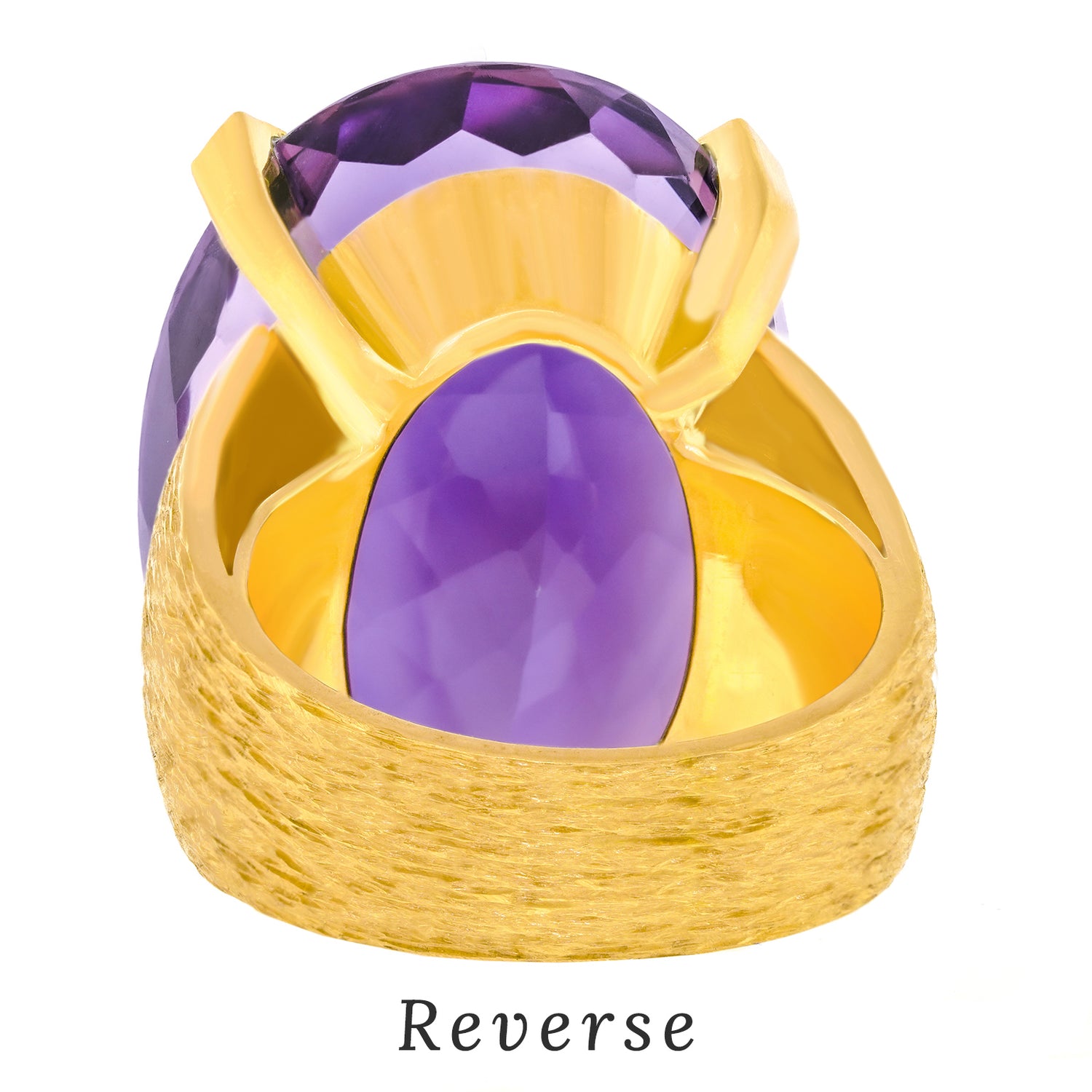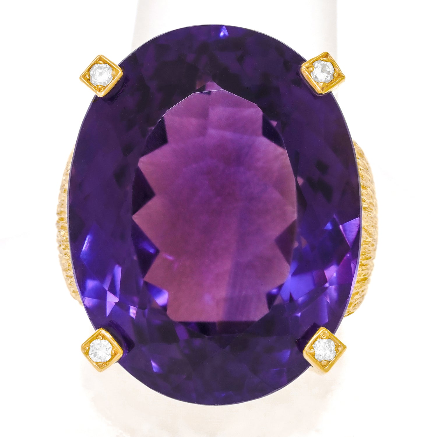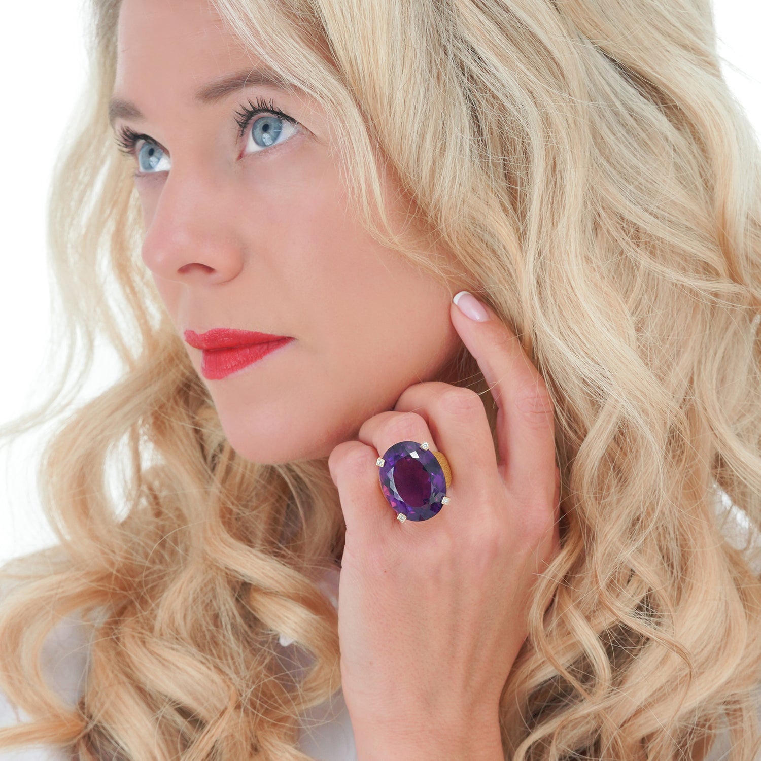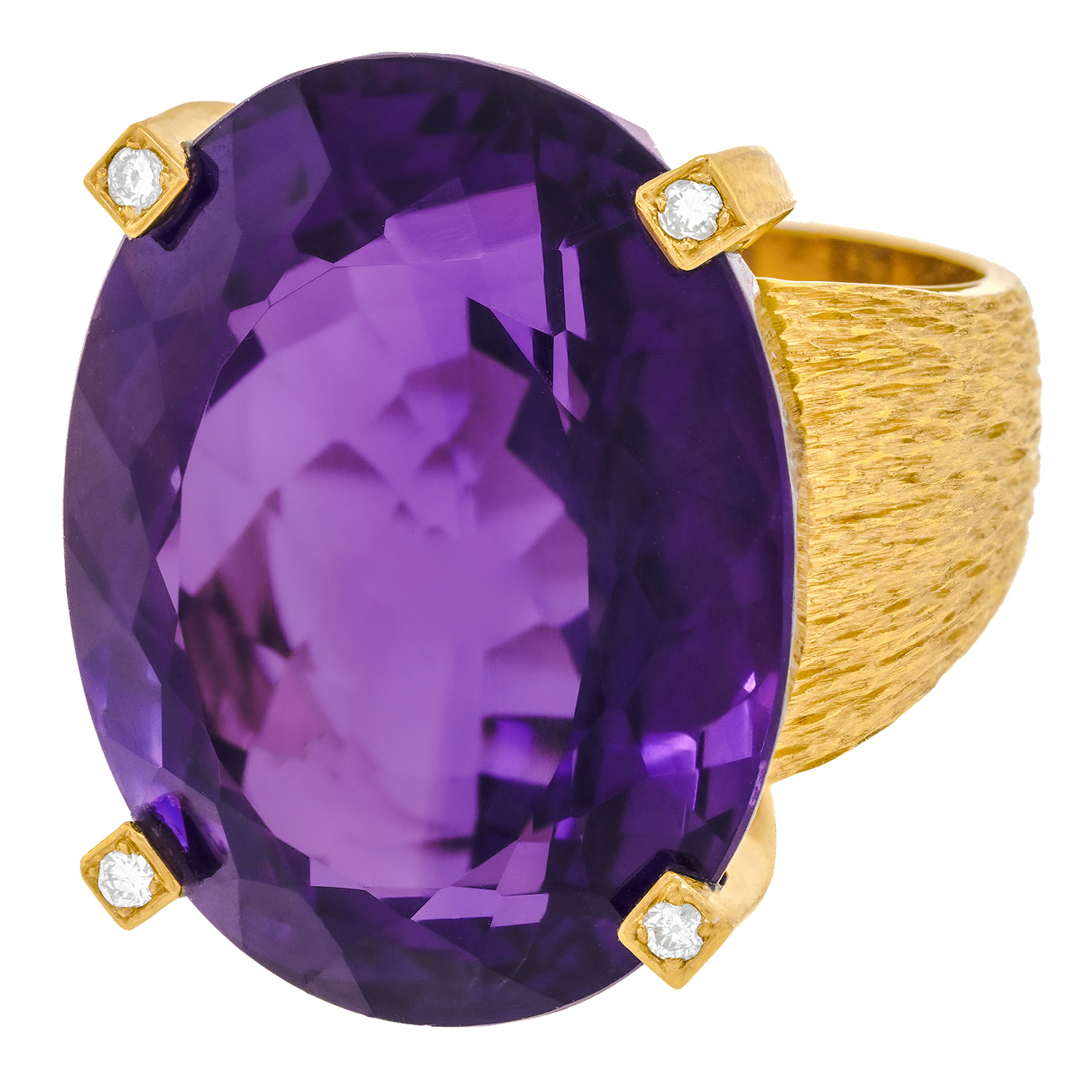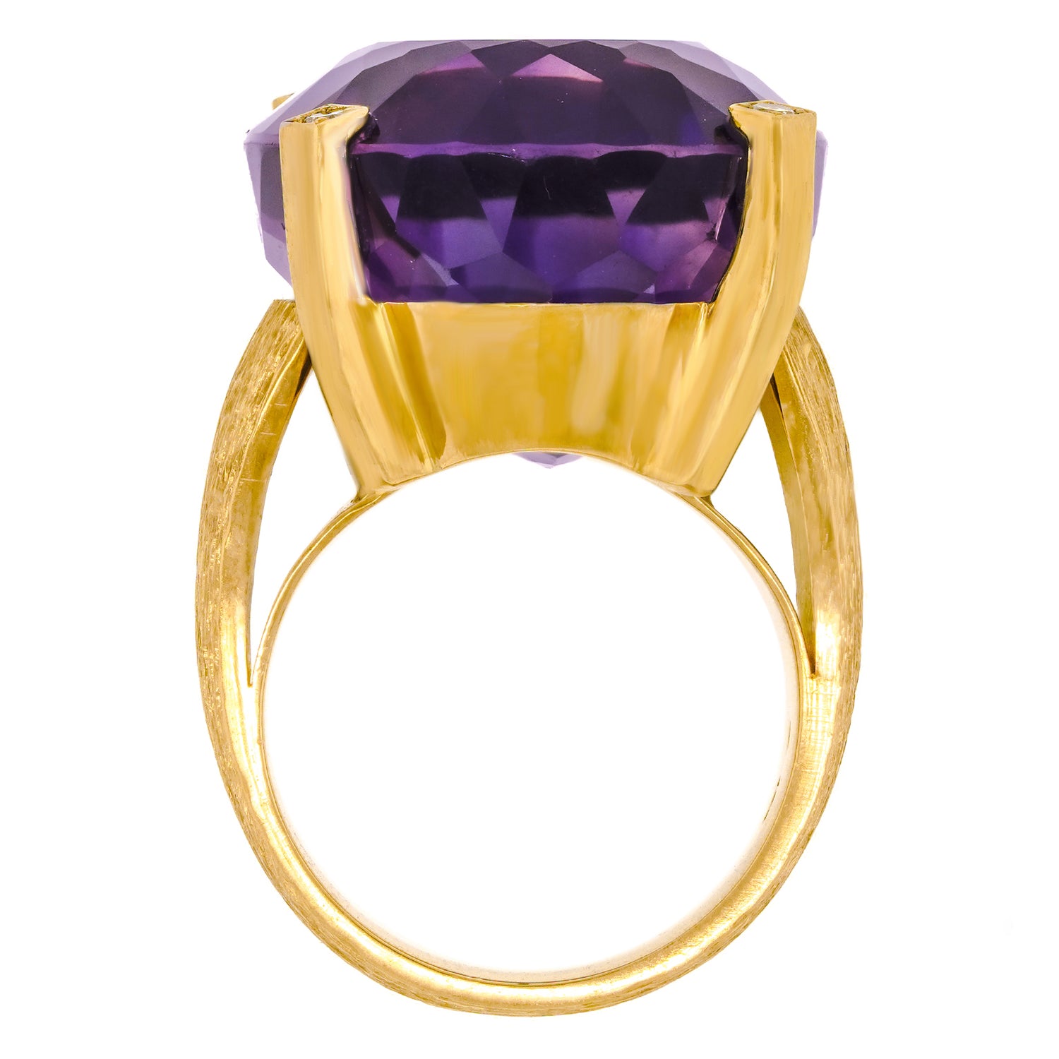Circa 1970s, 18k, Switzerland.  This colorfully chic Modernist ring features a massive 40.0-carat amethyst. This gorgeous deeply-hued purple stone beautifully complements the minimalist contemporary design. The body of the ring is hand-textured and diamonds accent the four prongs for that something extra! Handmade in eighteen-karat yellow gold, this ring is in excellent condition.