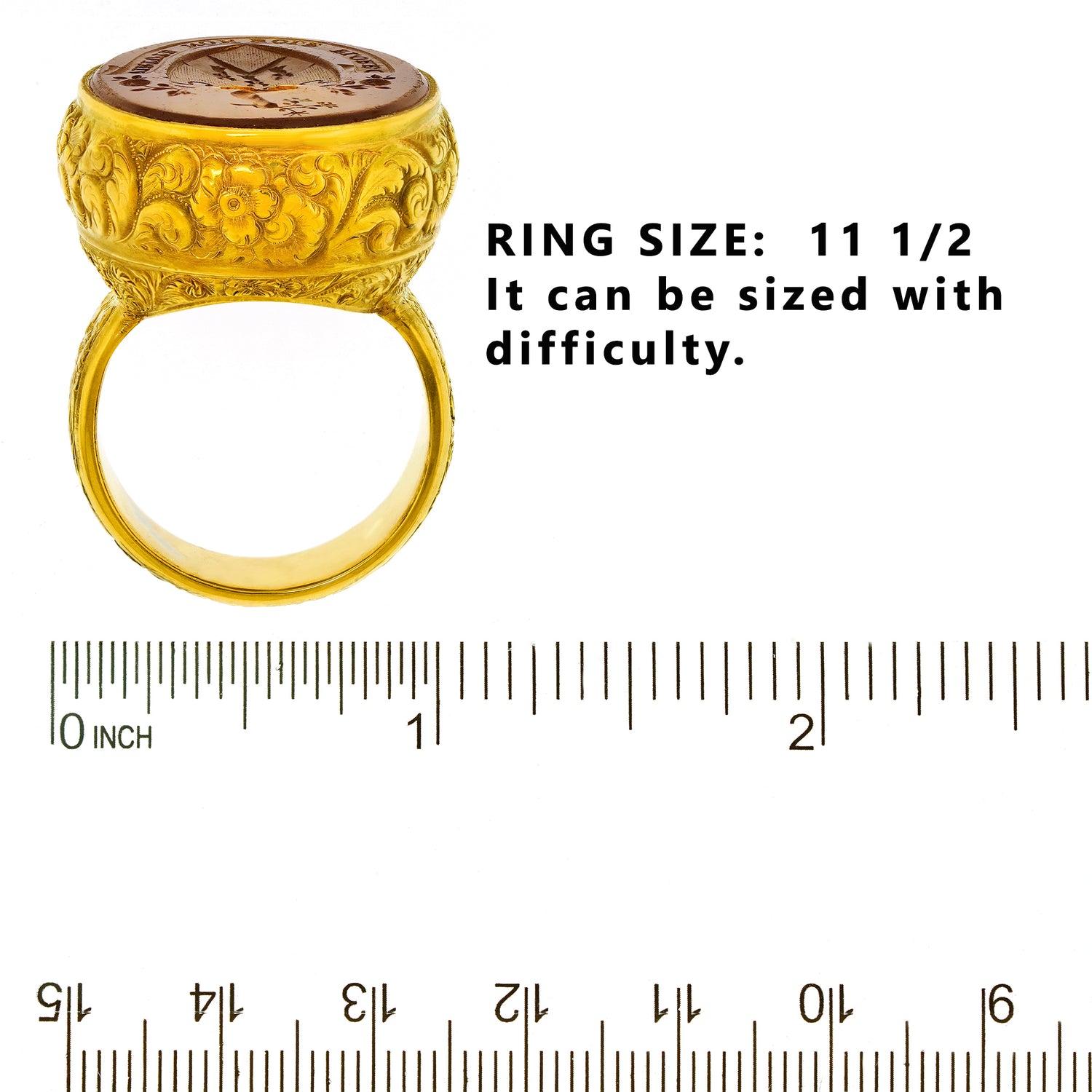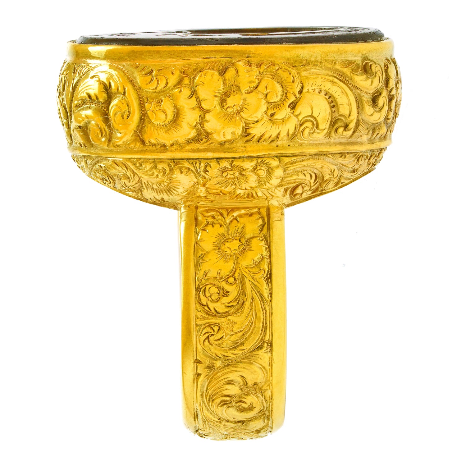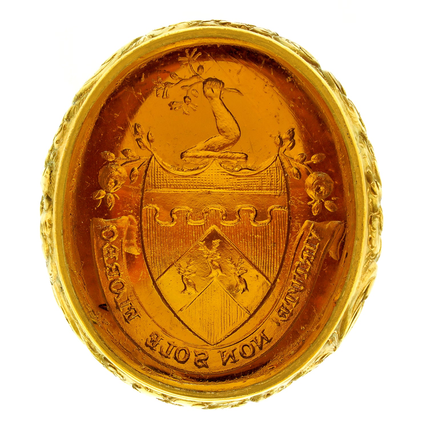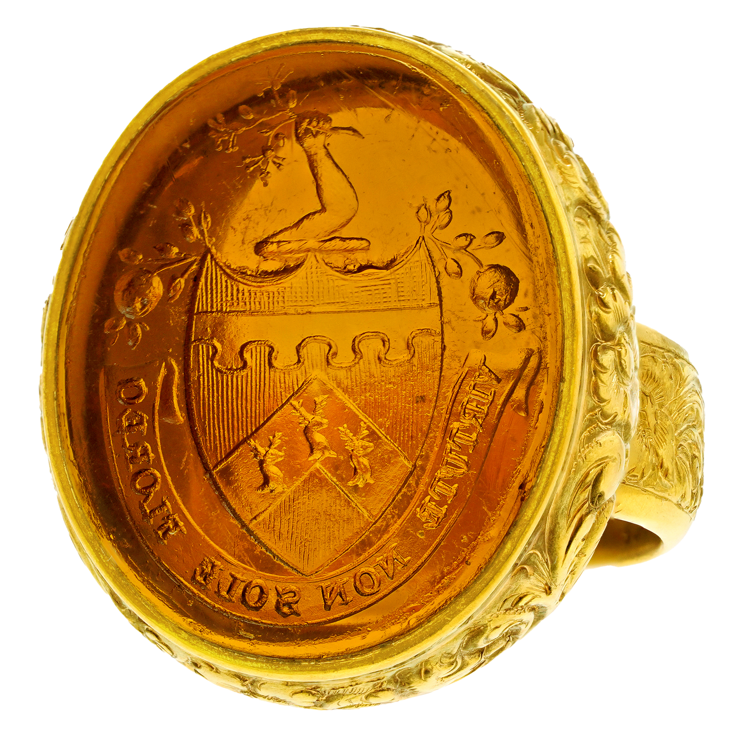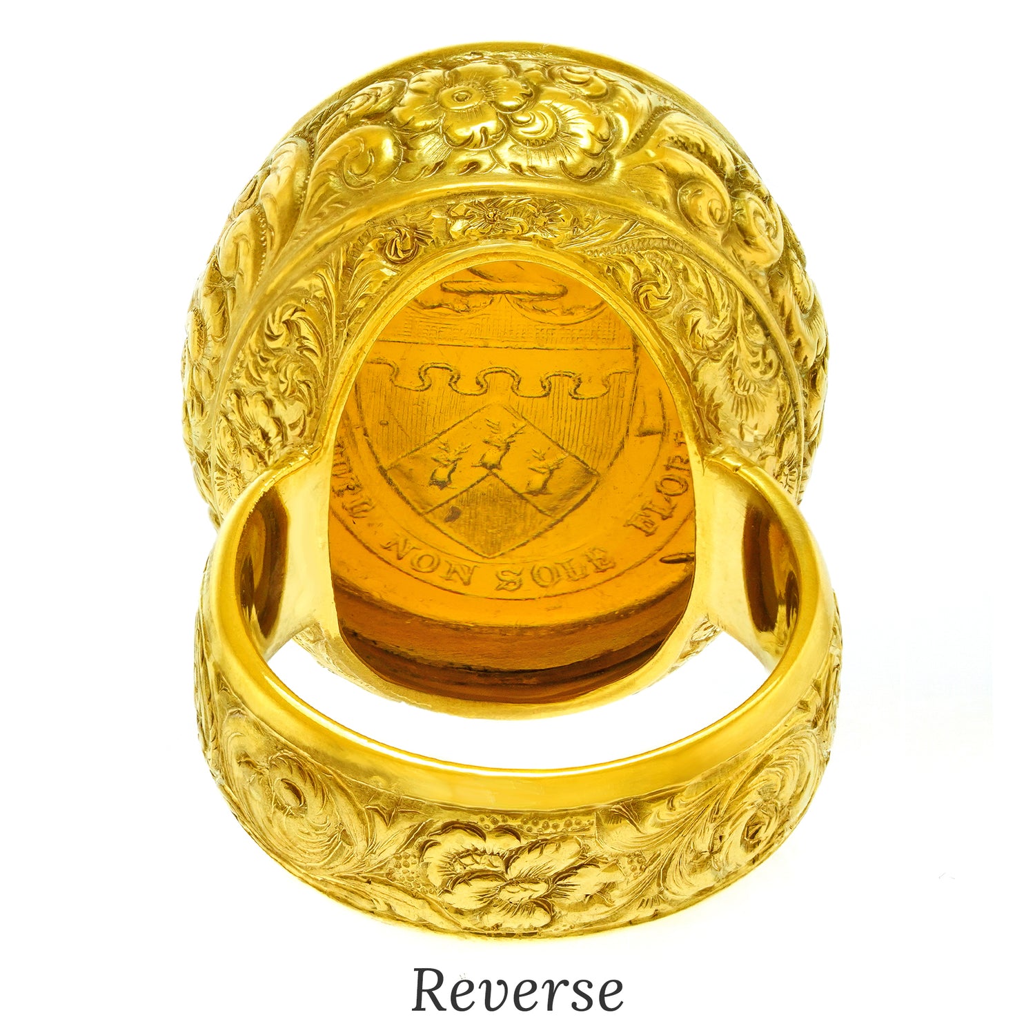 Circa 1890s, 18k. This gorgeous 18k yellow gold seal ring was made to a massive scale. The bold town and country look features a stunning hardstone seal, underscored by abundant hand-chased details. The seal features a Noble House coat of arms with a Latin motto that translates as “I flourish with power, not with the sun.” Superbly made, this antique ring is in excellent condition.