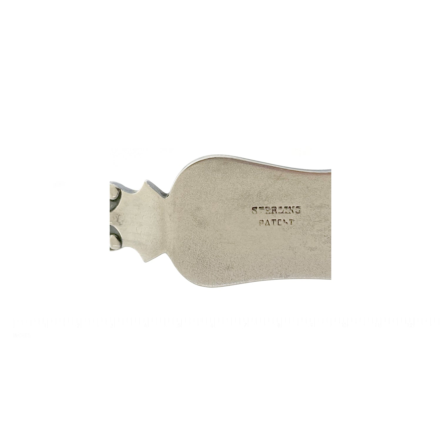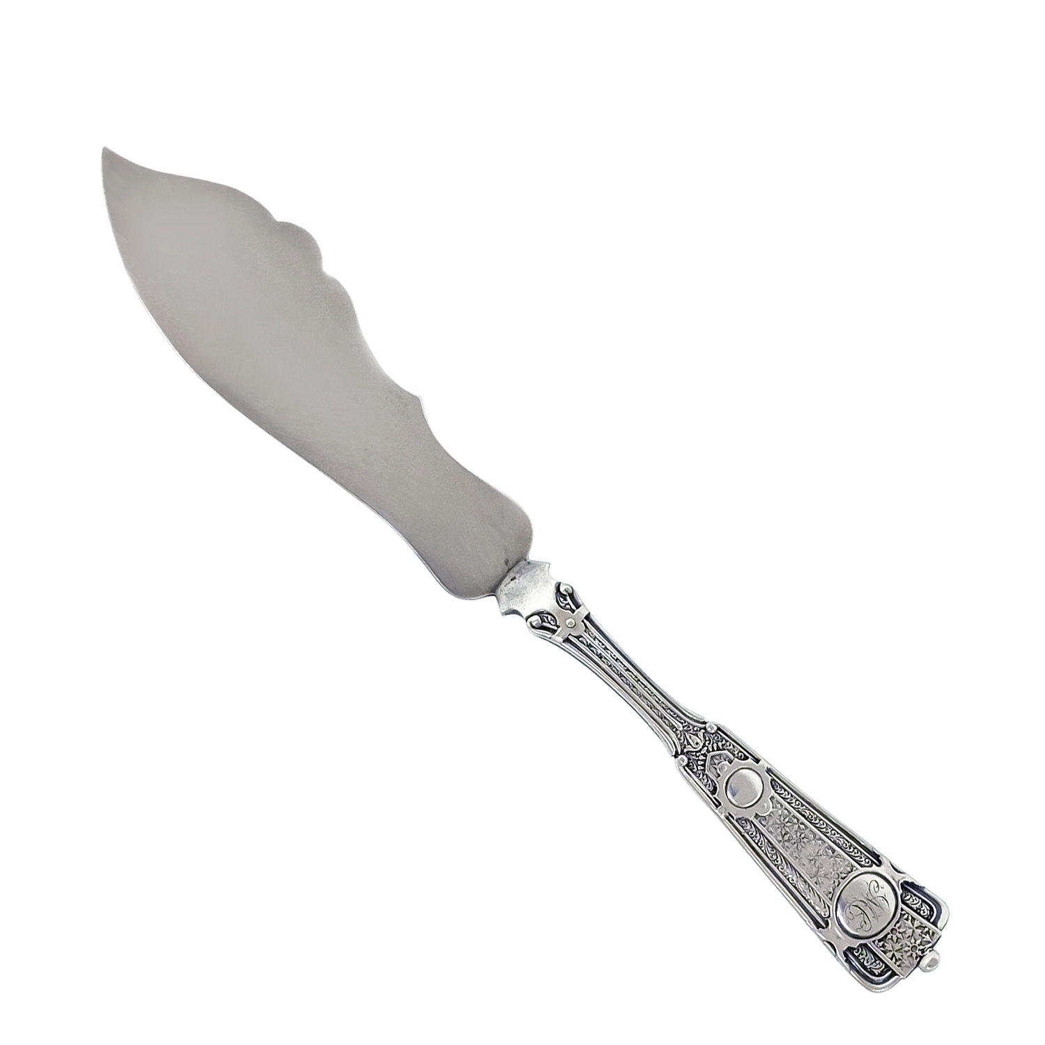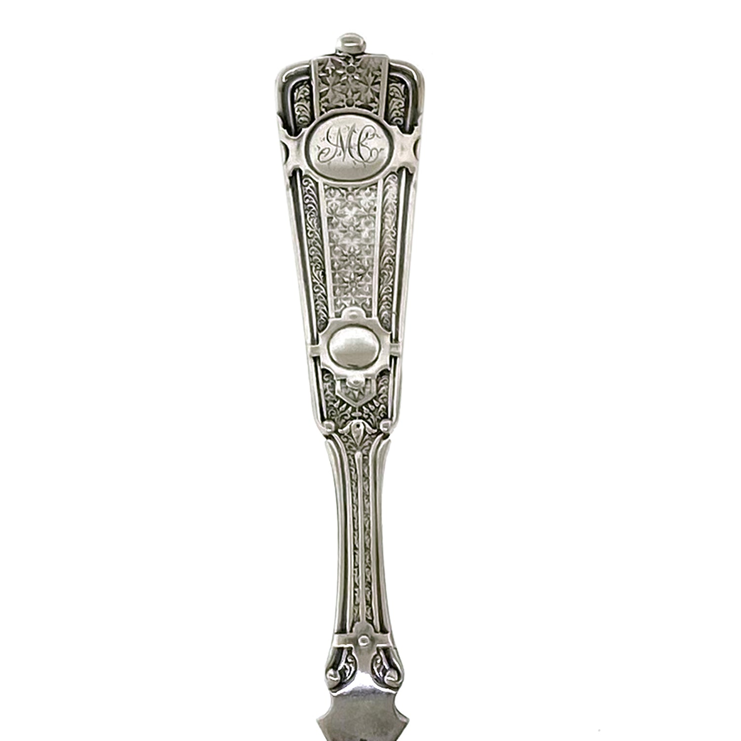 Circa 1870s, Sterling, by John Wendt, New York. 'Ribbon' is an unusual design of intricate decoration portraying ribbon going through a couple of clasps. Monogram as shown. Excellent condition.