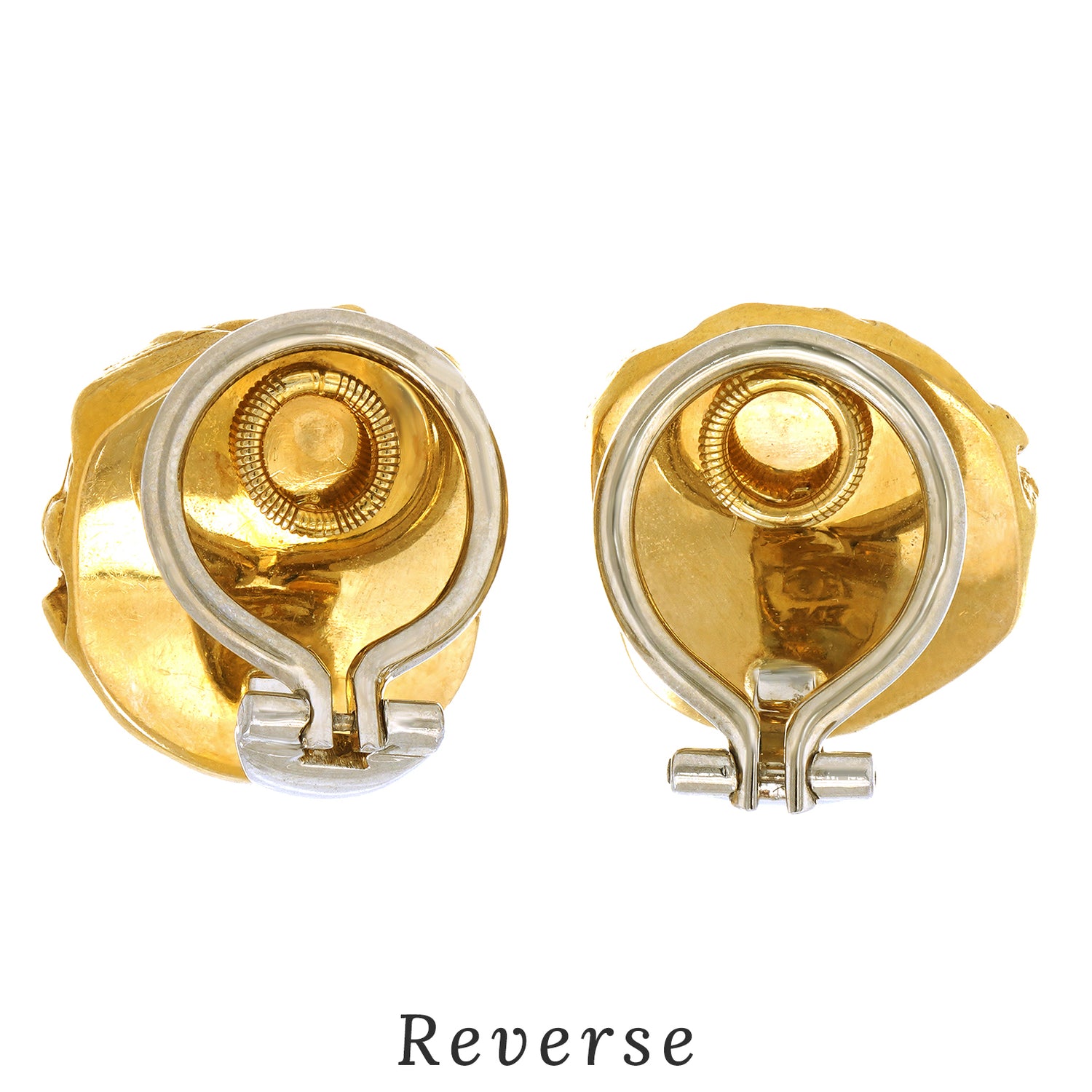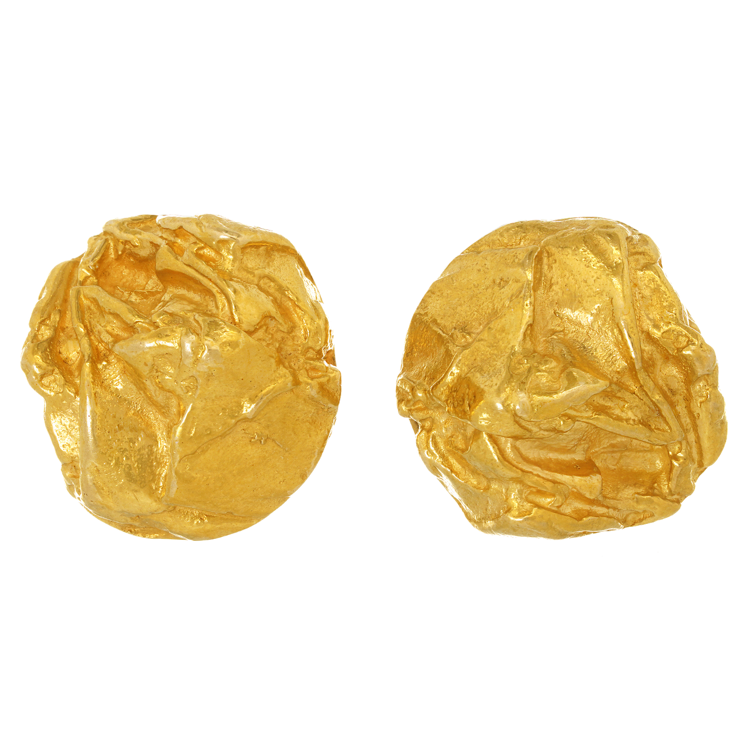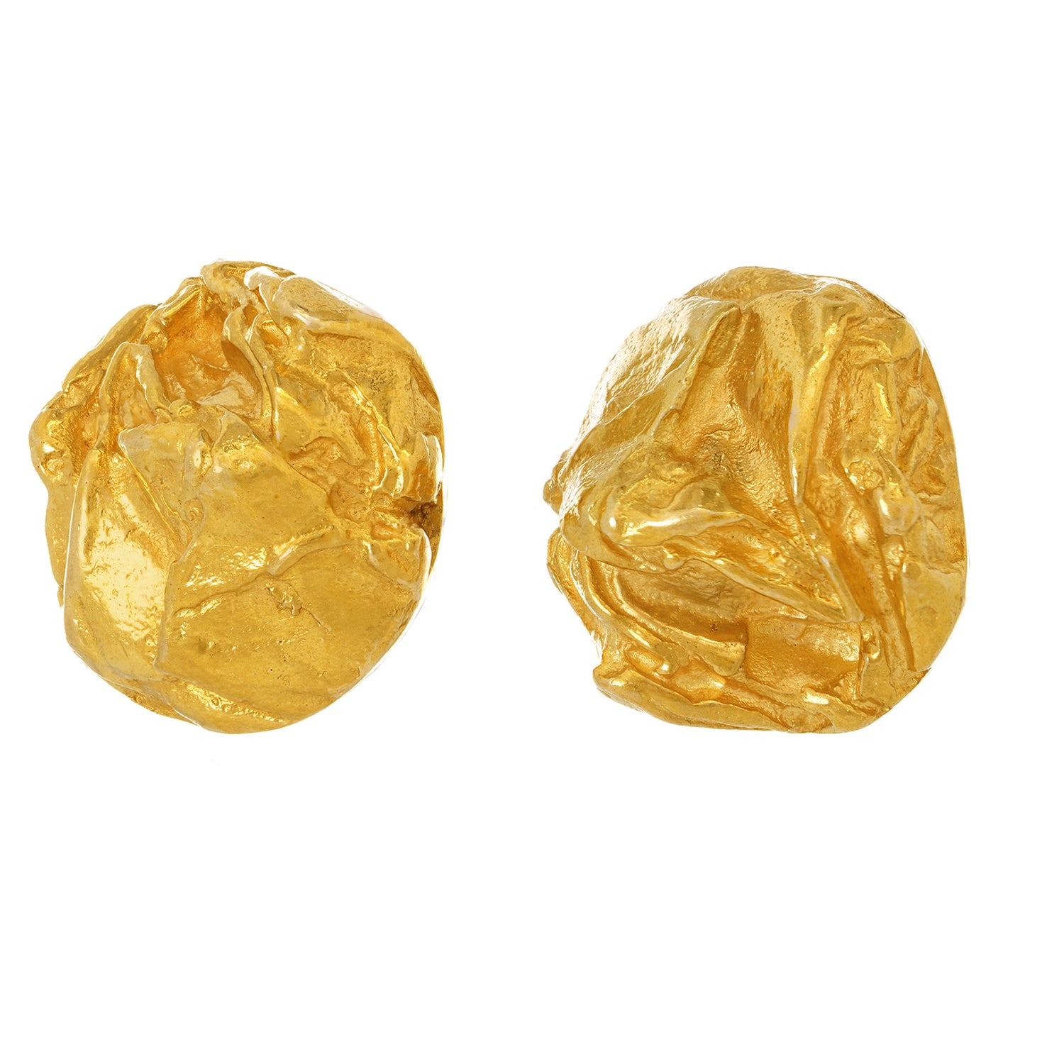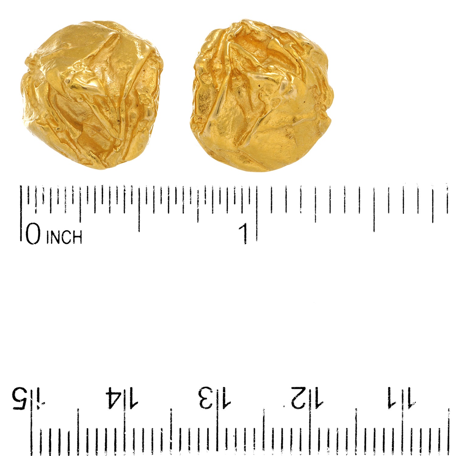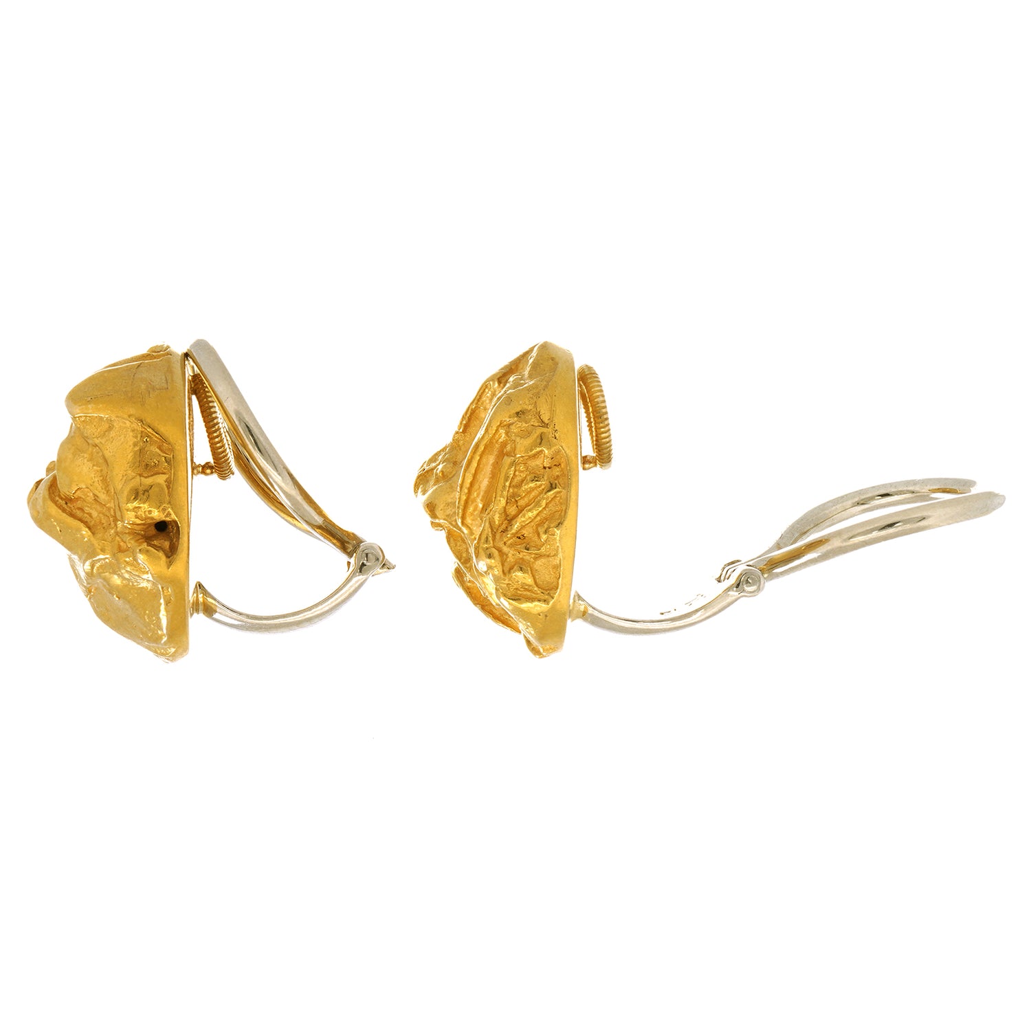Circa 1970s, 18k, by Emil Meister, Zurich, Switzerland.  Meticulously fashioned, every fold, texture, and color is part of the elegantly nuanced visual narrative of these earrings. Brilliantly sidewalk to catwalk, they are fabulous one-of-a-kind expressions of the renowned Zurich Jewelry House, Emil Meister. The look is wearable art to-go. Excellent condition.