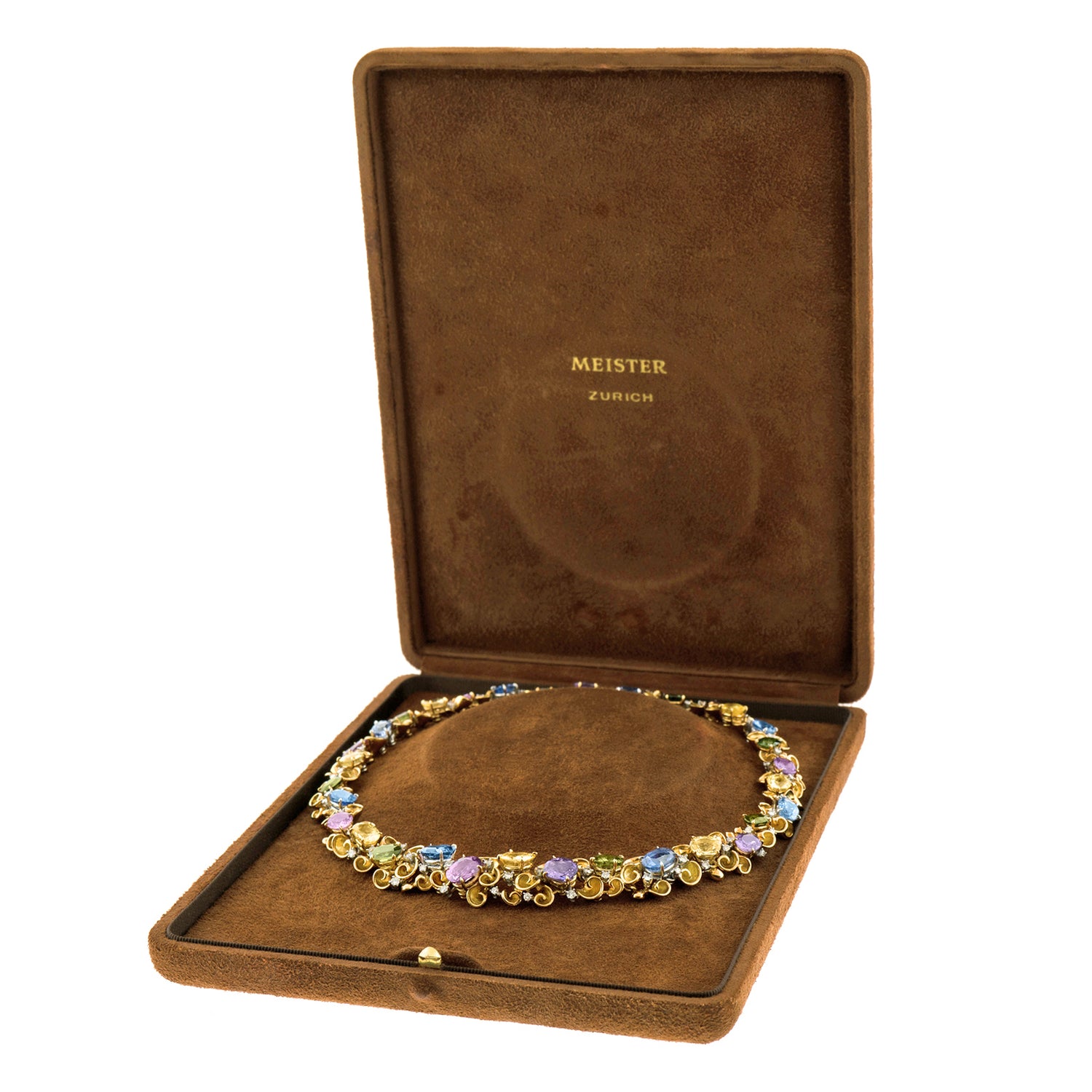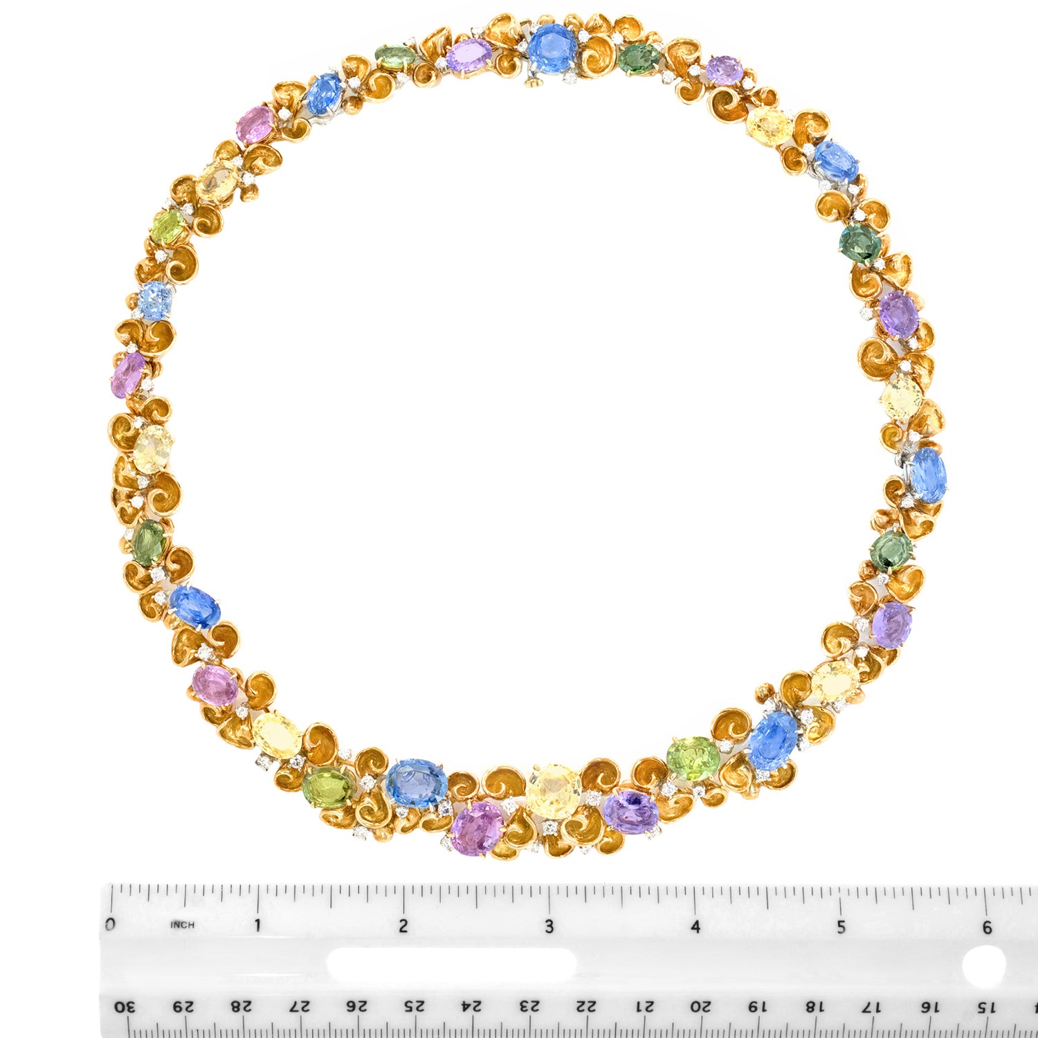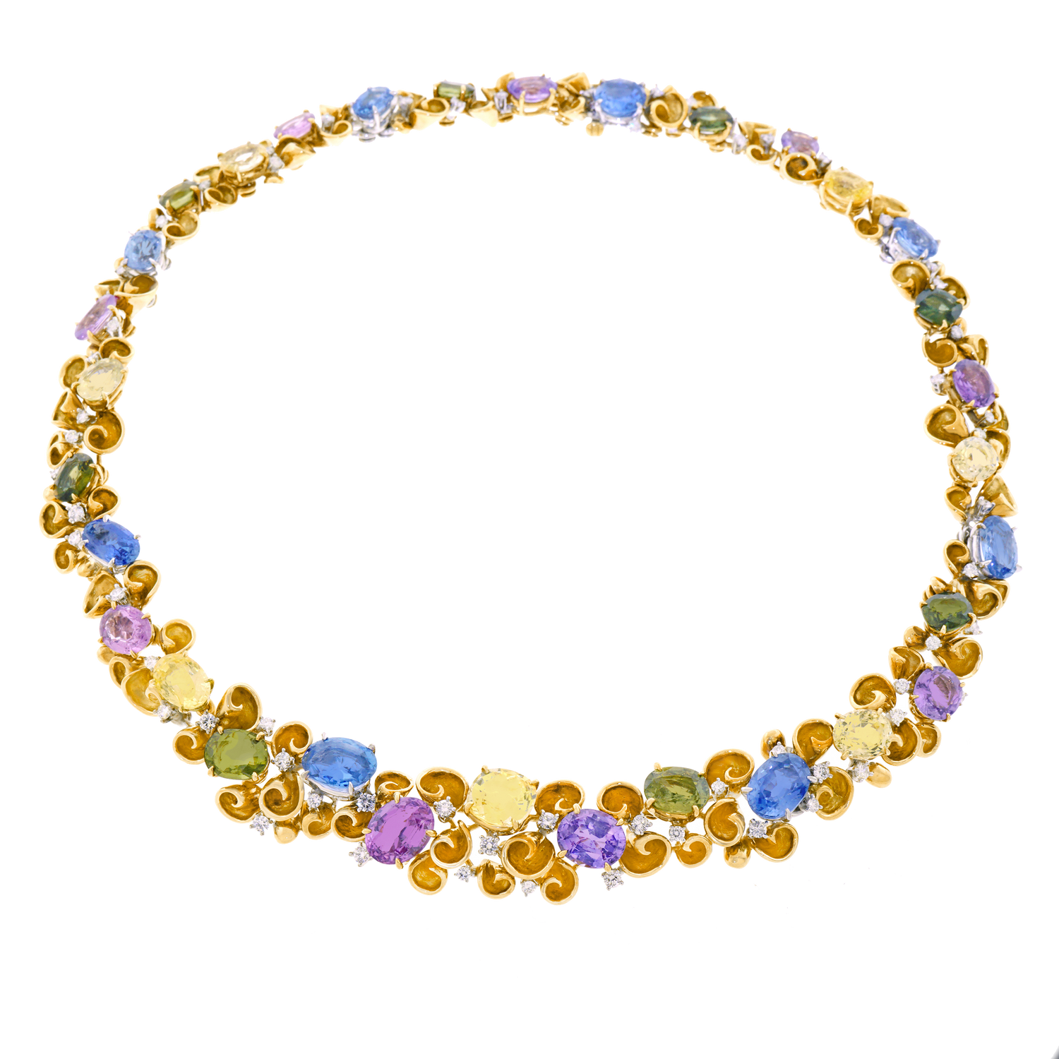 Circa 1980s, 18k, by Emil Meister, Zurich, Switzerland. Set with an incredible 60.0 carats of superb sapphires in five stunning colors and 4.0 carats of brilliant white diamonds (G color, VS clarity), this one-of-a-kind necklace from the esteemed Zurich jewelry house, Meister, has an effortlessly glamorous visual presence. The abstract motif is stylishly modern, breezily dressing up or down. Gorgeous larger sapphires, chic design, and meticulous fabrication give this necklace a matchless look. Excellent condition.