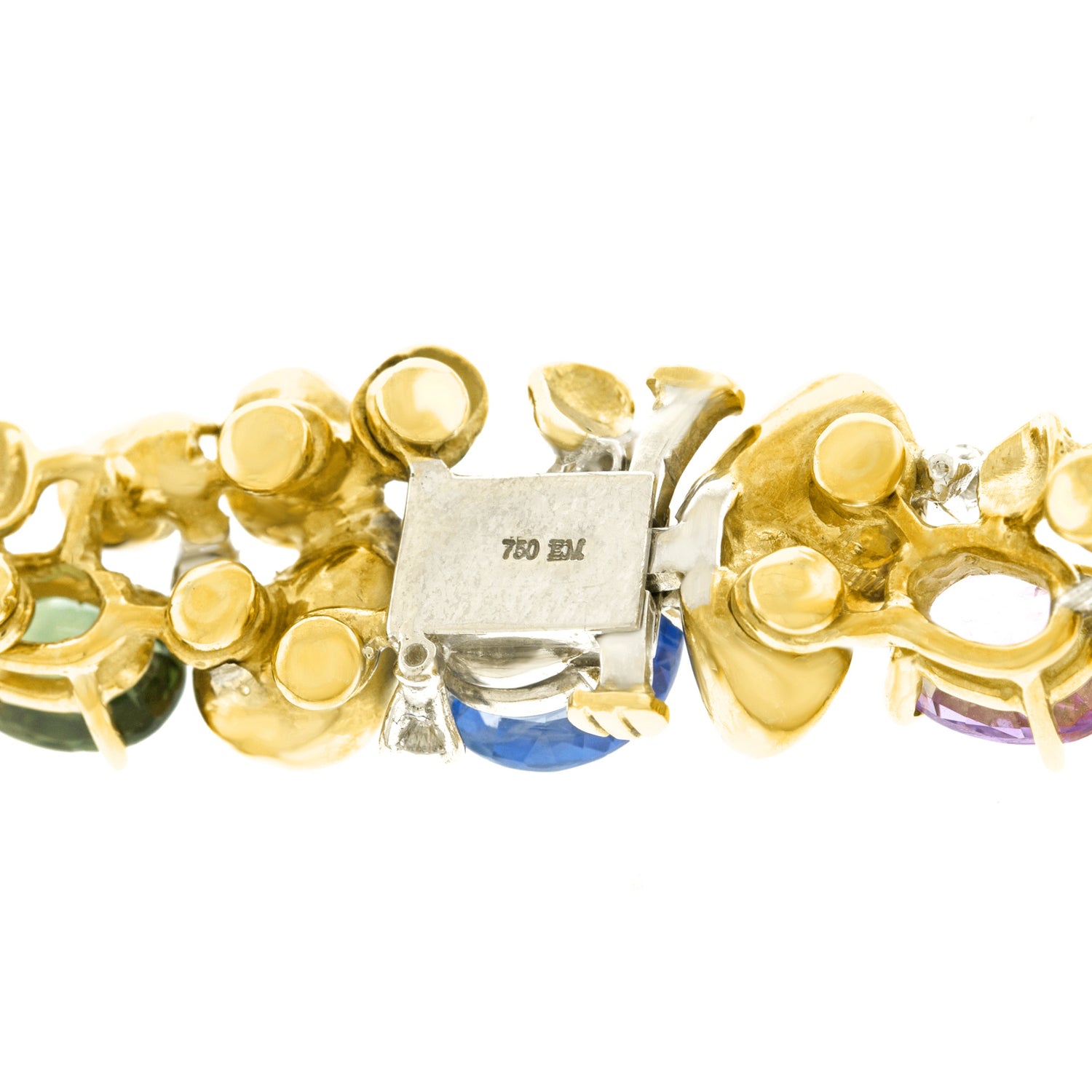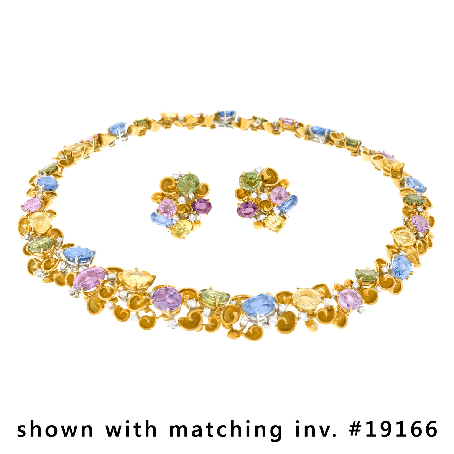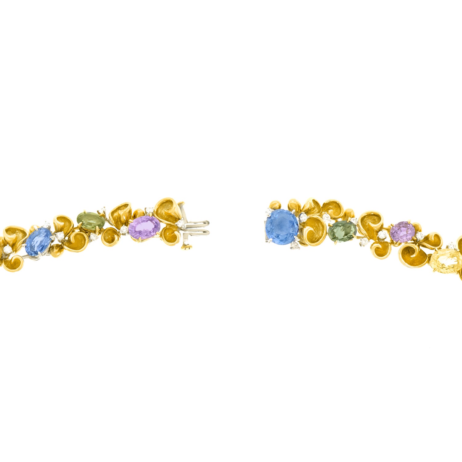 Circa 1980s, 18k, by Emil Meister, Zurich, Switzerland. Set with an incredible 60.0 carats of superb sapphires in five stunning colors and 4.0 carats of brilliant white diamonds (G color, VS clarity), this one-of-a-kind necklace from the esteemed Zurich jewelry house, Meister, has an effortlessly glamorous visual presence. The abstract motif is stylishly modern, breezily dressing up or down. Gorgeous larger sapphires, chic design, and meticulous fabrication give this necklace a matchless look. Excellent condition.