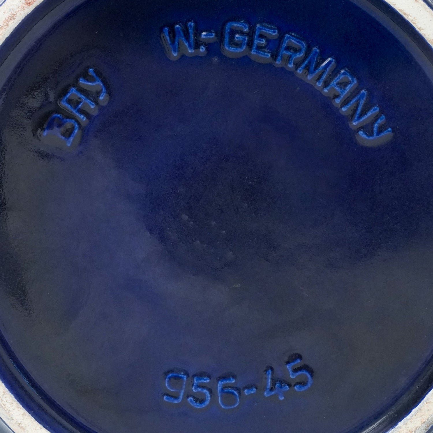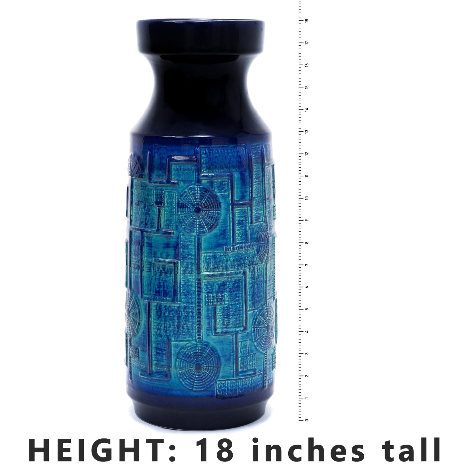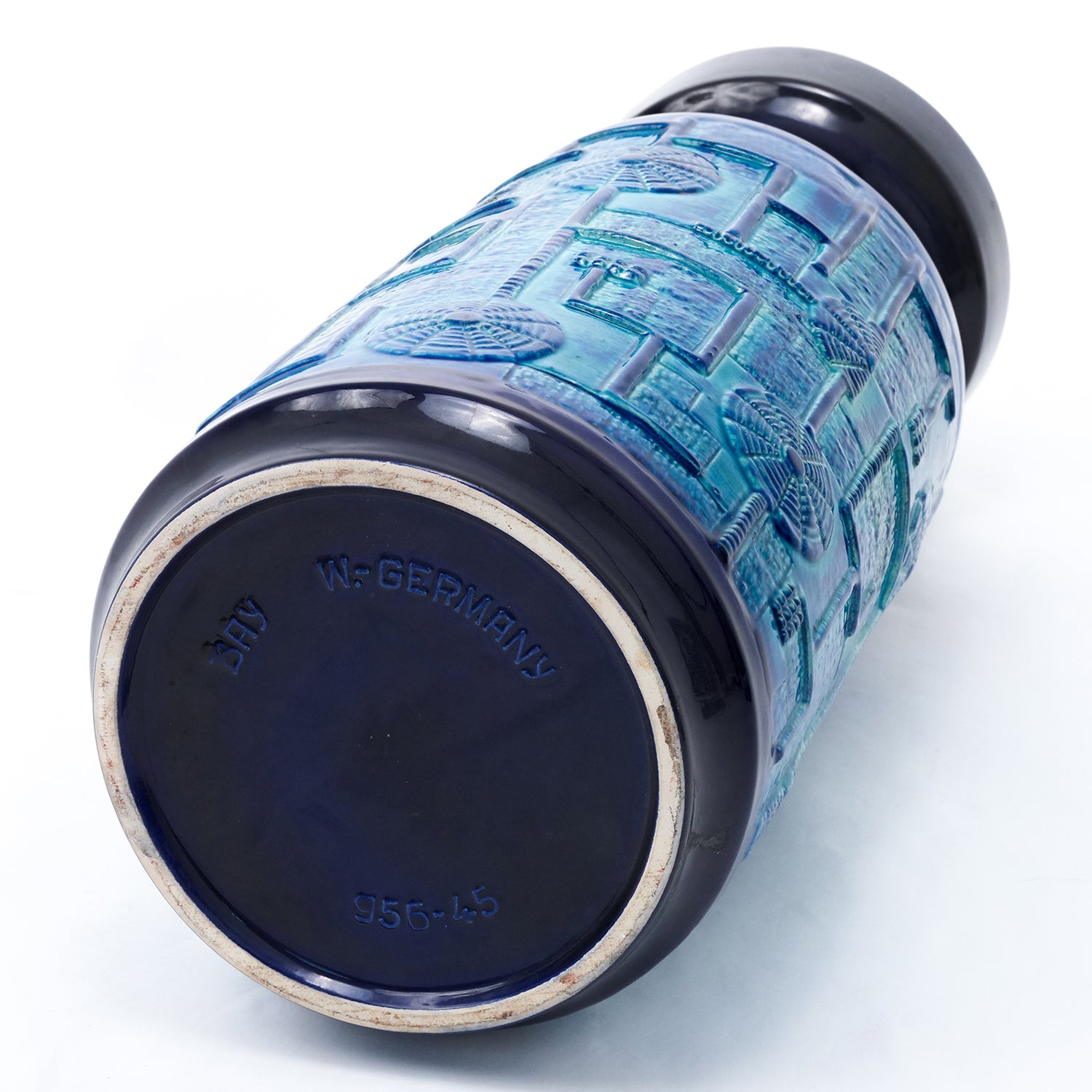 Circa 1950s, by Bay, West Germany. Famous for its innovative designs and amazing glazes, Bay of Germany created perfect accessories for mid-mod interiors. This one is quite exceptional … 18 inches tall, spectacular pattern, and a tone-on-tone blue from delicate to heavy! Great design, truly the best one I have ever seen. Excellent condition.