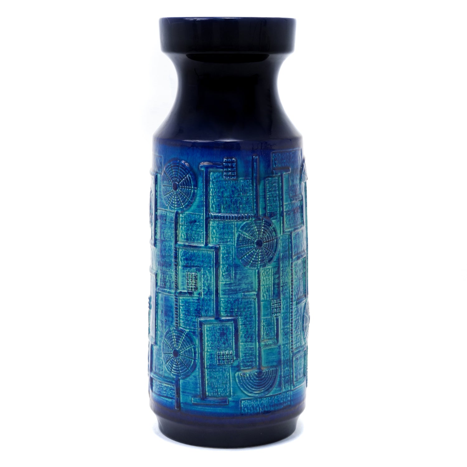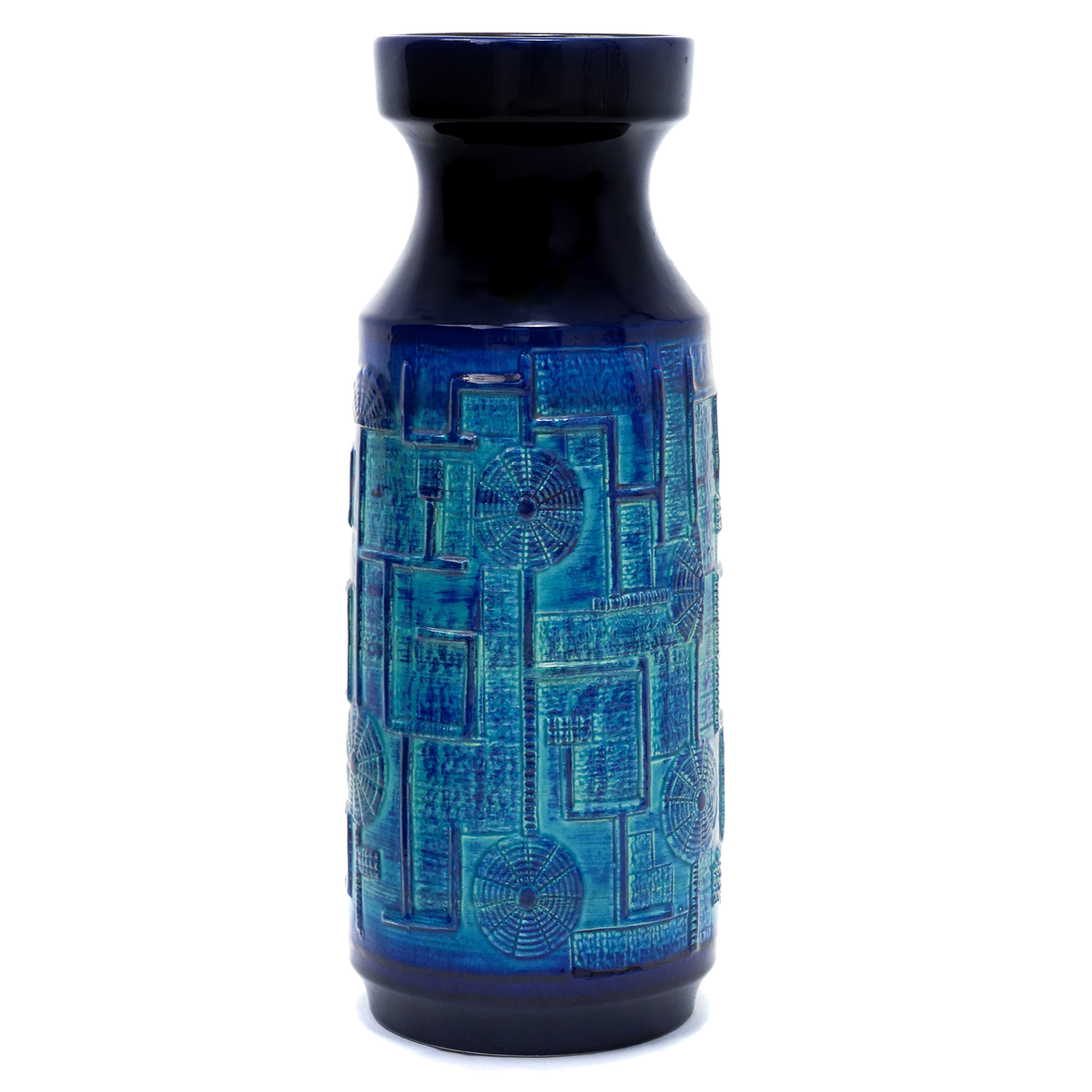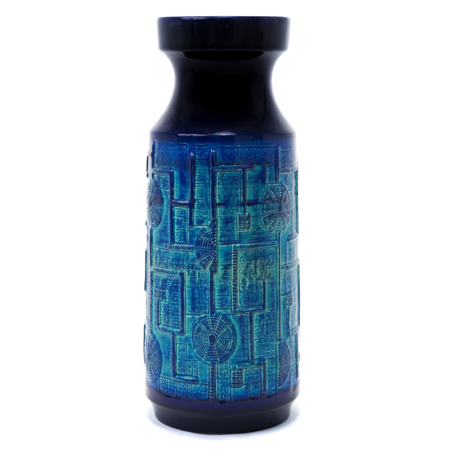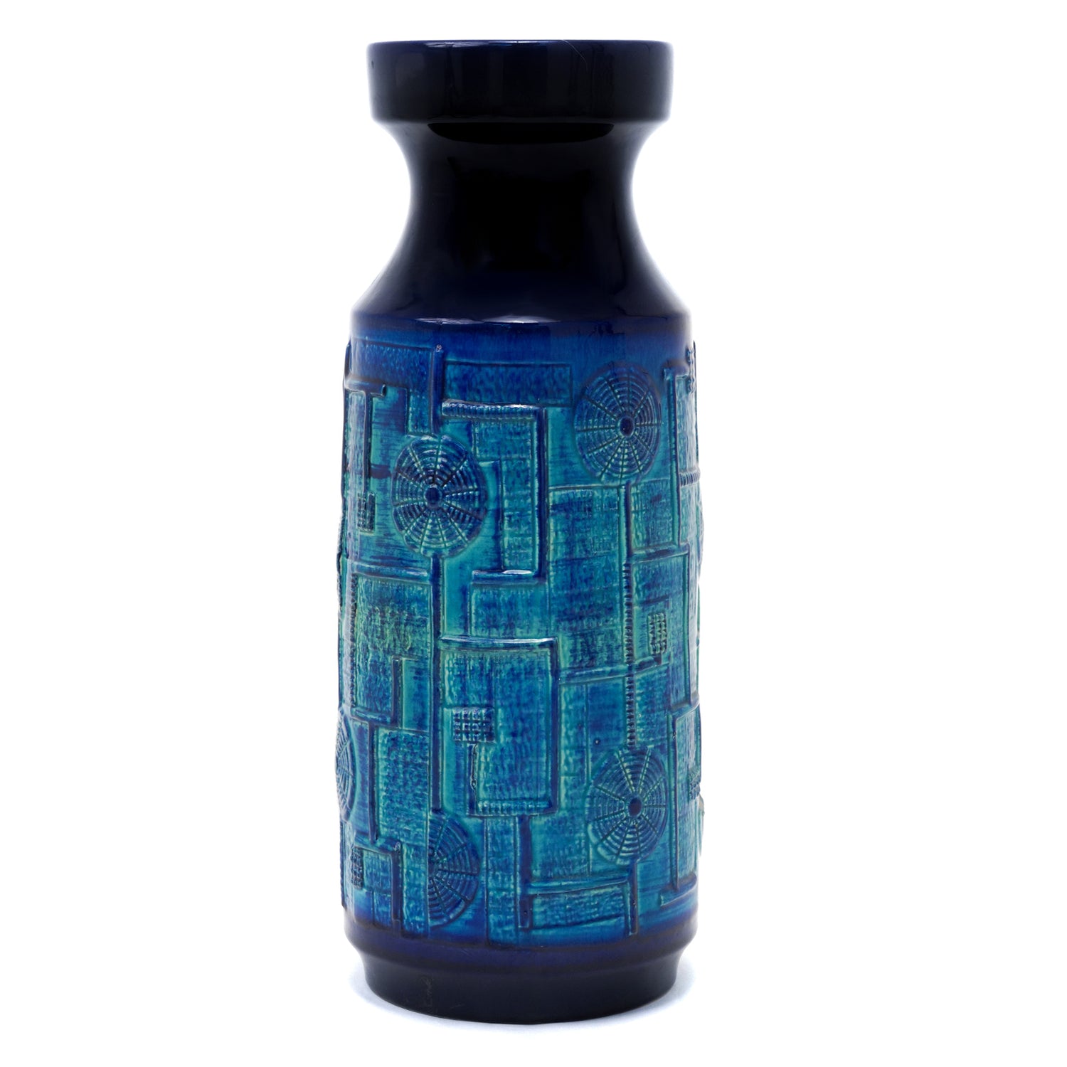 Circa 1950s, by Bay, West Germany. Famous for its innovative designs and amazing glazes, Bay of Germany created perfect accessories for mid-mod interiors. This one is quite exceptional … 18 inches tall, spectacular pattern, and a tone-on-tone blue from delicate to heavy! Great design, truly the best one I have ever seen. Excellent condition.