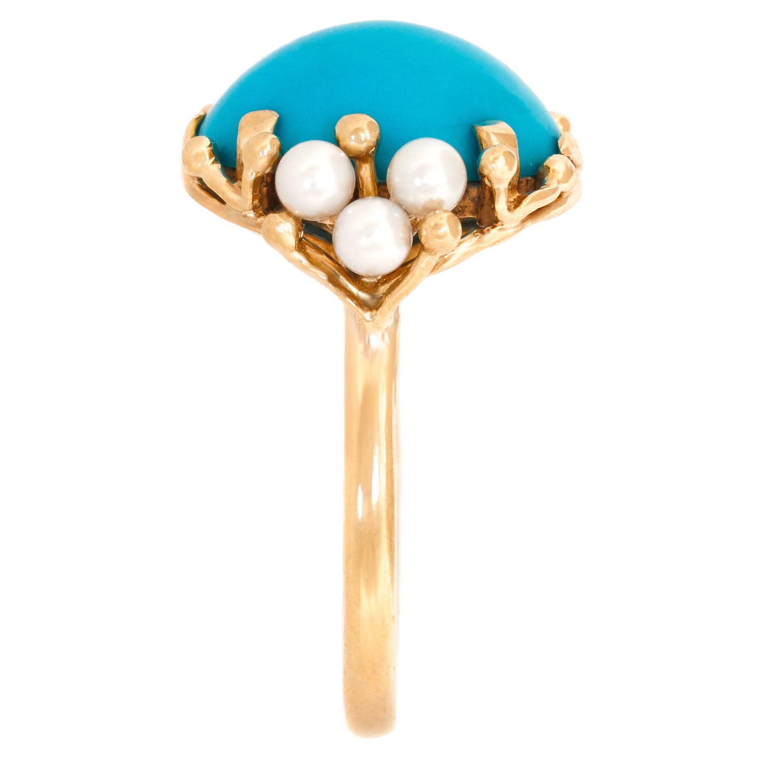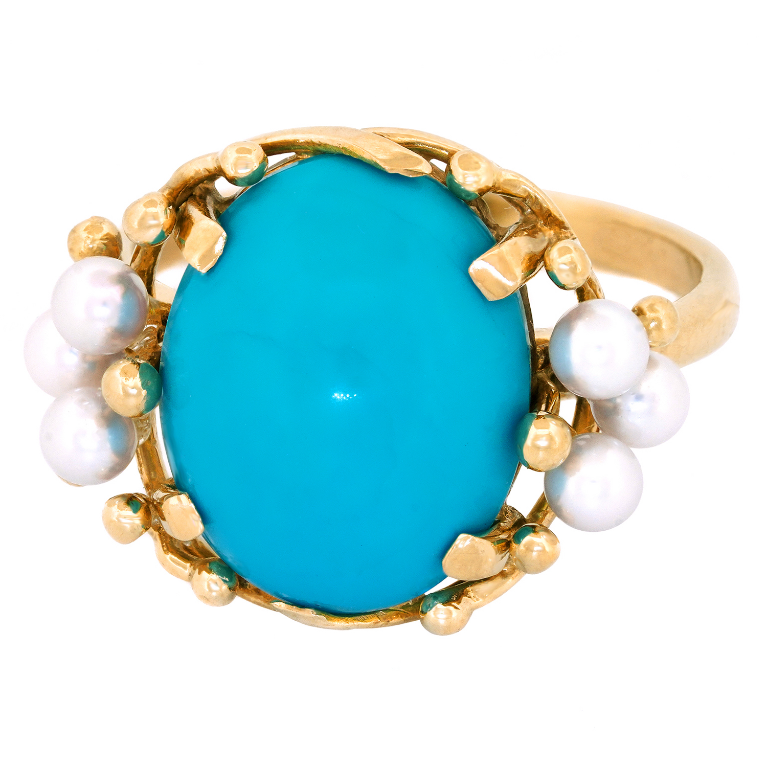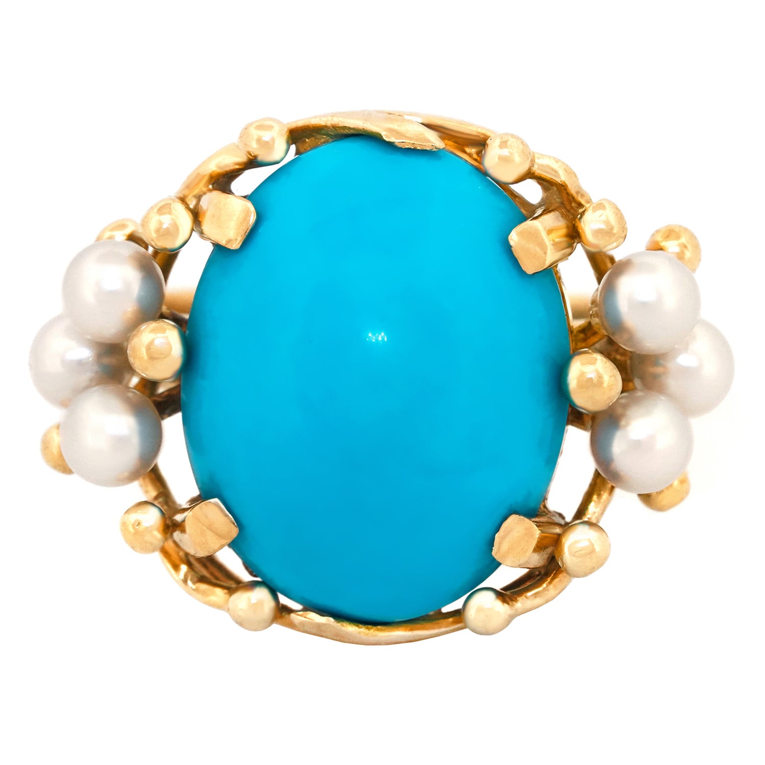 Circa 1960s, 14k, by Mings, Hawaii. Effortlessly everyday chic, this fabulous sixties ring will compliment any fashion narrative. The turquoise is a brilliant sky blue, set in yellow gold, and accented by lustrous pearls. Excellent condition.