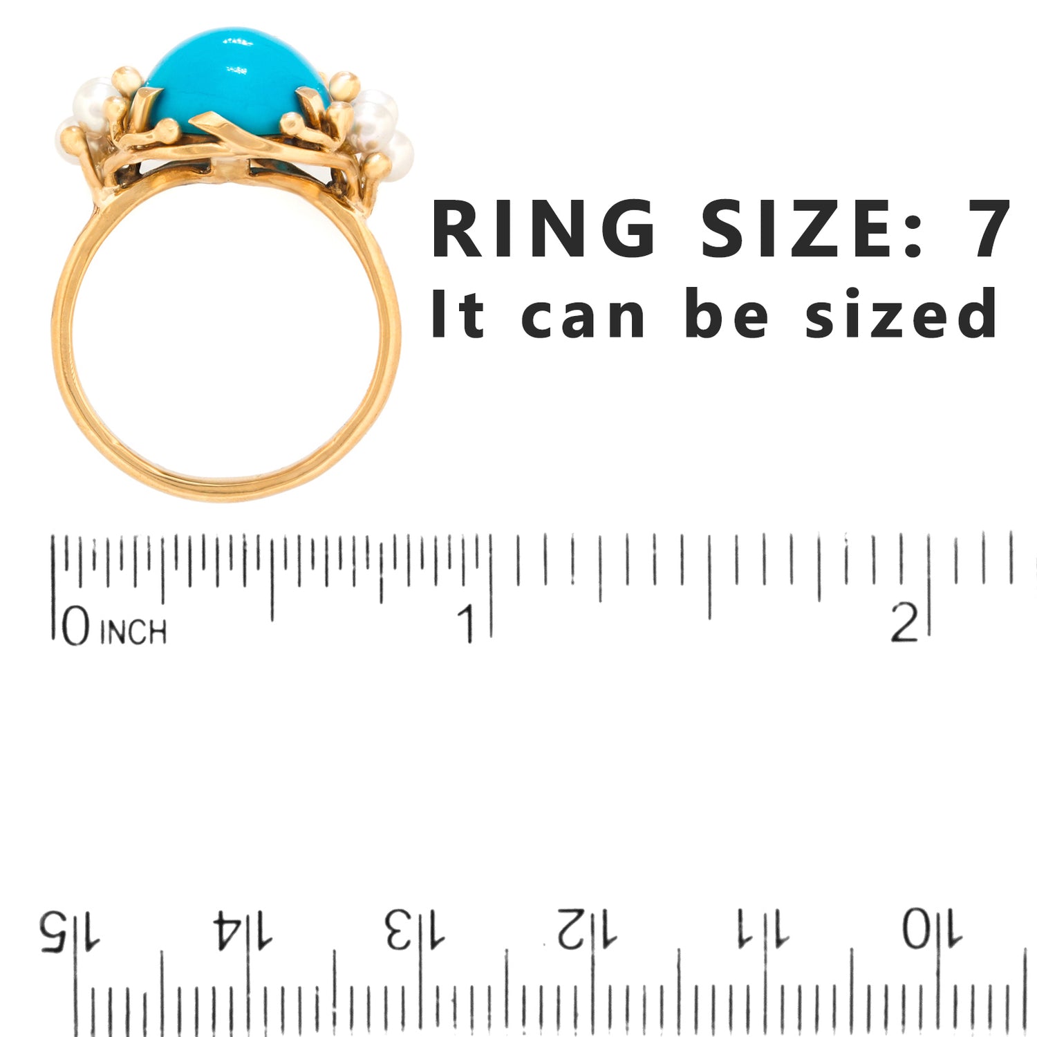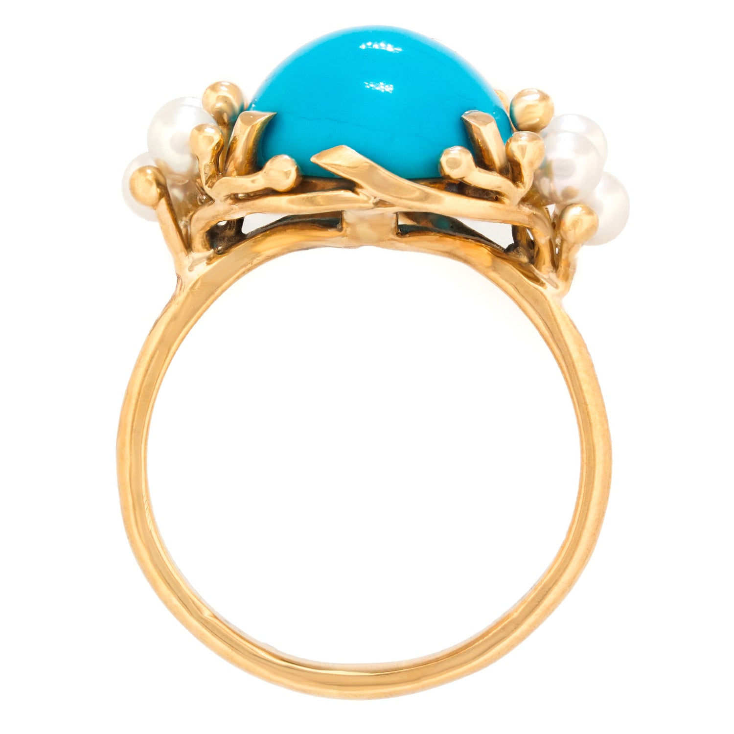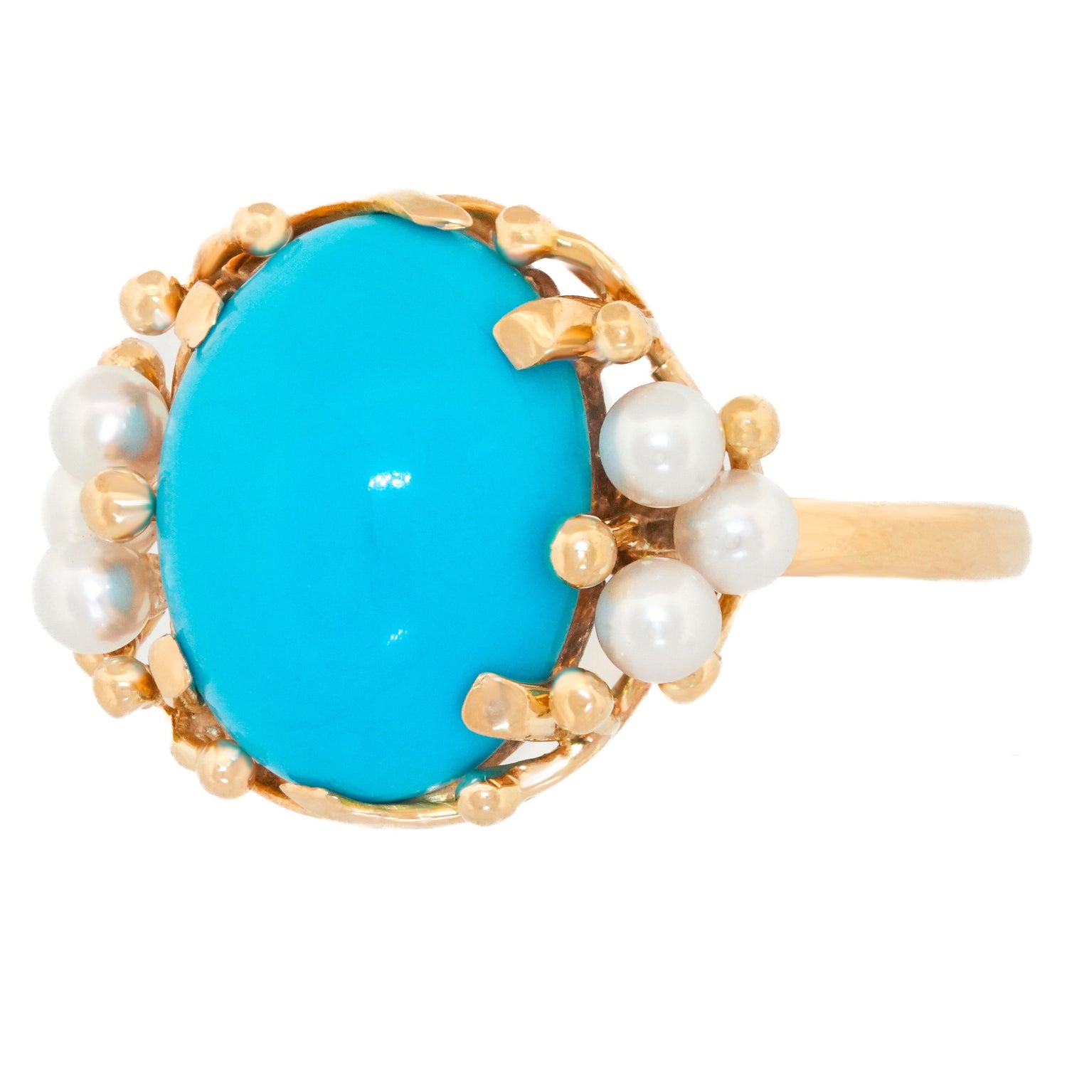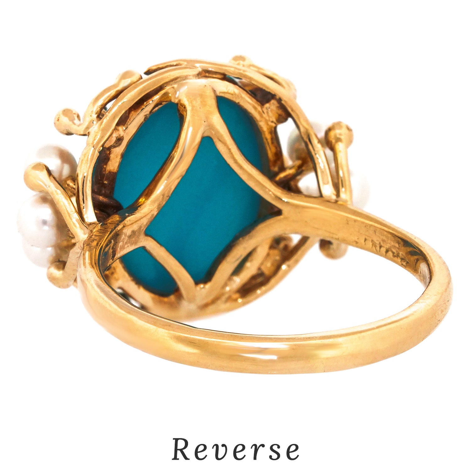 Circa 1960s, 14k, by Mings, Hawaii. Effortlessly everyday chic, this fabulous sixties ring will compliment any fashion narrative. The turquoise is a brilliant sky blue, set in yellow gold, and accented by lustrous pearls. Excellent condition.