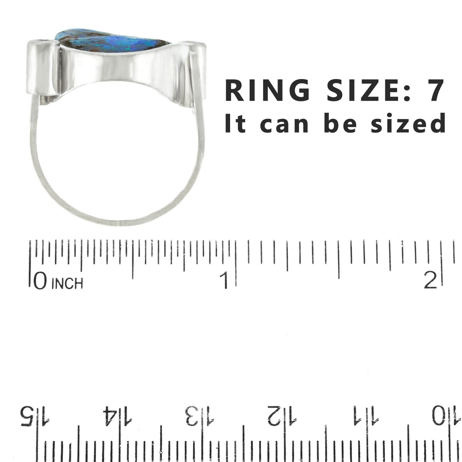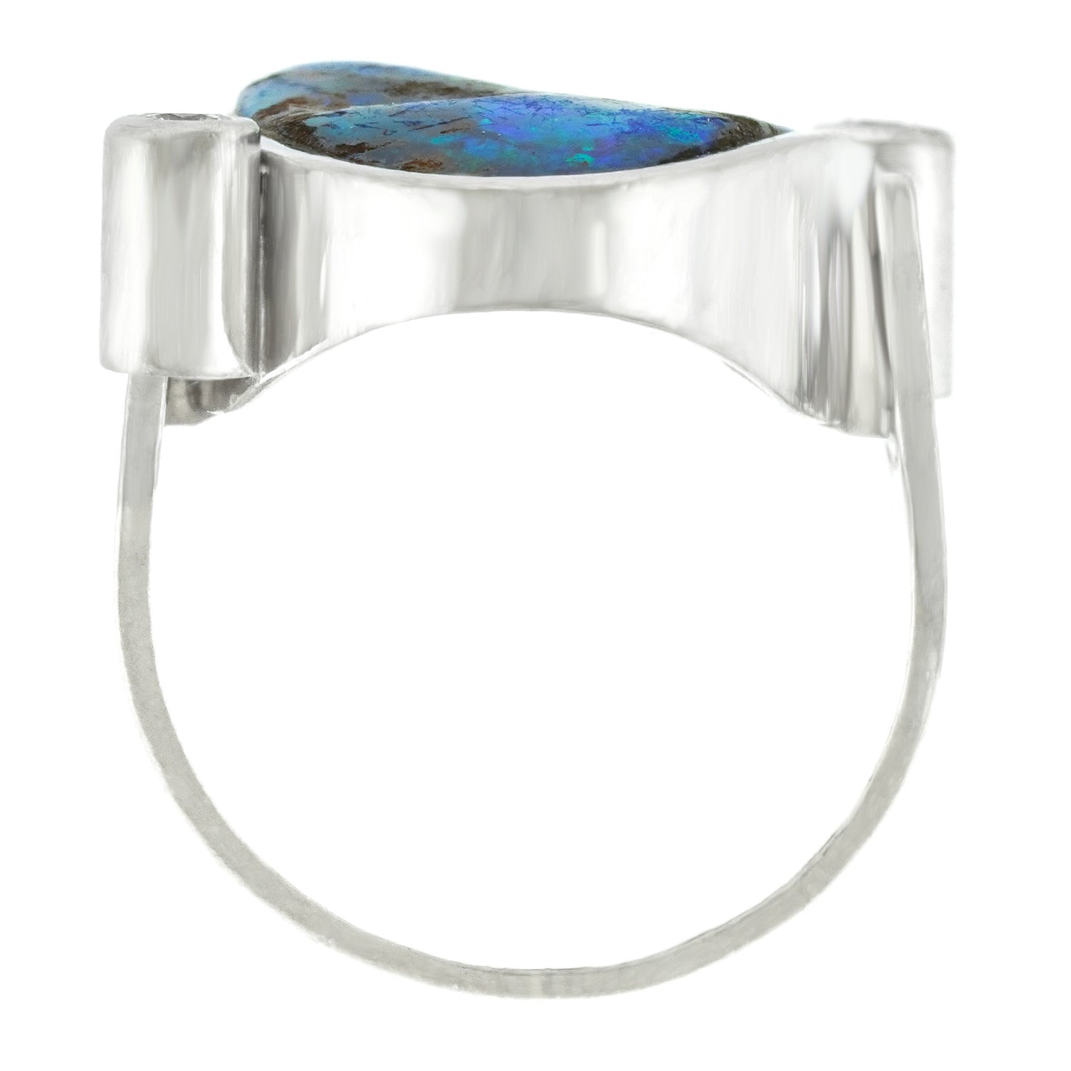 Circa 1970s, 18k. This hand-made modern ring has that wonderful hippie-made vibe. A magically prismatic black opal is the main drama of this biomorphic ring. Effortlessly chic, it will become part of your signature style. Excellent condition.