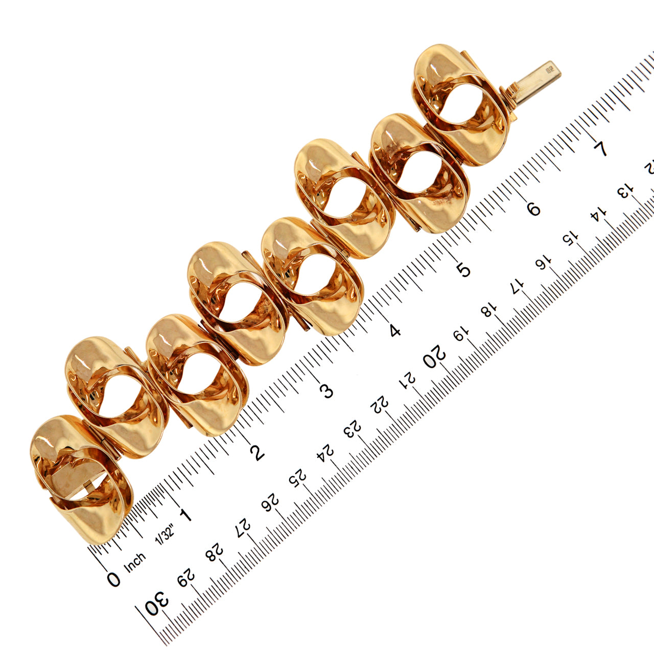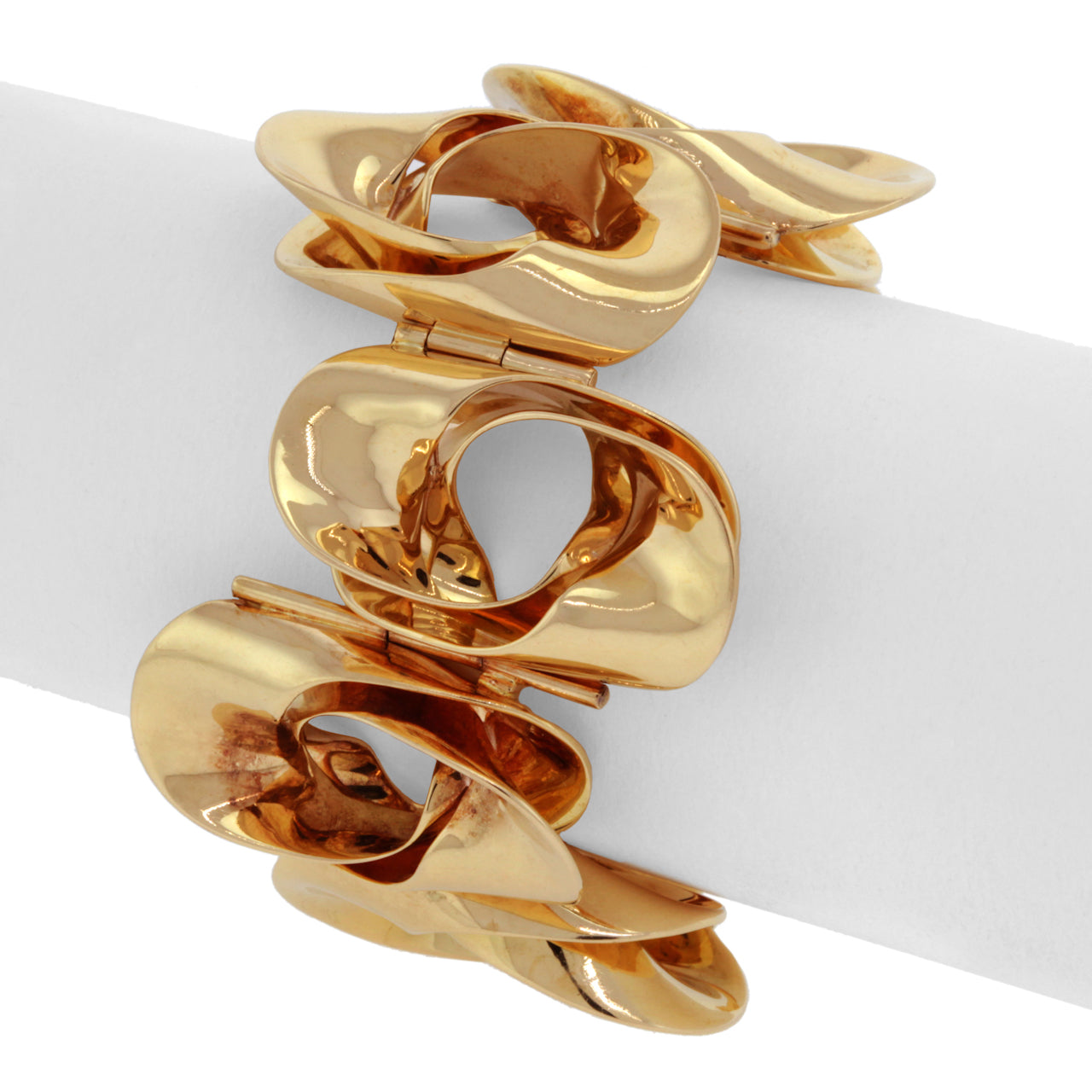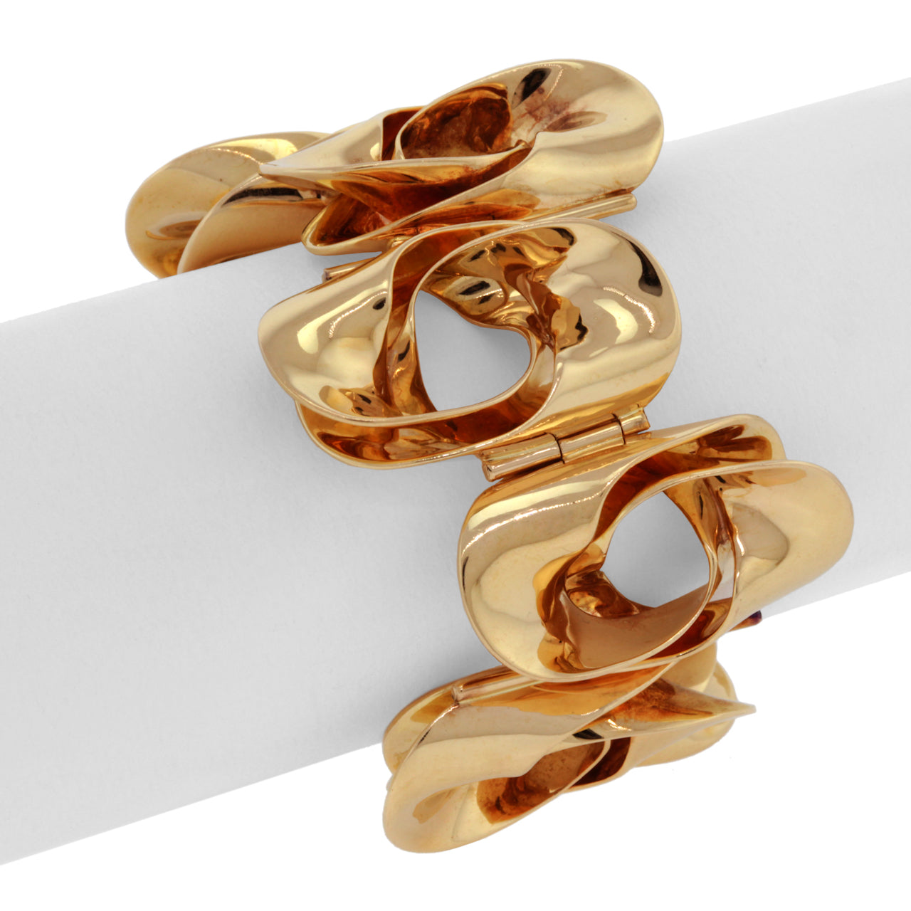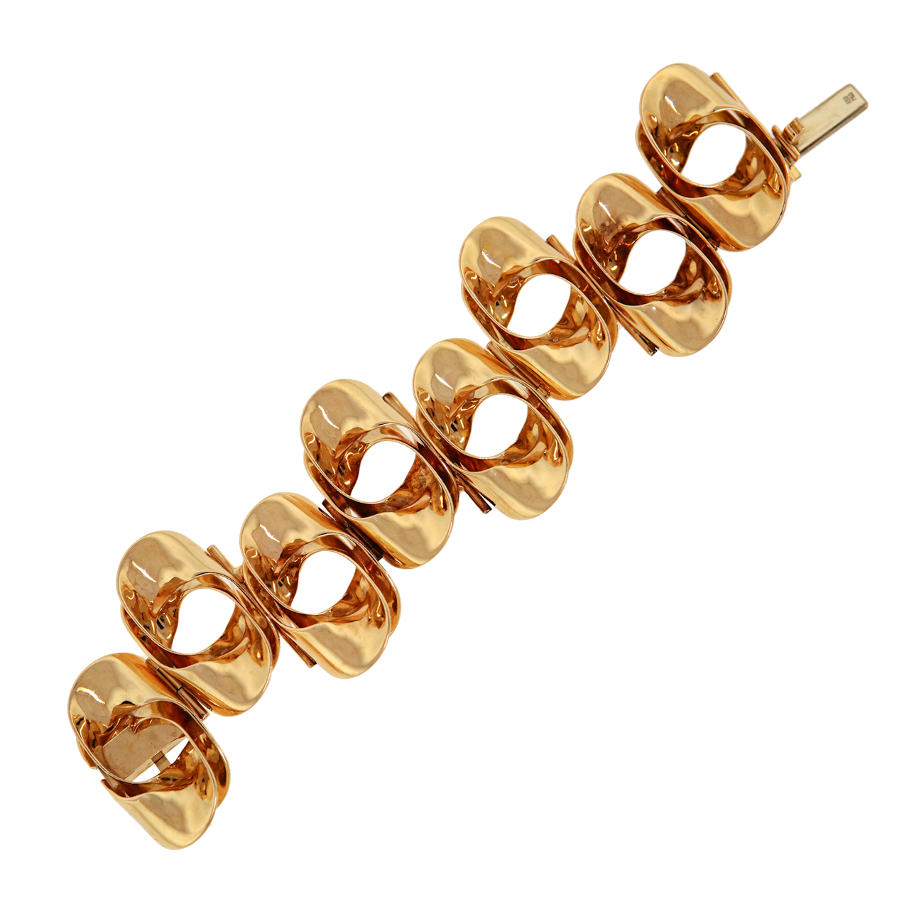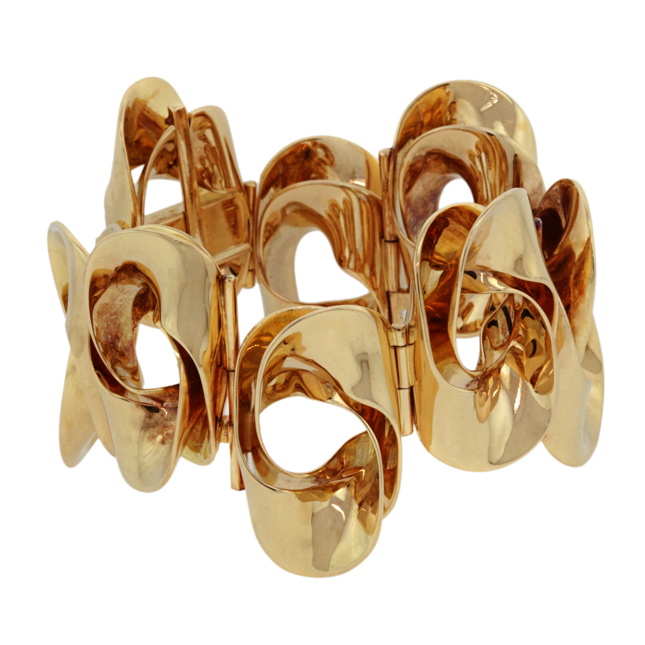 Circa 1960-70s, 18k, Brechbuhl, Swiss.  This stunning 18k yellow gold bracelet is quite heavy and completely handmade. A modernist classic, its style is impeccable. It is very wearable, but will only fit smaller wrists. Excellent condition.