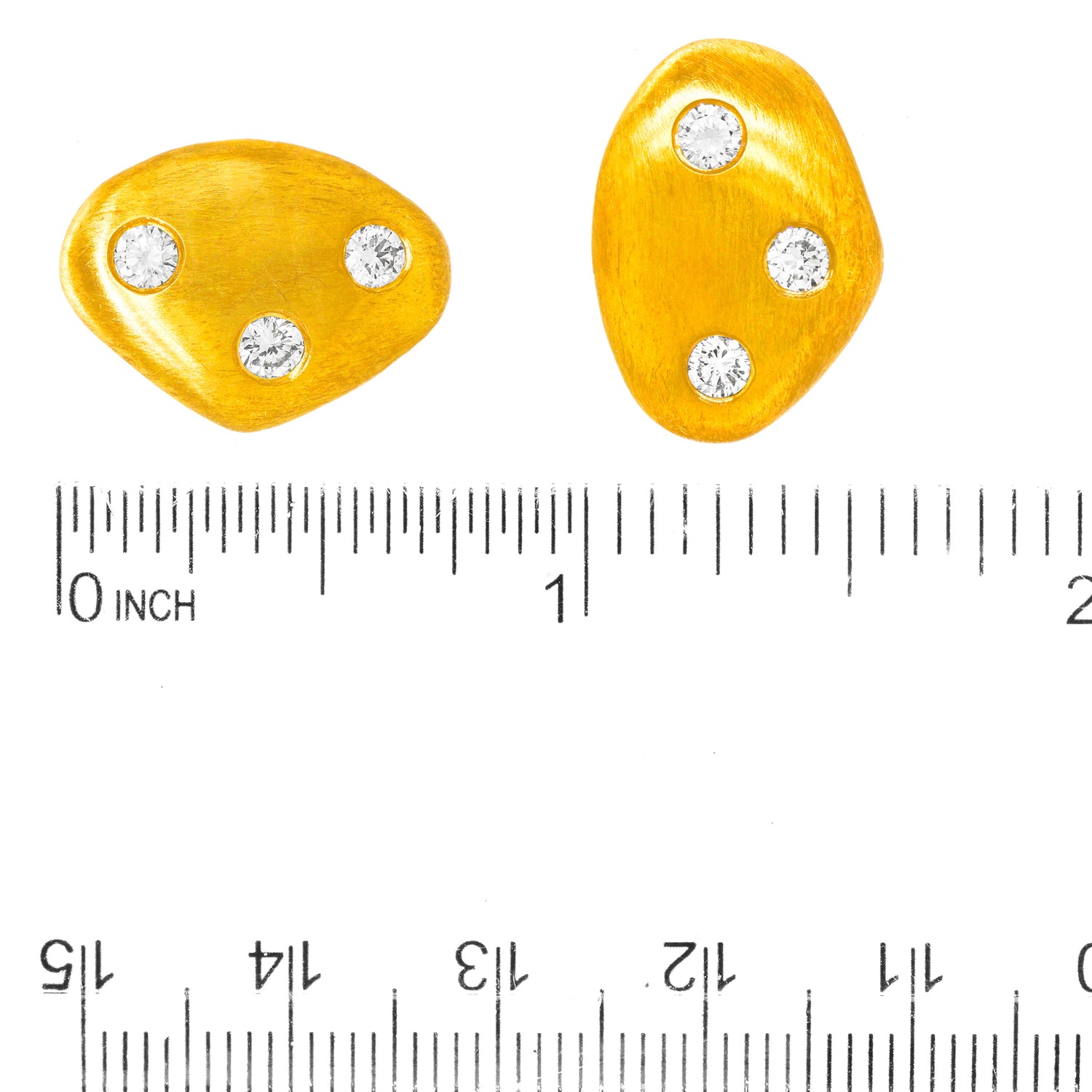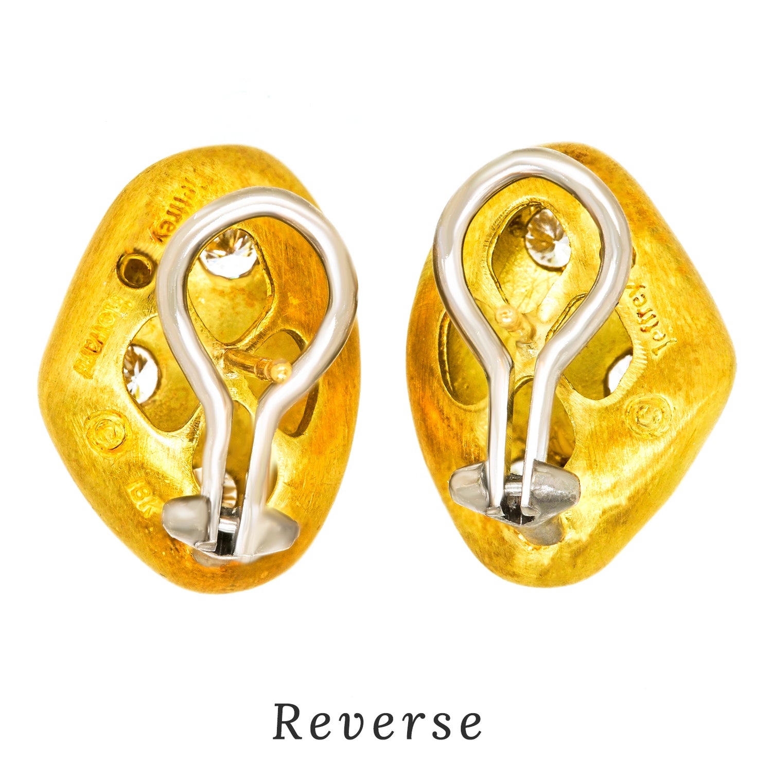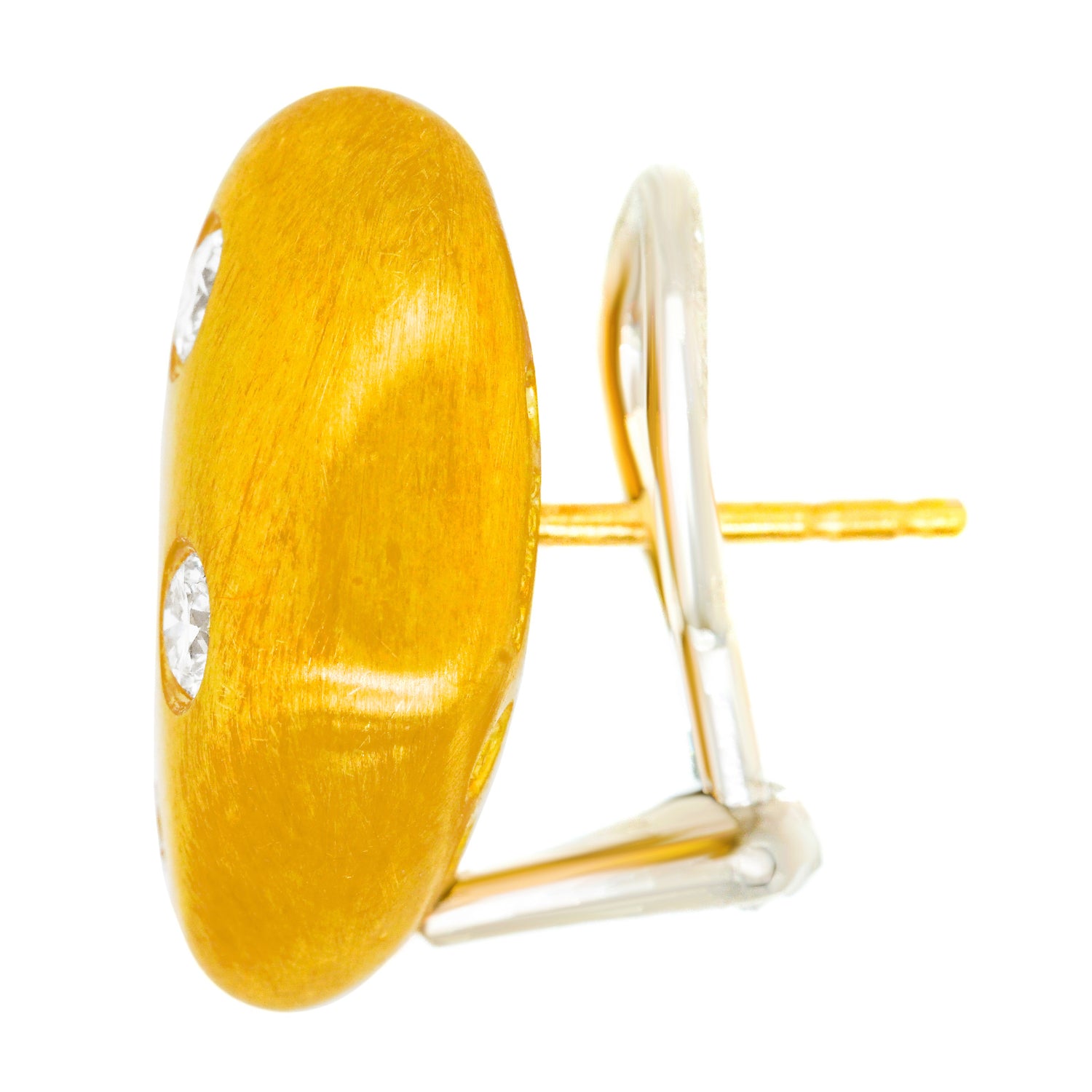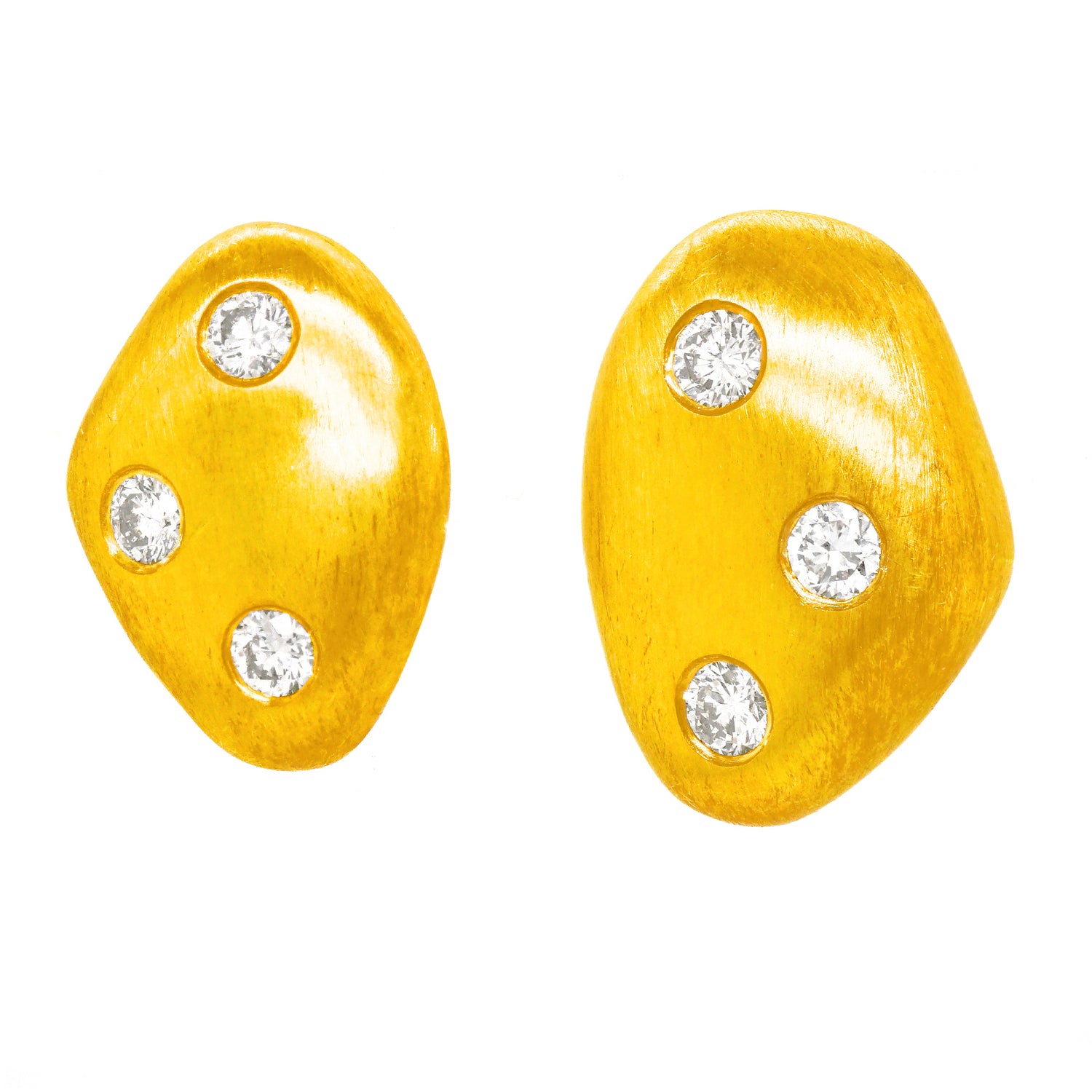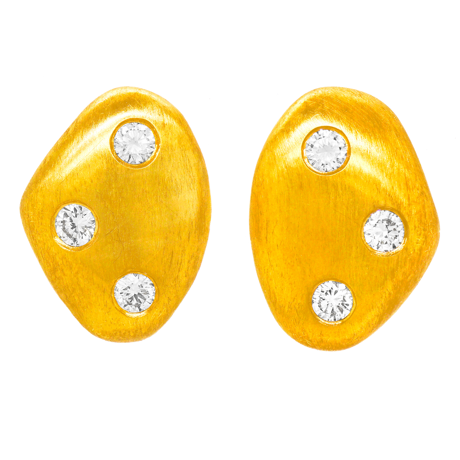 Circa 1990s, 18k, by Jeffrey Howard, Dallas, TX. These chic biomorphic motif earrings are modern sculptures to go! The look is shimmers of gold with sprinkles of sparkly white diamonds. Finely hand-fashioned in 18k with traditional gypsy settings and a textured matt finish, they are in excellent condition.