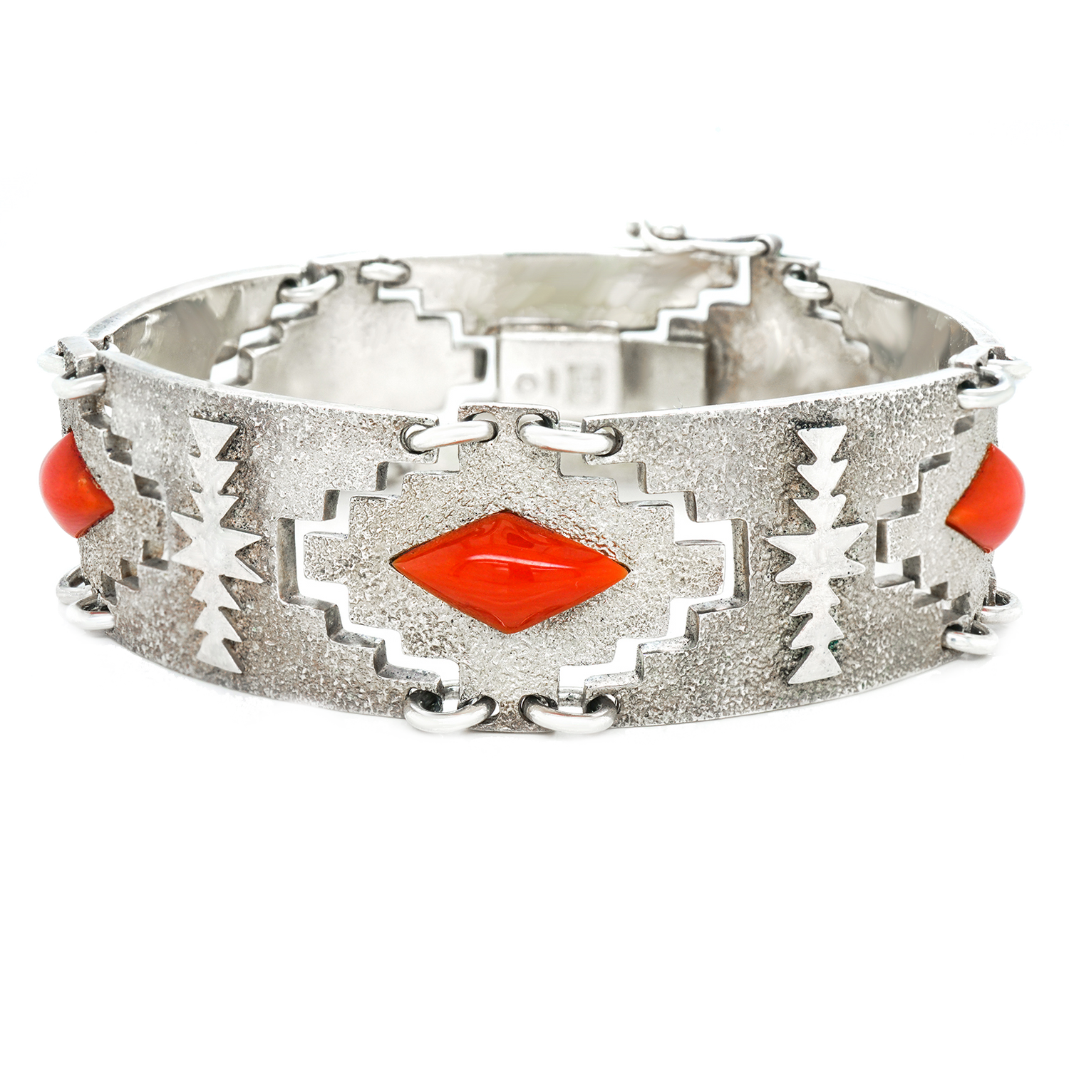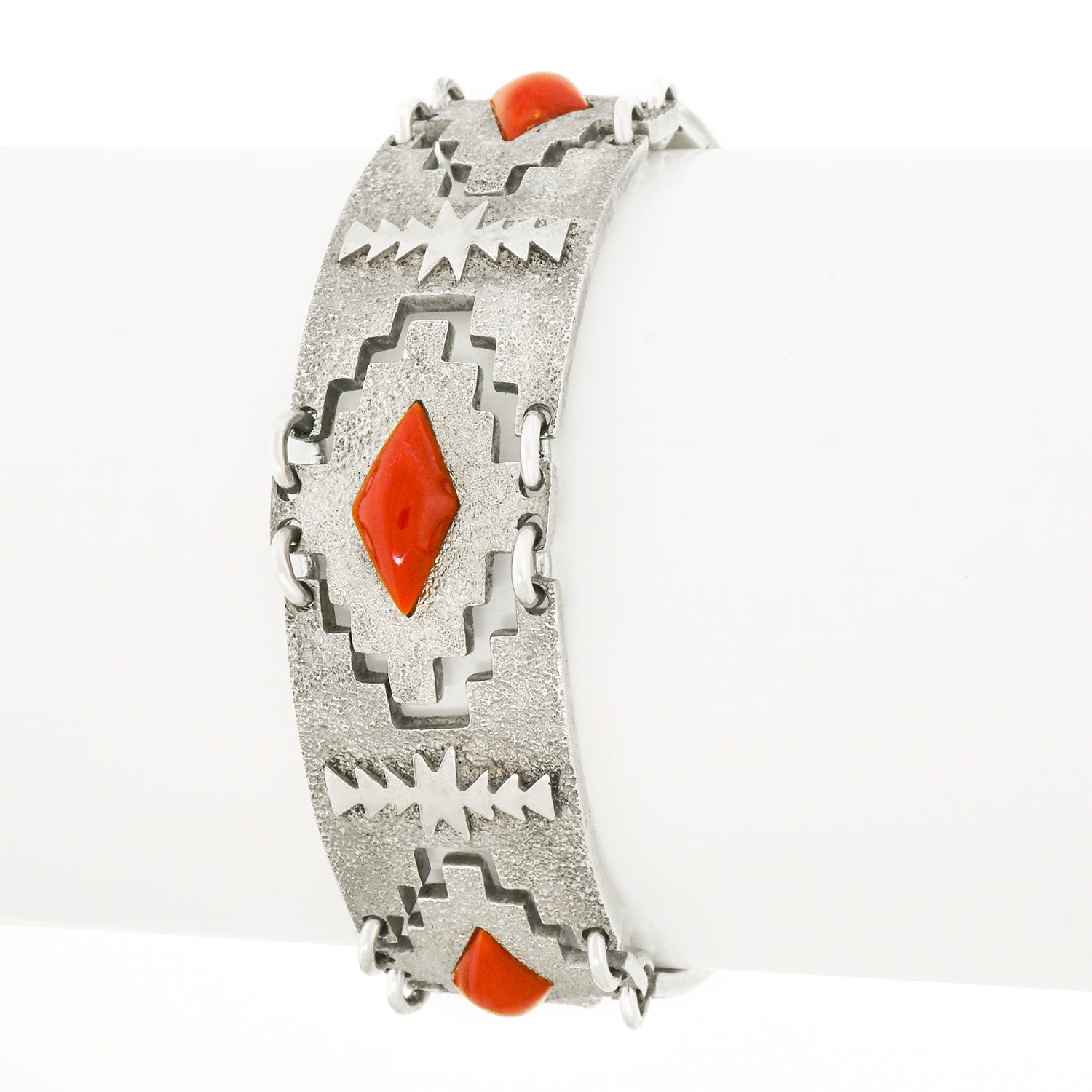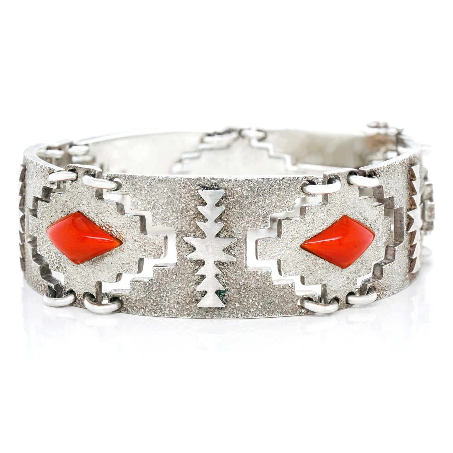 Circa 1990s, Sterling, by Harvey Begay, Navajo. This unusual coral-set sterling bracelet is Western American style at its Navajo best. Harvey Begay, part of the storied Begay family of silversmiths, is an award-winning artist whose work is sought after by collectors and museums alike. This example of his work effortlessly blends traditional motifs with modernist sensibilities. Excellent condition.