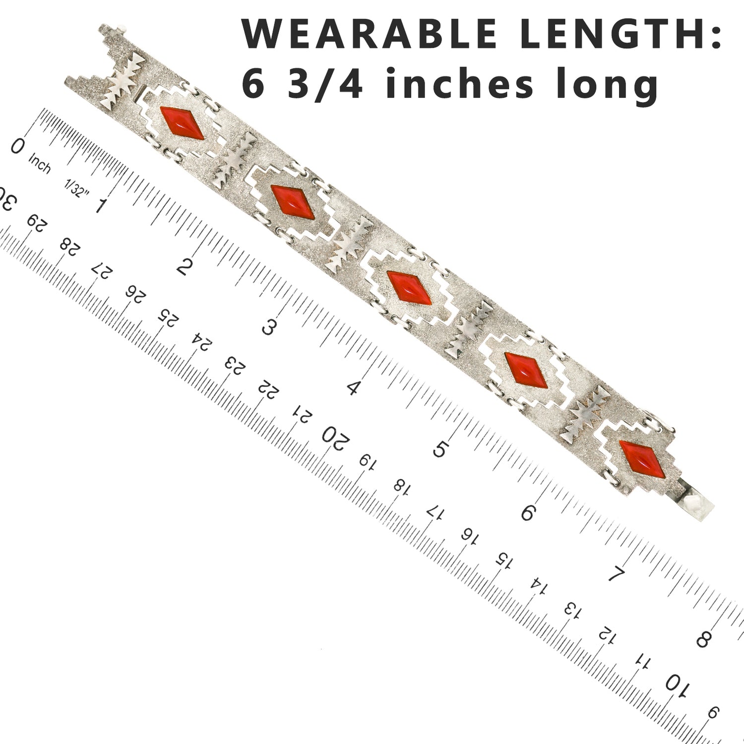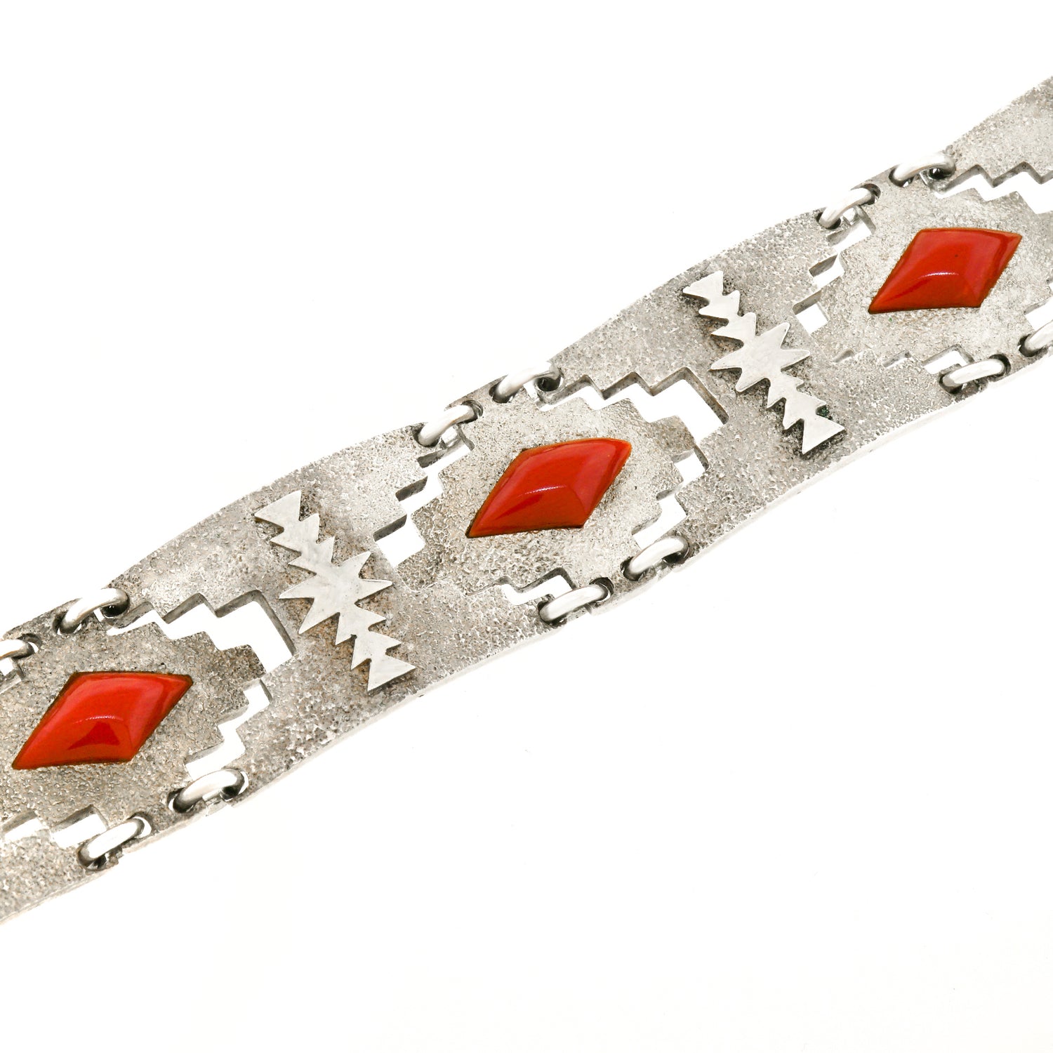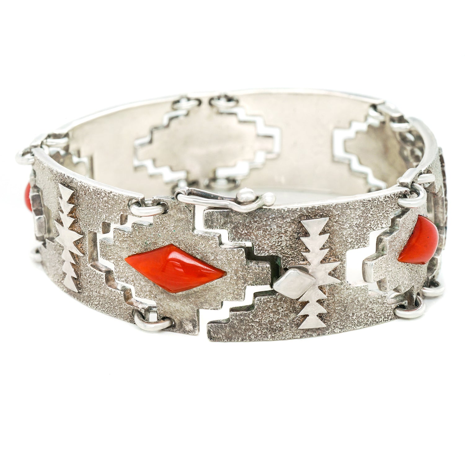 Circa 1990s, Sterling, by Harvey Begay, Navajo. This unusual coral-set sterling bracelet is Western American style at its Navajo best. Harvey Begay, part of the storied Begay family of silversmiths, is an award-winning artist whose work is sought after by collectors and museums alike. This example of his work effortlessly blends traditional motifs with modernist sensibilities. Excellent condition.