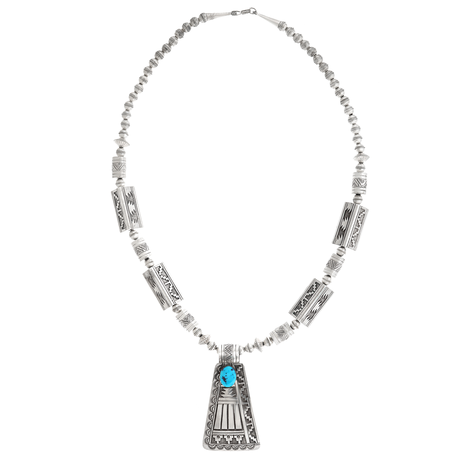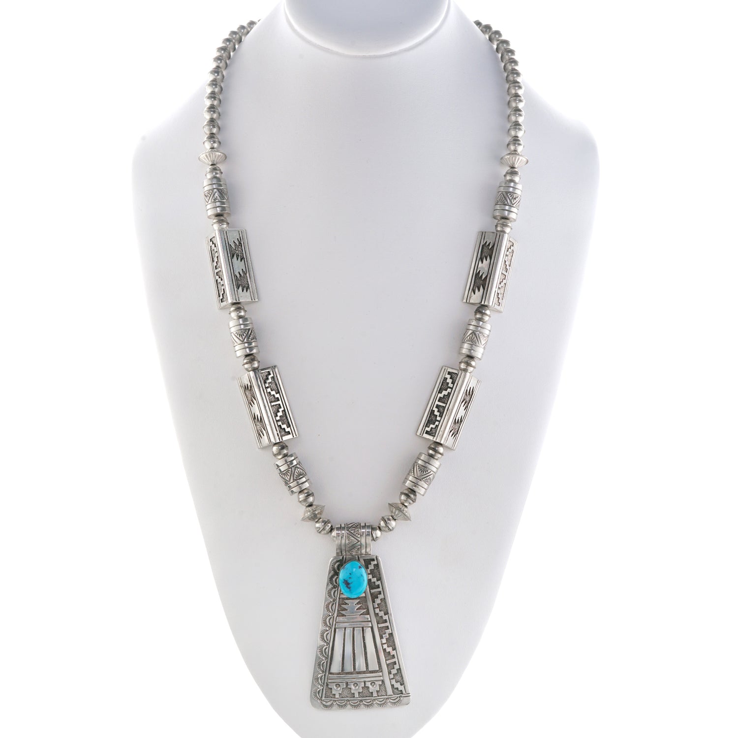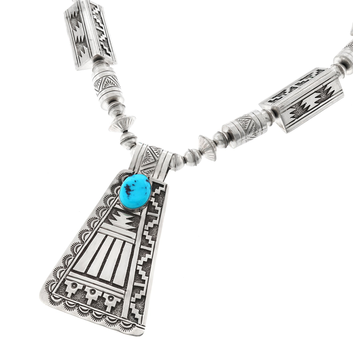 Circa 1970-80s, Sterling Silver, by R. WYLIE, Navajo. Brilliantly modern, this sterling necklace by Navajos silversmith R. Wylie, features a turquoise-set abstract thunderbird pendant. Completing the visual narrative, the traditional smaller silver beads beautifully underscore the look of the spectacular larger modernist geometric beads. Completely handmade, it is in excellent condition.
