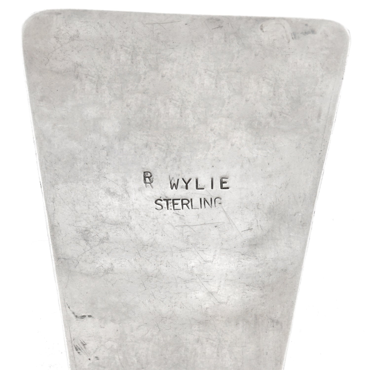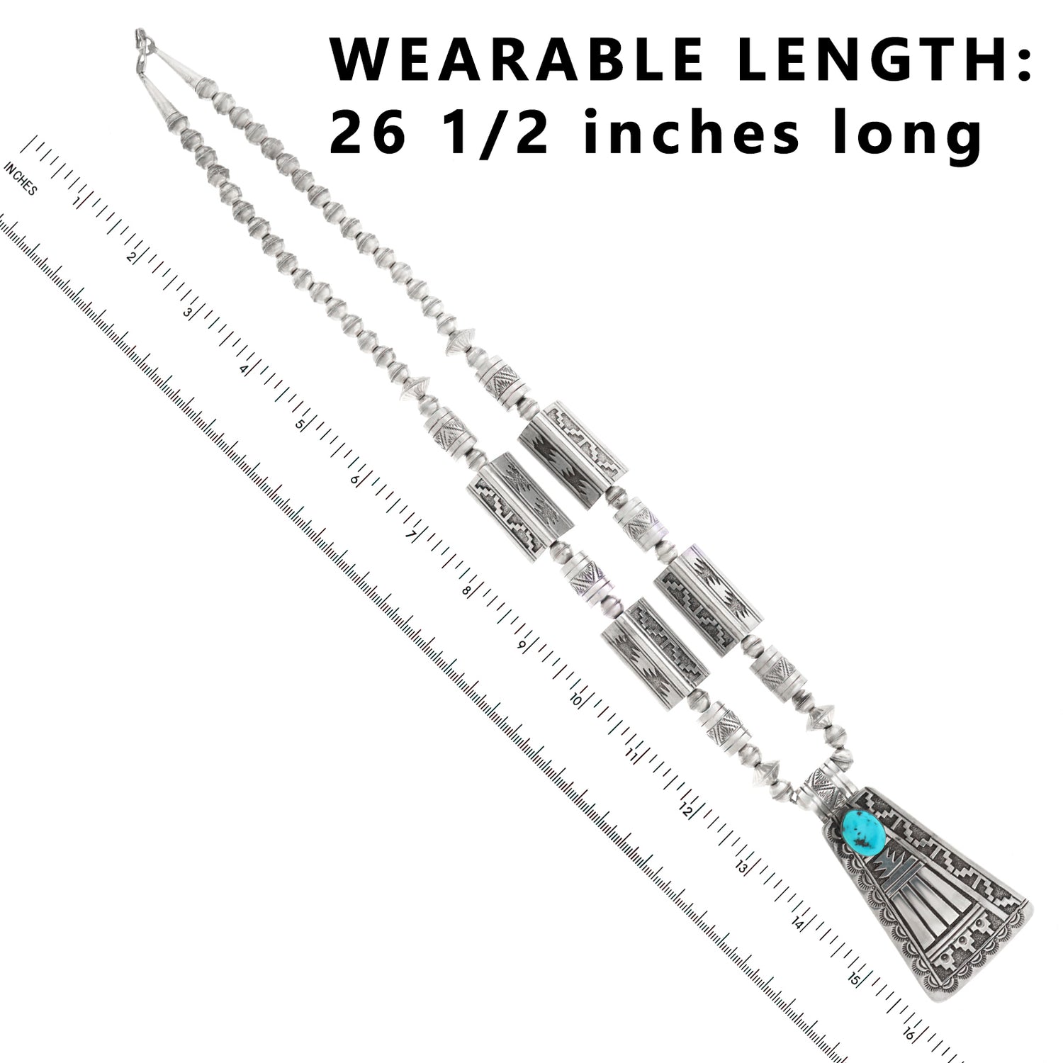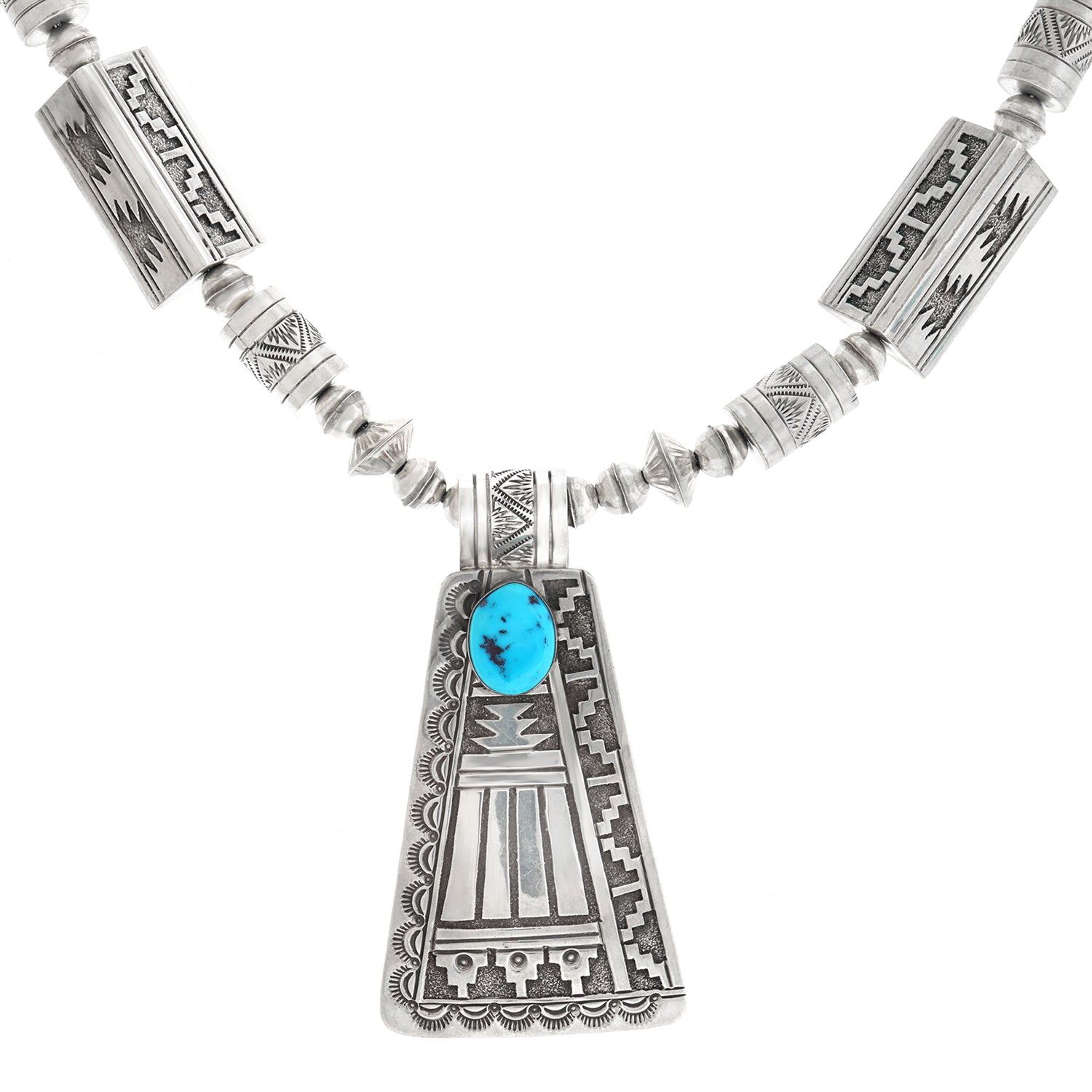 Circa 1970-80s, Sterling Silver, by R. WYLIE, Navajo. Brilliantly modern, this sterling necklace by Navajos silversmith R. Wylie, features a turquoise-set abstract thunderbird pendant. Completing the visual narrative, the traditional smaller silver beads beautifully underscore the look of the spectacular larger modernist geometric beads. Completely handmade, it is in excellent condition.