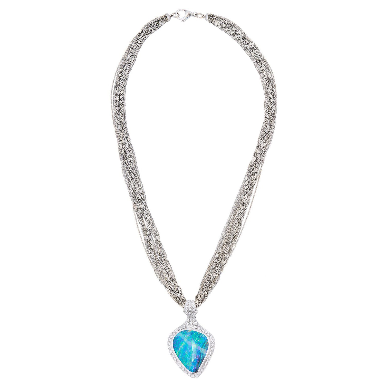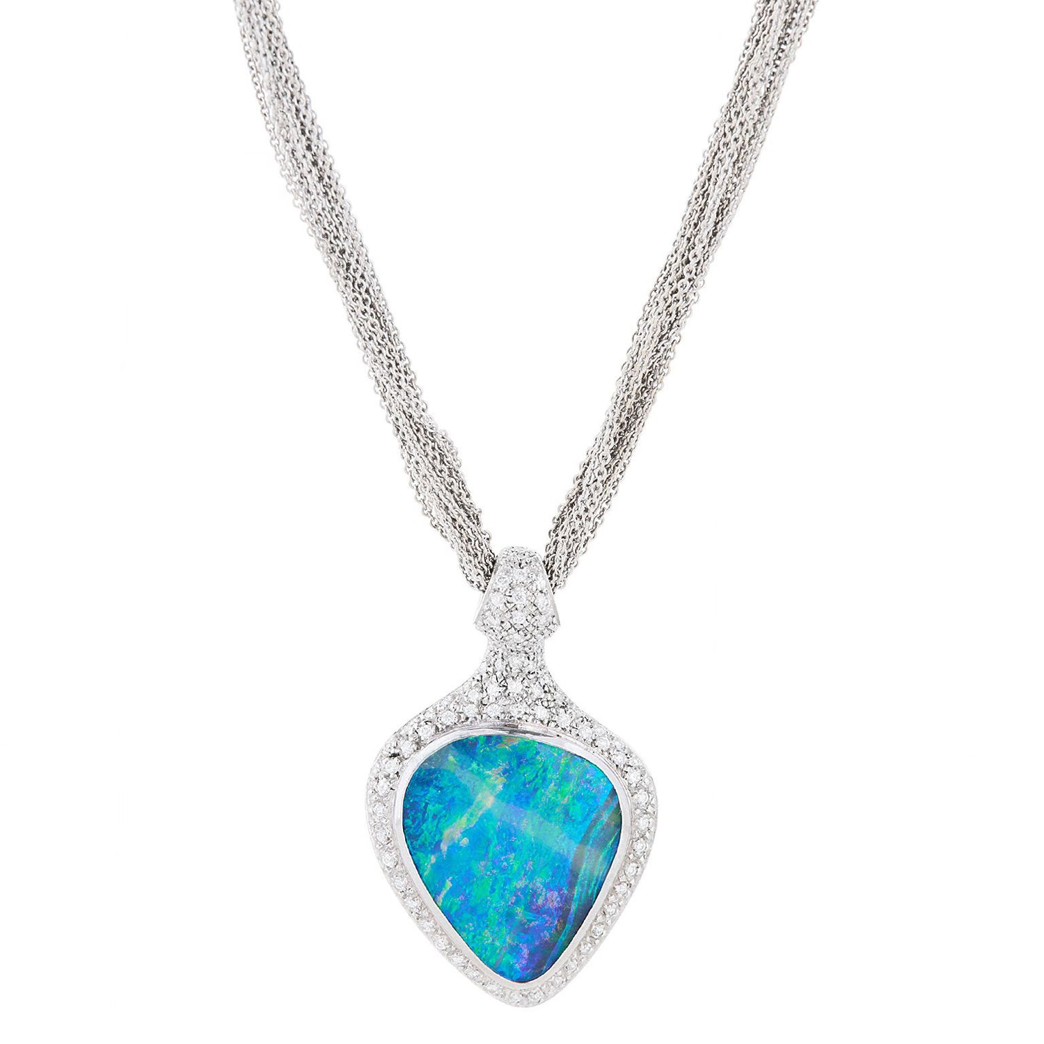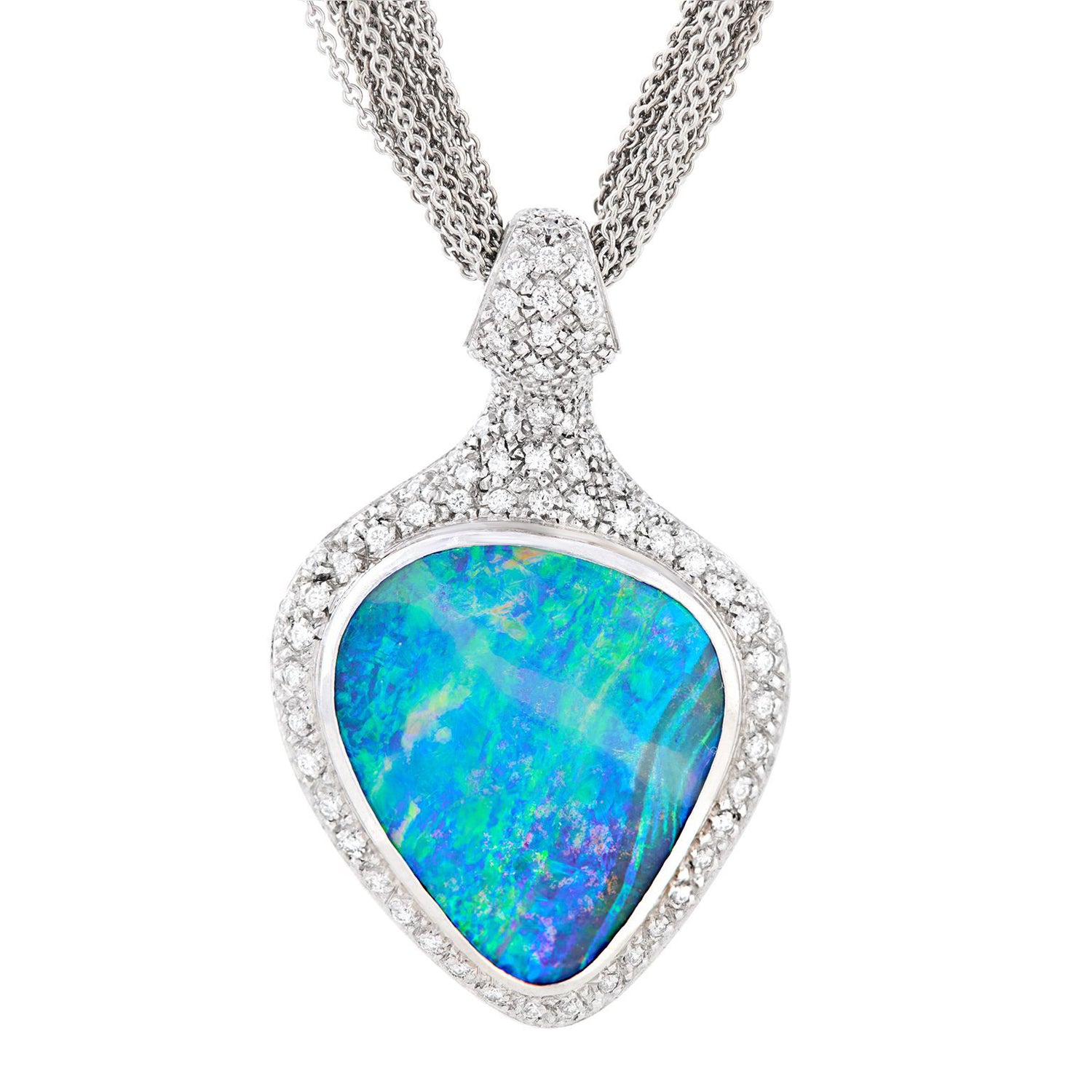 Circa 1980s, 18k, by Paul Binder, Zurich, Switzerland. This stunning modernist necklace by Paul Binder of Zurich, is set with a sublime Australian boulder opal surrounded by brilliant white diamonds. The look is Art becomes fashion, a triumph of Post Modern design. Known for signature blue colors, the opal is lightning ridge material. This one is a gorgeous mix of Mediterranean blues and features a very distinctive band of lighter color …extremely unusual. Binder was famous for breakthrough contemporary styling and his dedication to producing only one-of-a-kind works. His pieces are sought after by collectors and museums alike. Excellent condition.