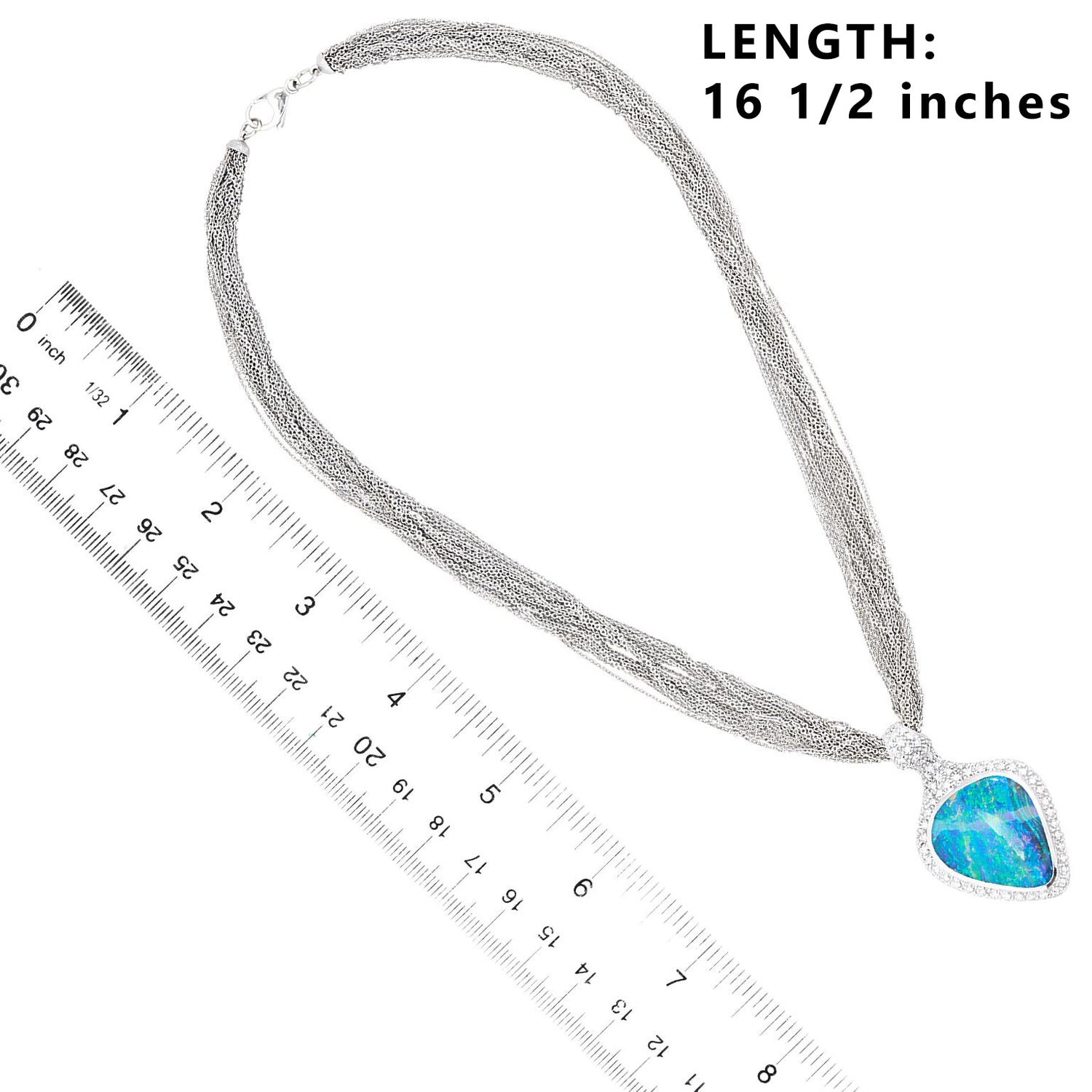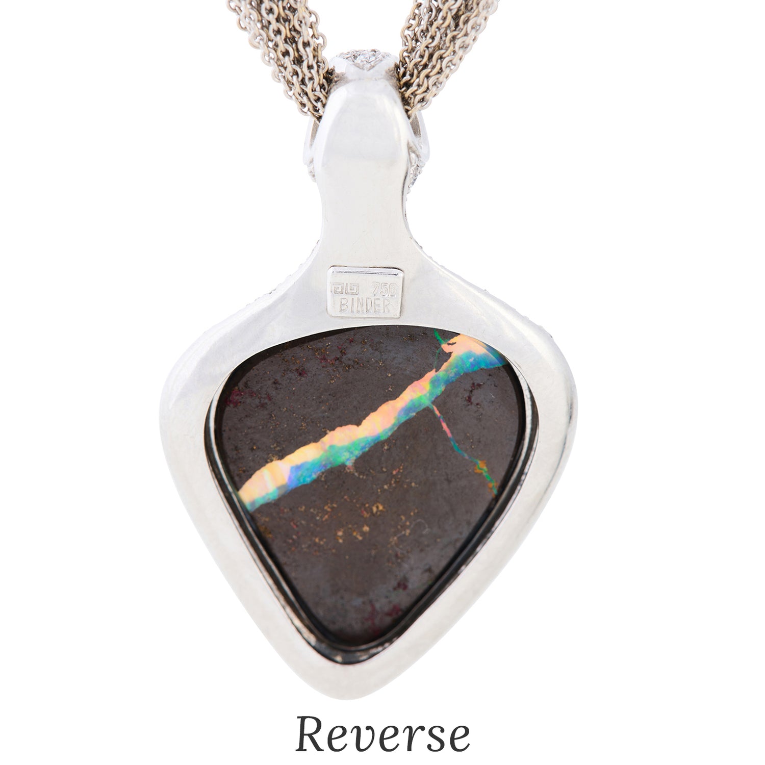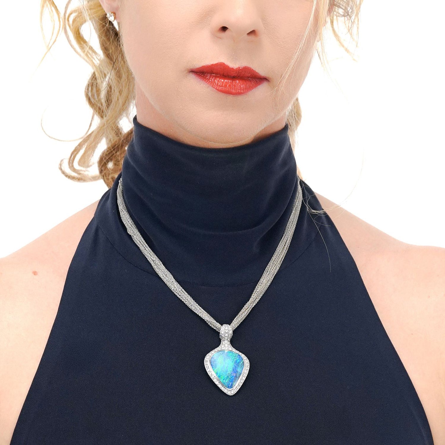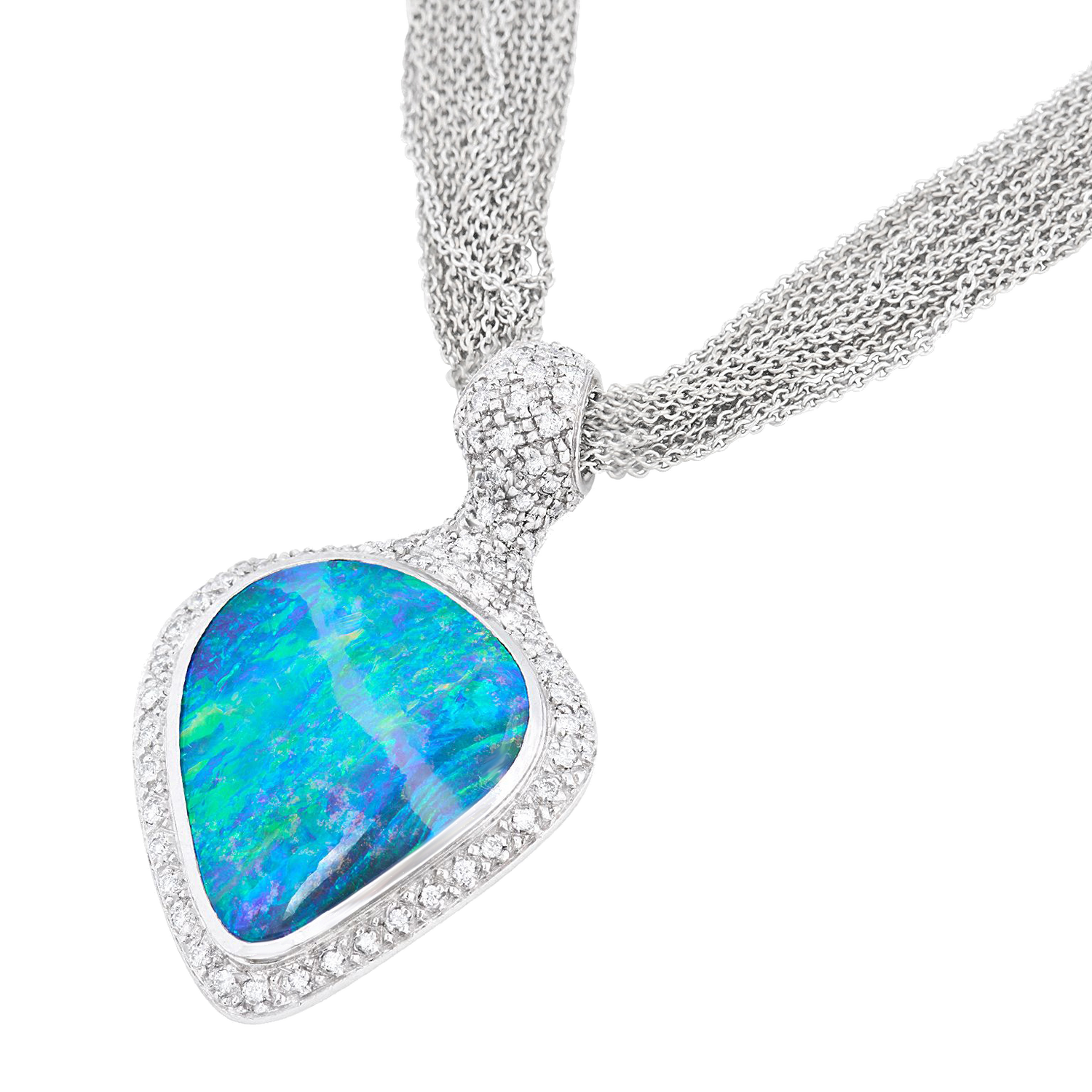 Circa 1980s, 18k, by Paul Binder, Zurich, Switzerland. This stunning modernist necklace by Paul Binder of Zurich, is set with a sublime Australian boulder opal surrounded by brilliant white diamonds. The look is Art becomes fashion, a triumph of Post Modern design. Known for signature blue colors, the opal is lightning ridge material. This one is a gorgeous mix of Mediterranean blues and features a very distinctive band of lighter color …extremely unusual. Binder was famous for breakthrough contemporary styling and his dedication to producing only one-of-a-kind works. His pieces are sought after by collectors and museums alike. Excellent condition.