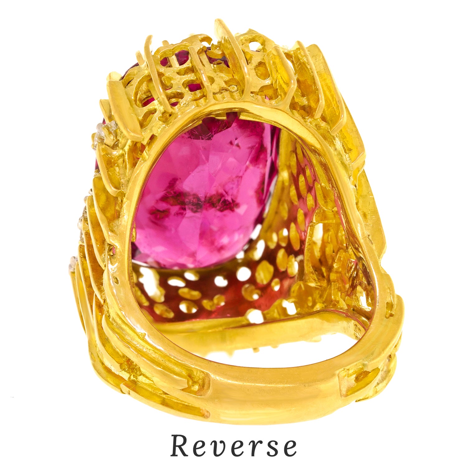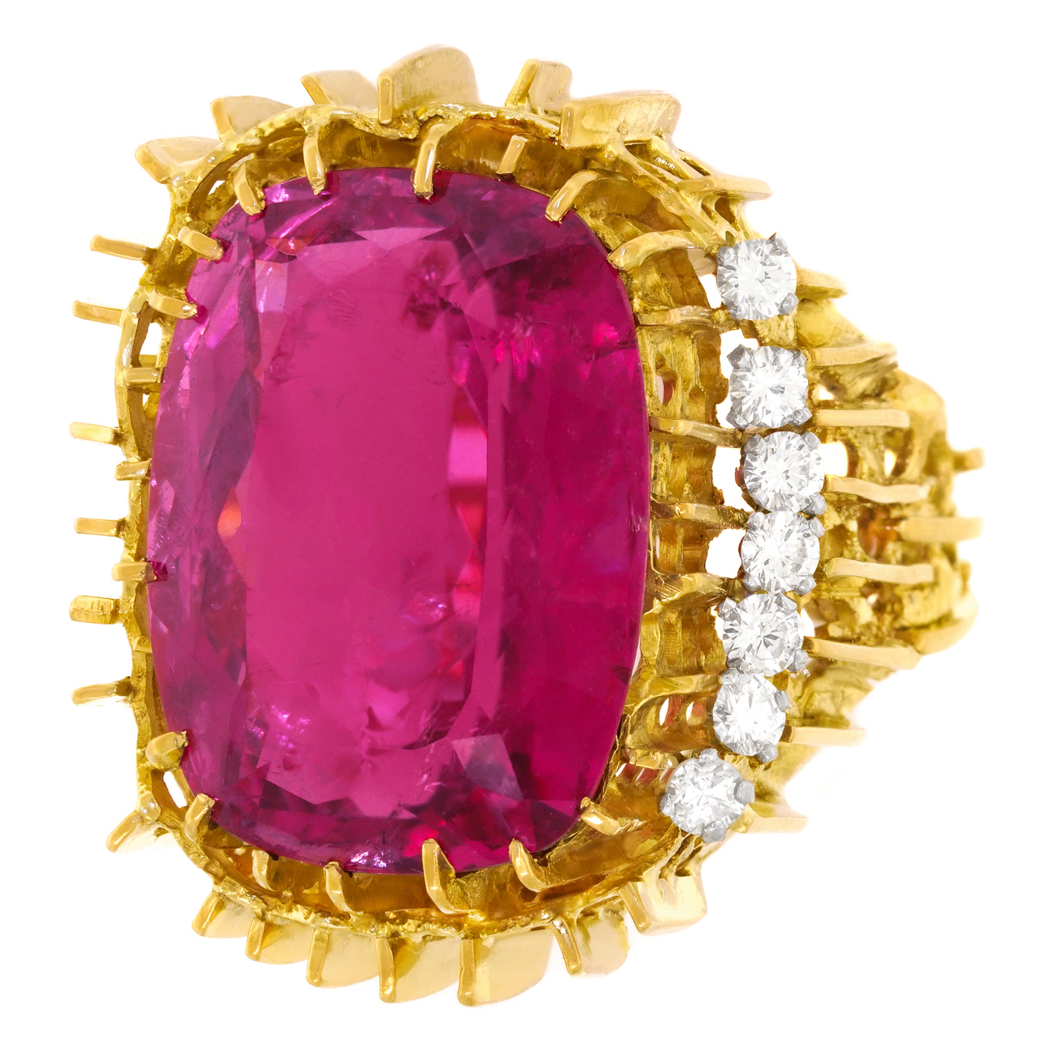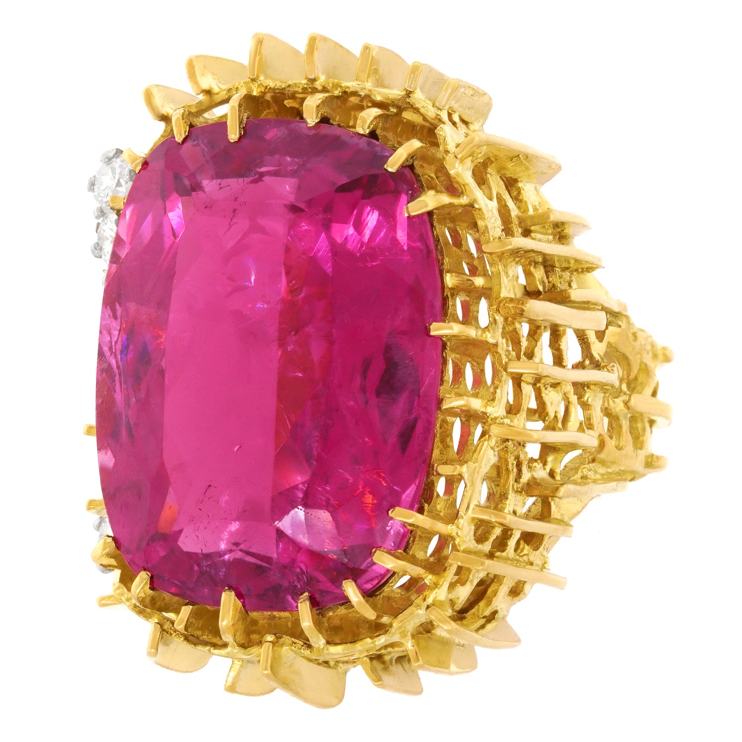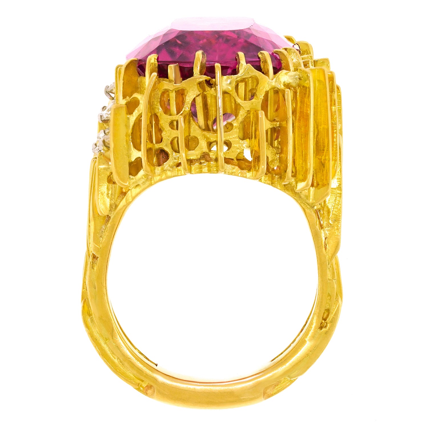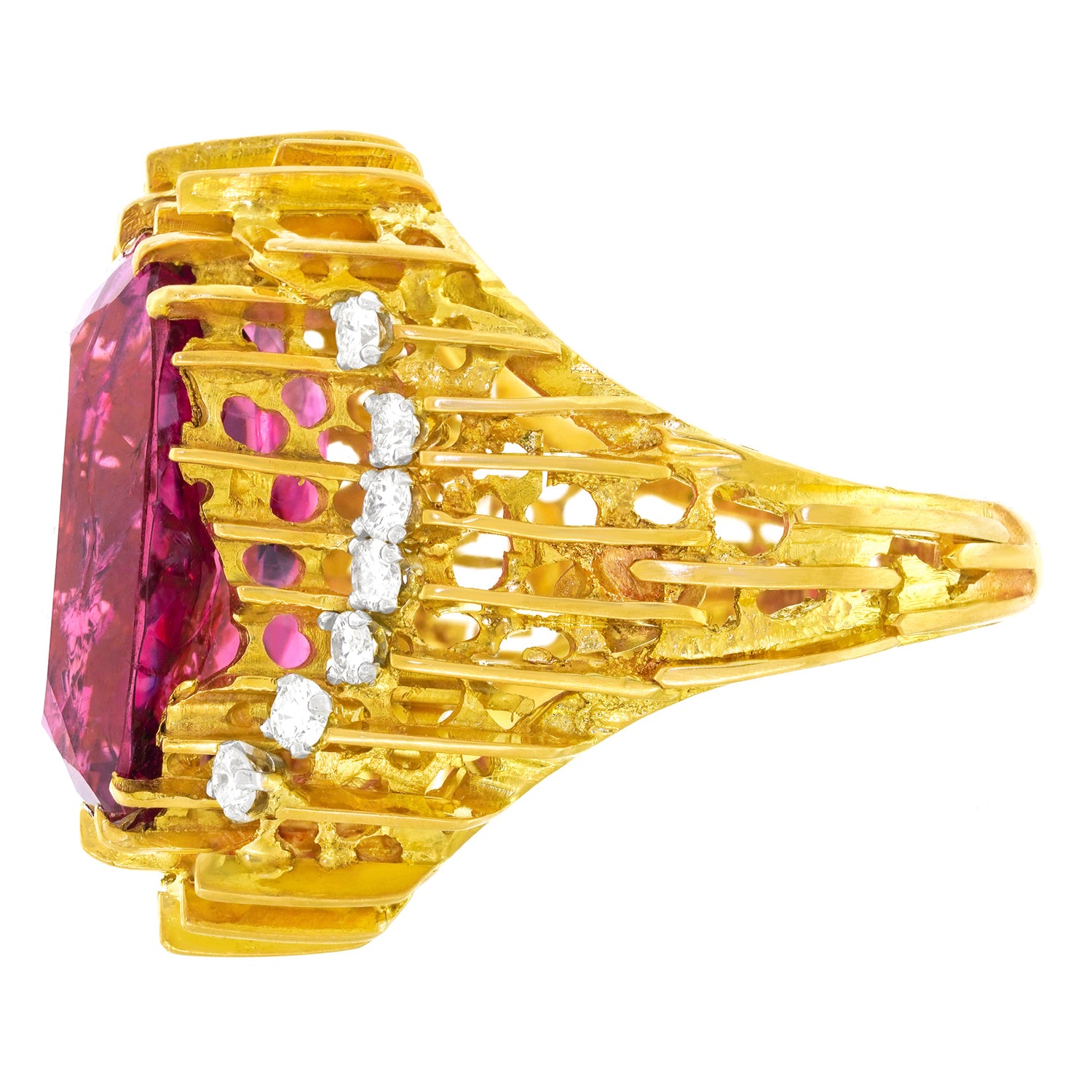 Circa 1968, 18k, by Ernest A. Blyth, London.  This dazzling modernist ring features a luscious raspberry-hued 22.0-carat tourmaline in a meticulously detailed brutalist landscape. The highly dimensional textured surface is juxtaposed with sparkling white diamonds. The look is one-of-a-kind, sixties fashion … Fresh, raw, sculptural, psychedelic! Ernest Blyth was one of the most important British goldsmiths working in the modernist idiom. This ring is perhaps his finest work. Meticulously fabricated, it is in excellent condition.