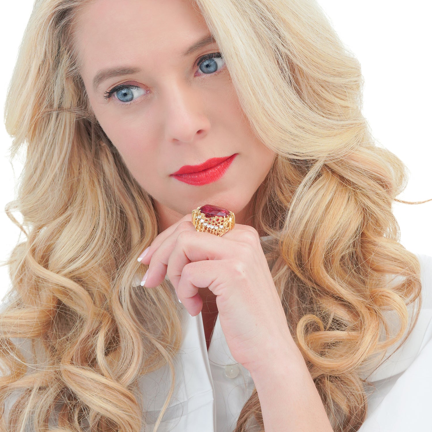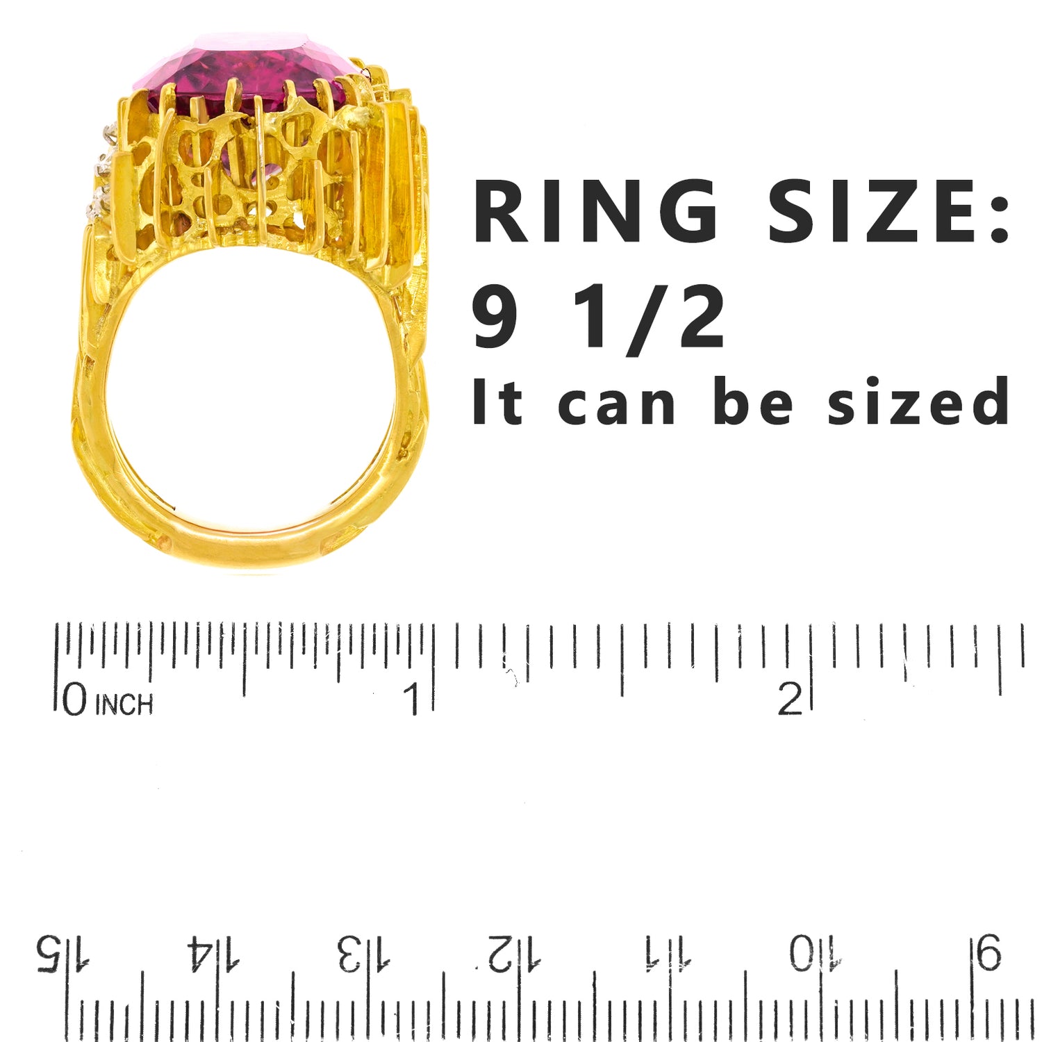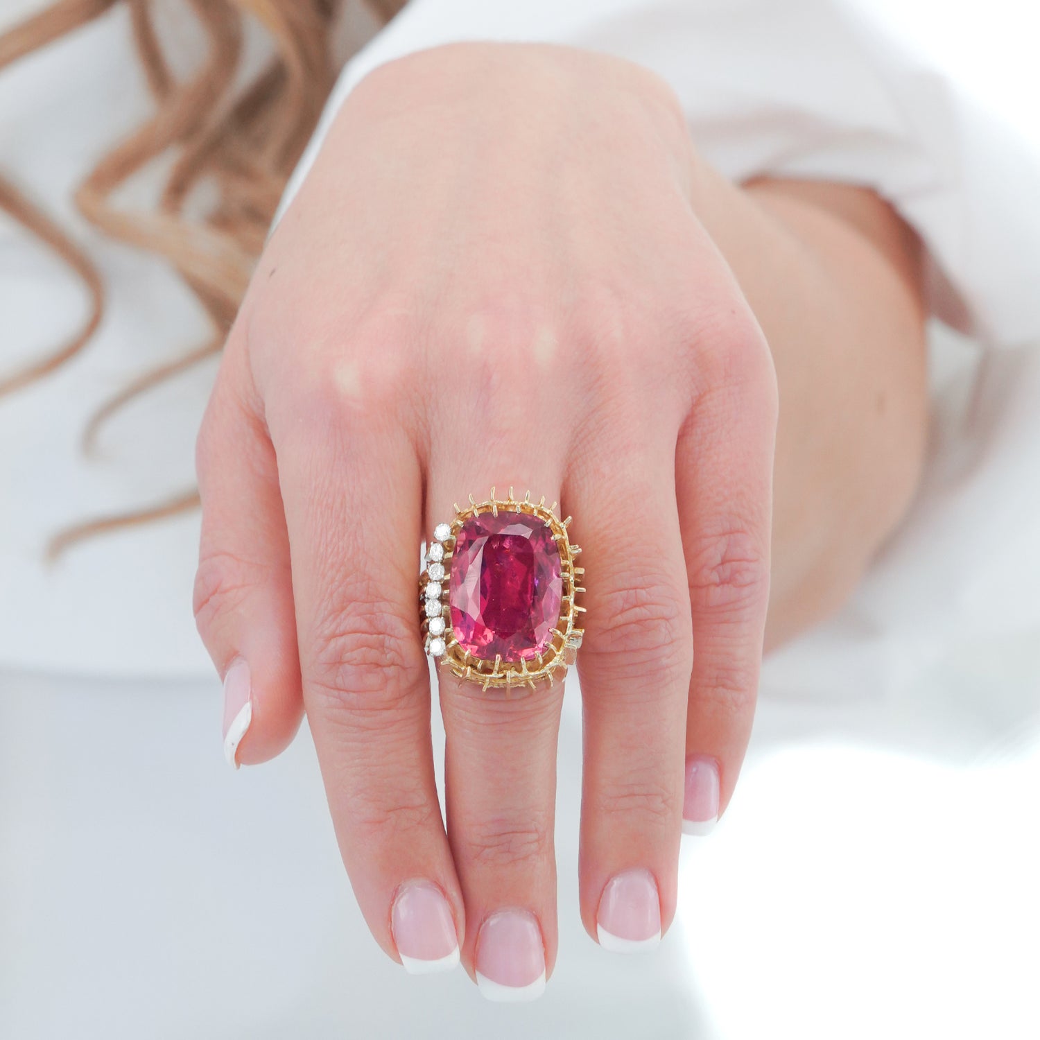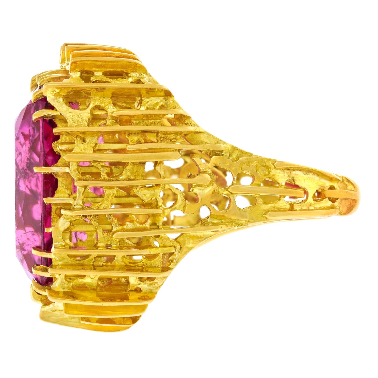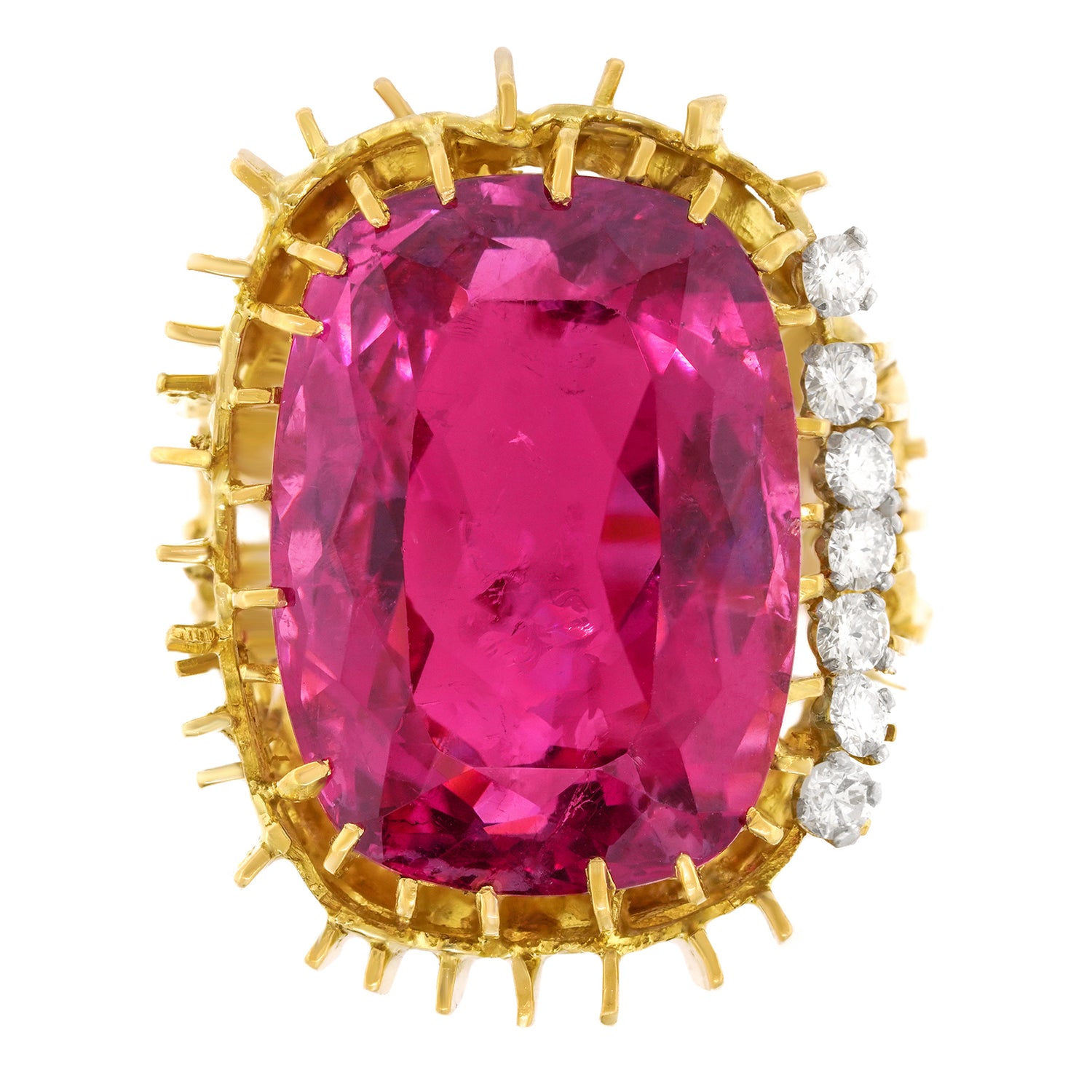 Circa 1968, 18k, by Ernest A. Blyth, London.  This dazzling modernist ring features a luscious raspberry-hued 22.0-carat tourmaline in a meticulously detailed brutalist landscape. The highly dimensional textured surface is juxtaposed with sparkling white diamonds. The look is one-of-a-kind, sixties fashion … Fresh, raw, sculptural, psychedelic! Ernest Blyth was one of the most important British goldsmiths working in the modernist idiom. This ring is perhaps his finest work. Meticulously fabricated, it is in excellent condition.