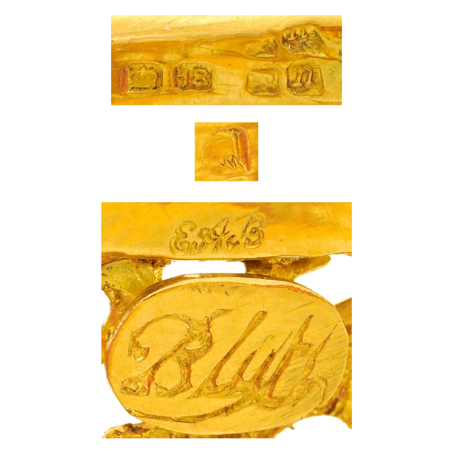 Hallmarks: BLYTH in script on a plaque, EAB for Ernest A. Blyth, English hallmarks: Crown guarantee for gold, 18 for 18k, leopard's head for London, and date letter N for 1968.